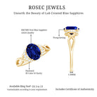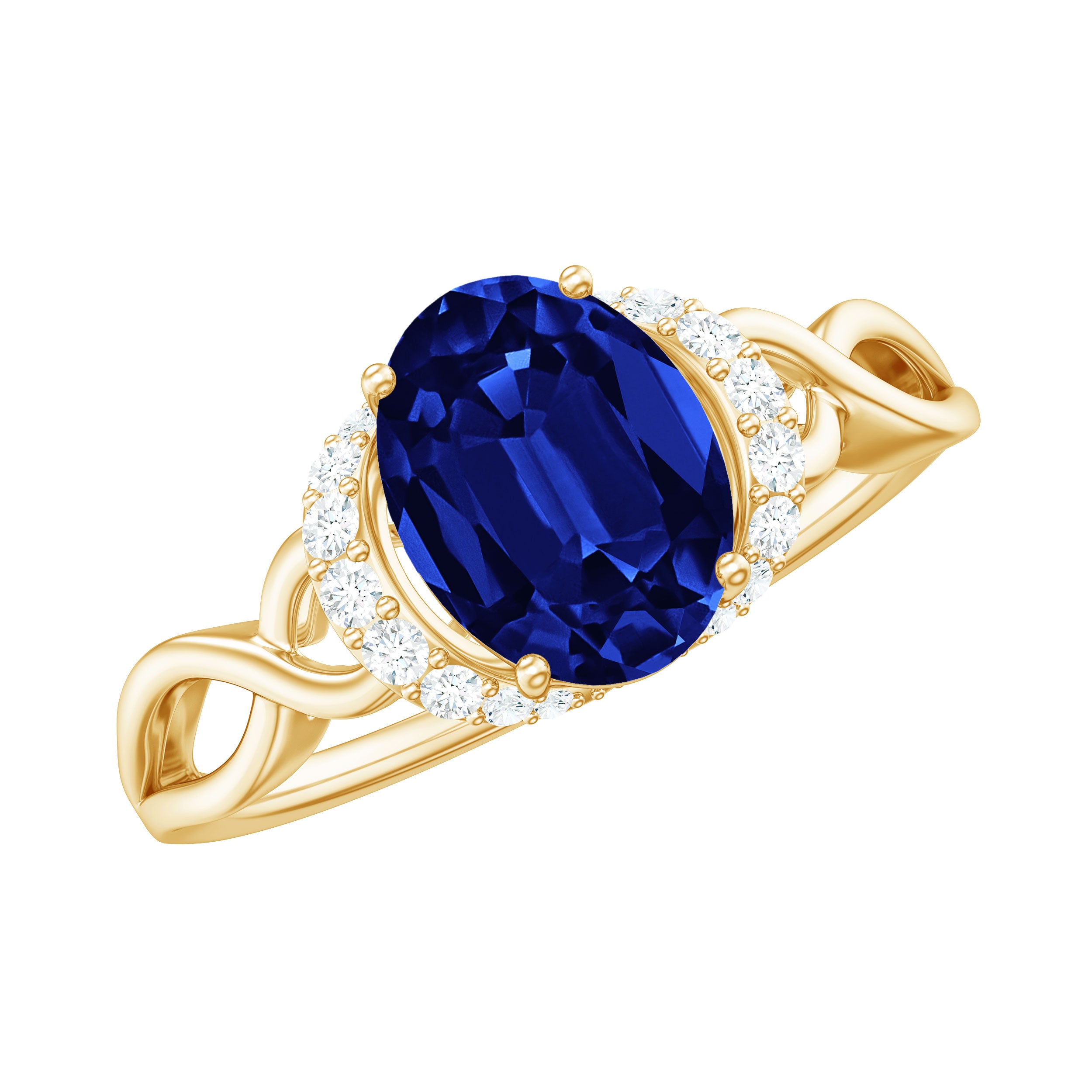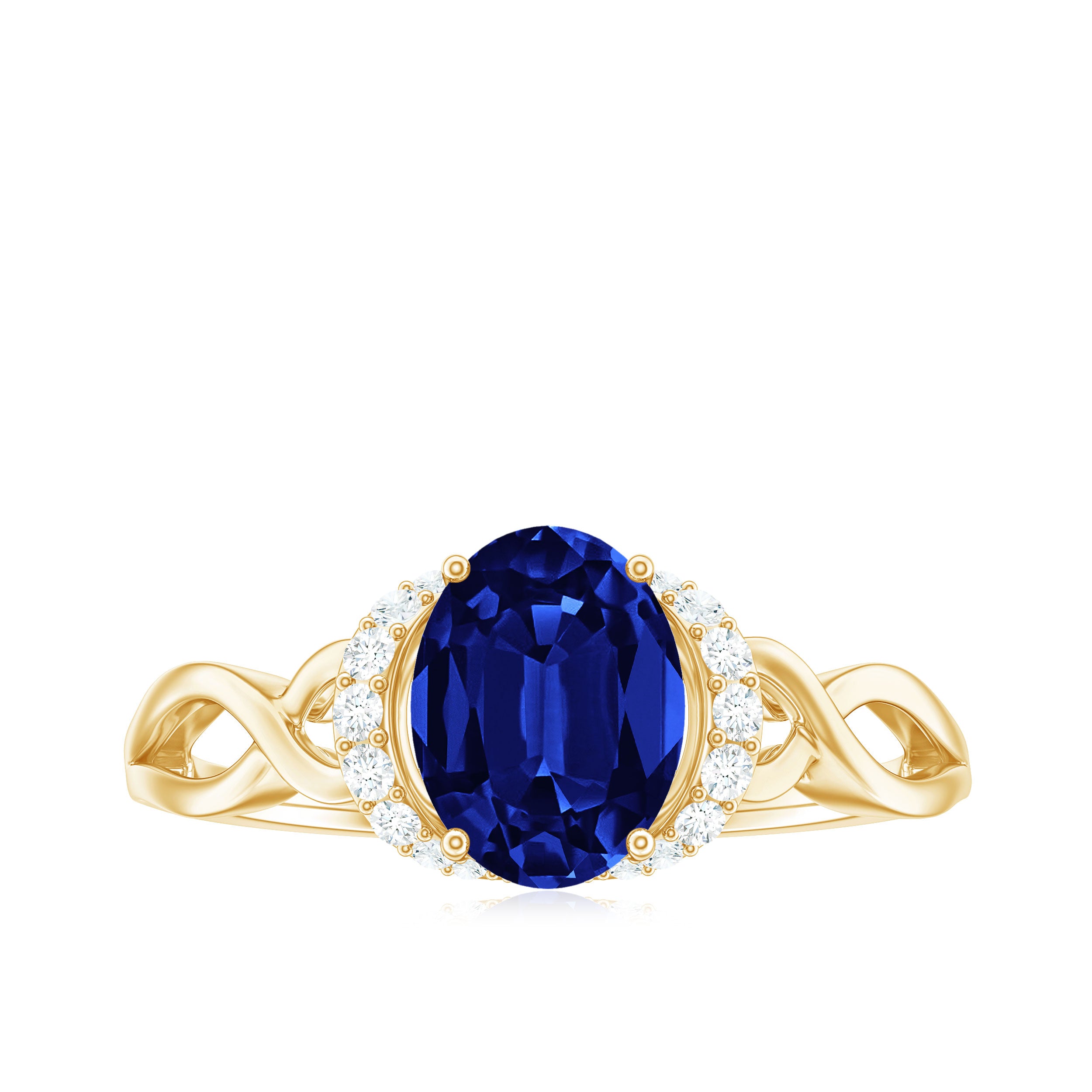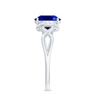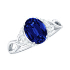Intriguing and captivating, this solitaire ring features an oval cut lab created blue sapphire securely cradled in a prong setting. A collar adorned with sparkling diamonds elegantly encircles the opulent created sapphire in the crossover shank, enhancing its mesmerizing opalescent radiance. The enchanting aura of the sapphire harmonizes seamlessly with the unparalleled brilliance of the diamonds, resulting in a genuinely unique solitaire ring that is sure to leave a lasting impression.