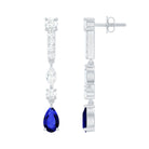 These Lab Grown Sapphire Earrings are handcrafted with 14K White Gold Plated Silver for your special look. The earring features a 4X6 MM Pear Shape Created Sapphire linked with Marquise and Round Shape Moissanite. These Long Earrings hold the classic shine of AAAA Quality Synthetic Blue Sapphire and D-VS1 Quality Moissanite securely placed in Prong Setting. These Earrings with Screw on Backs stays on place throughout the day. These Drop Earrings will be delivered to you in a velvet pouch with a certificate of authenticity.