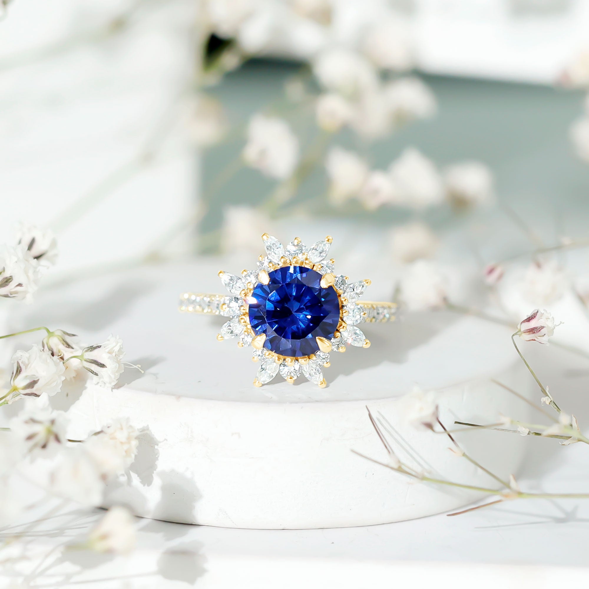 Transform your look into a diva when you wear this Blue Sapphire ring, designed just the way you wanted. The 8 mm round Lab Grown blue sapphire exquisitely set in claw setting surrounded by marquise and round moissanite as a halo. For an additional touch of sparkle the shank shimmers with moissanite making this sapphire ring a treasure piece. The blue sapphire ring also makes a perfect accessory for cocktail parties, date nights, evening parties or other special occasion as it matches a variety of style.
