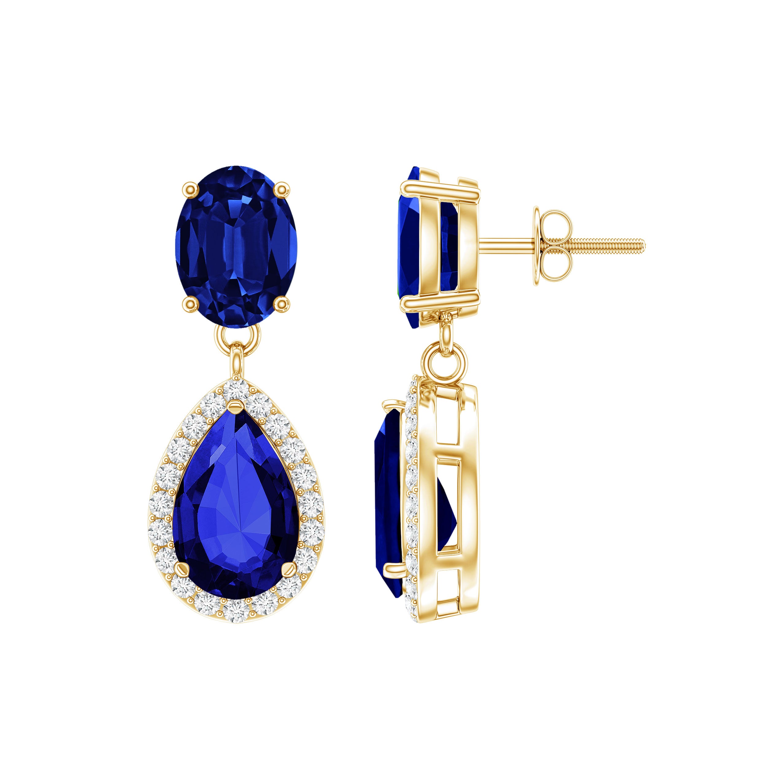 Mark your wedding day with our stunning Bridal Drop Earrings, which feature a 6X8MM pear shaped lab created blue sapphire set in prong setting, surrounded by sparkling moissanite halo. At the top, a 5X7MM oval shaped lab created blue sapphire adds extra elegance and a luxurious feel. The combination of the deep blue sapphires and sparkling moissanite creates a stunning contrast, making the Dangle Drop Earrings shine beautifully from every angle. These Teardrop Earrings are made with AAAA quality lab created blue sapphires and D-VS1 quality moissanites, ensuring bright, clear, and durable stones. They are ethical and eco-friendly, giving you the beauty of natural gemstones without any compromise. The elegant drop design makes them perfect for weddings, parties, or other special events. Simple yet luxurious, they are the kind of earrings that add sparkle and timeless elegance to every outfit. With their classic design and striking color, these Blue Sapphire Earrings are a perfect addition to any jewelry collection, symbolizing beauty and elegance.