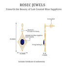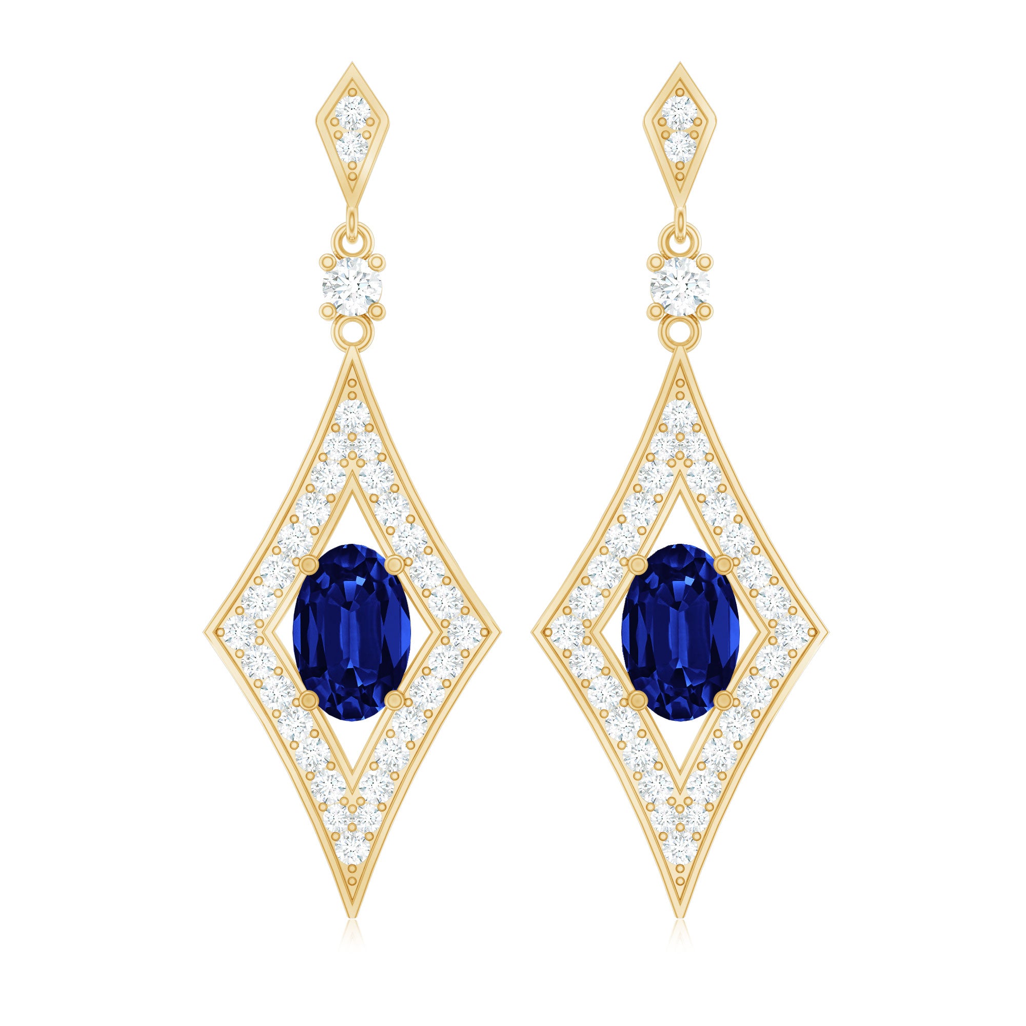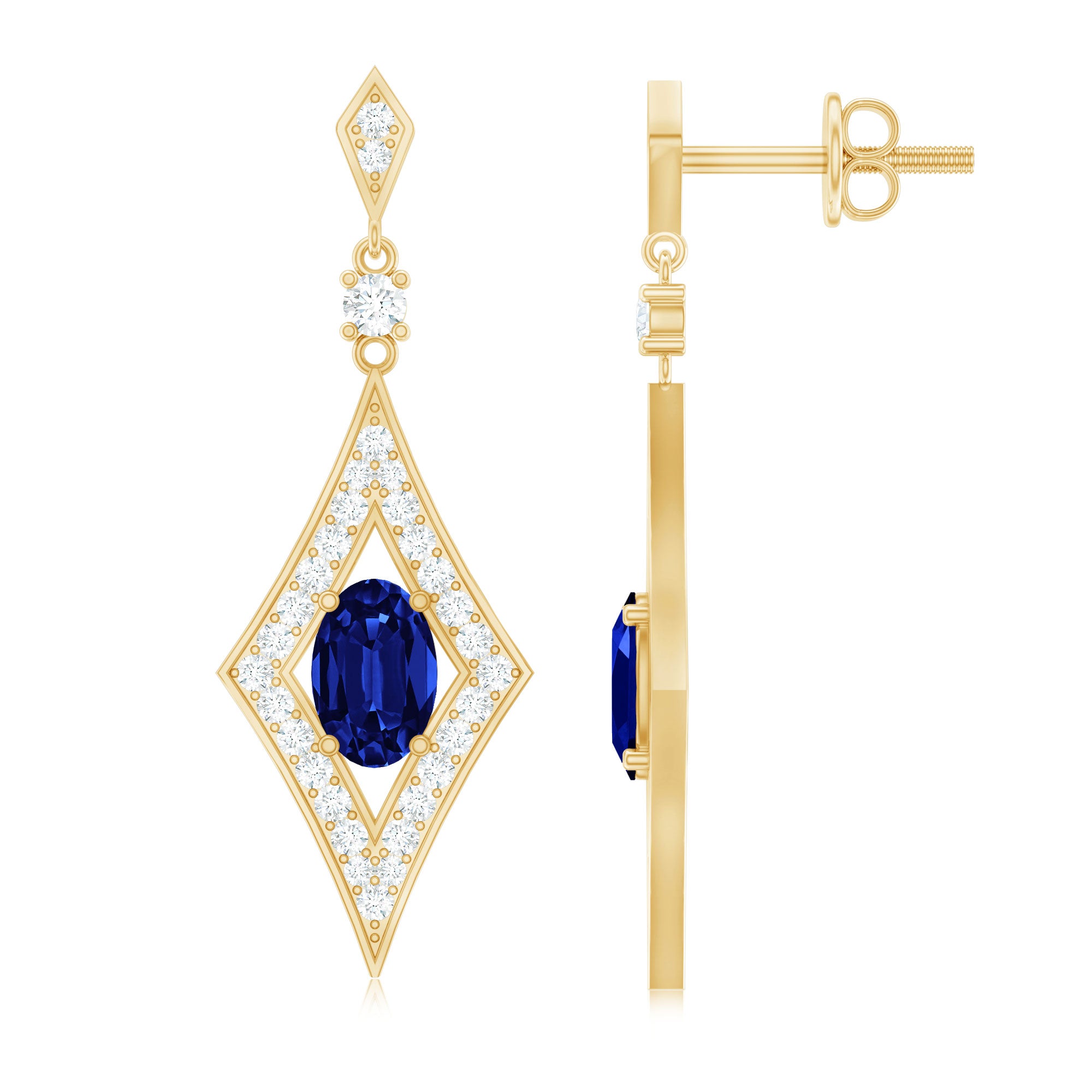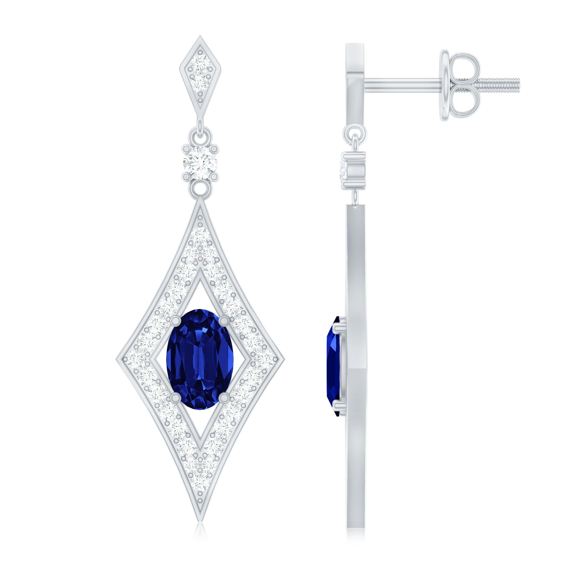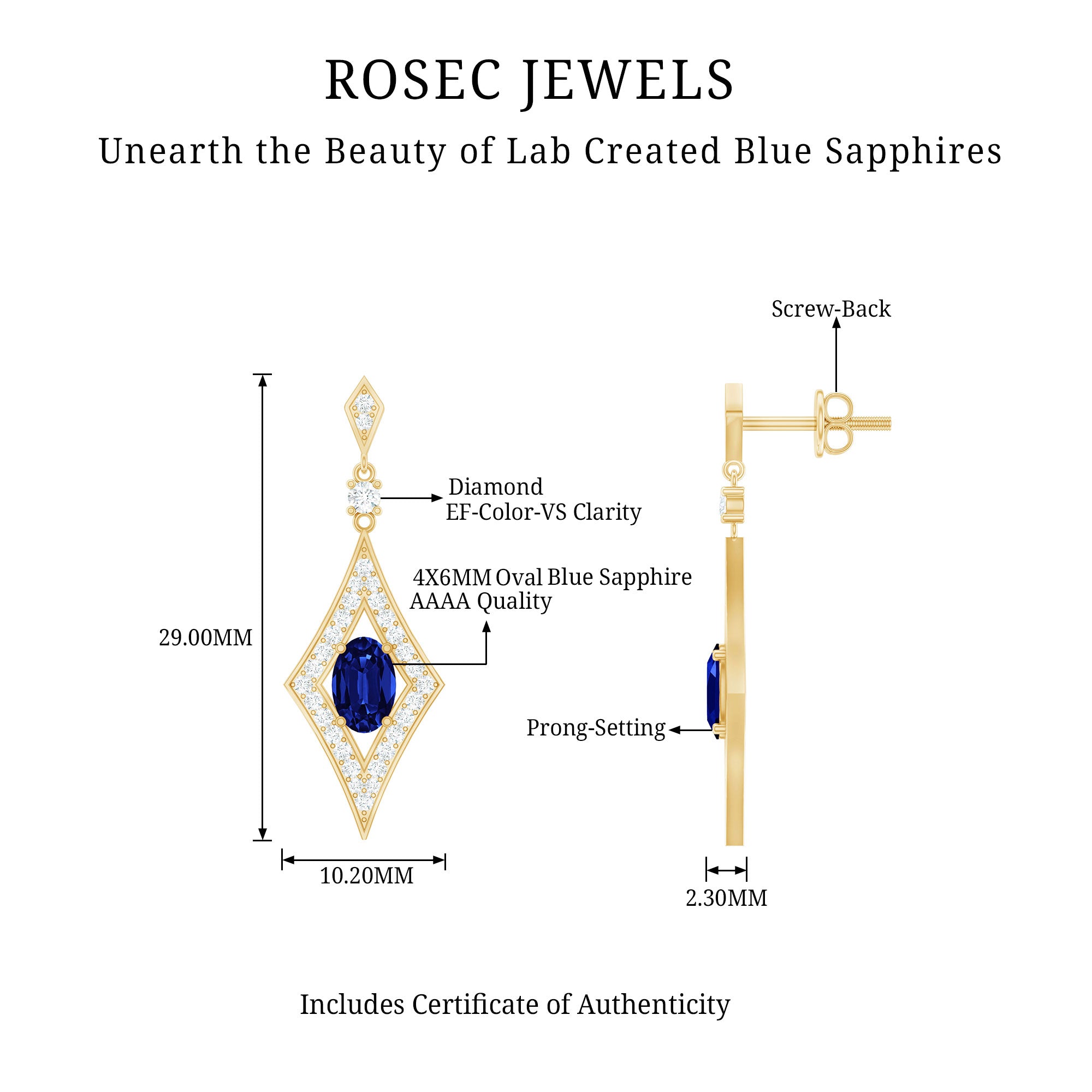 Grace your ears with exquisite elegance by wearing these Dangle Earrings adorned with a 4x6 mm Oval Shape Blue Sapphire of Aaaa quality set as a center stone in a prong setting, highlighted by gleaming round shaped Lab Grown Diamonds on a rhombus shape. These Sapphire and Diamond Earrings are designed with screw back closure, offering both comfort and security, so you can wear them confidently without worrying about slipping off. Perfect as Bridal Earrings, they are a must-have accessory for your wedding jewelry collection. These Synthetic Blue Sapphire Earrings are a testament to the quality and craftsmanship synonymous with Rosec Jewels, where every piece is a masterpiece of beauty and innovation.