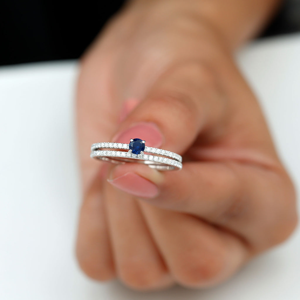 This Simple Engagement Ring is embellished with Round Lab Created Blue Sapphire and Round Diamond beautifully set on the Half Eternity Band. This Bridal Ring Set is composed in high quality metal. Give your loved ones a beautiful surprise on a special occasion.