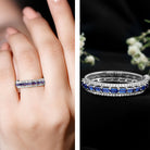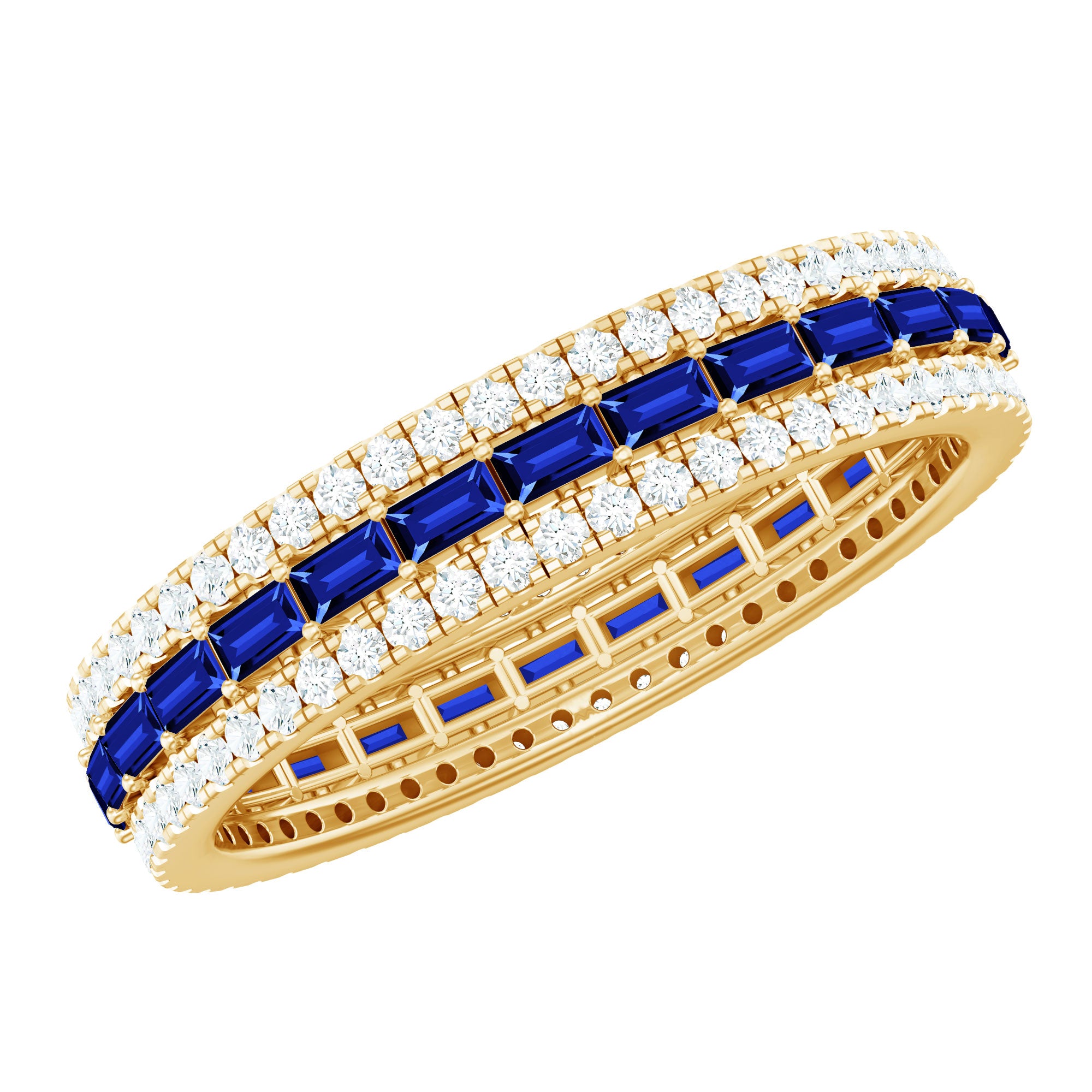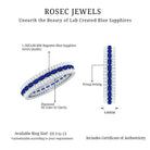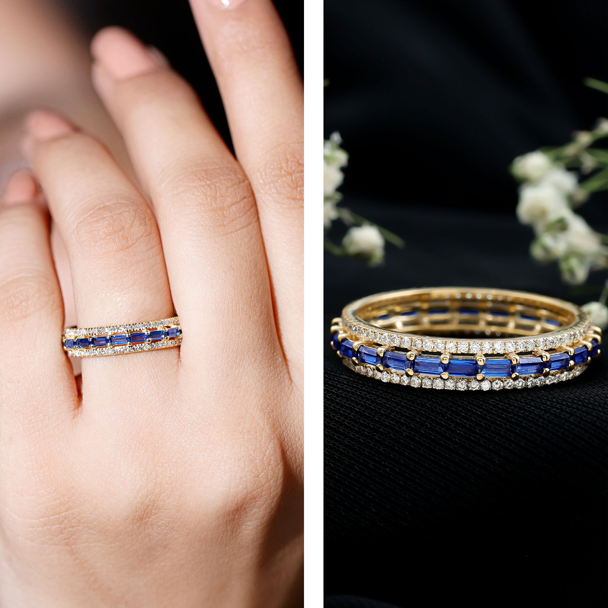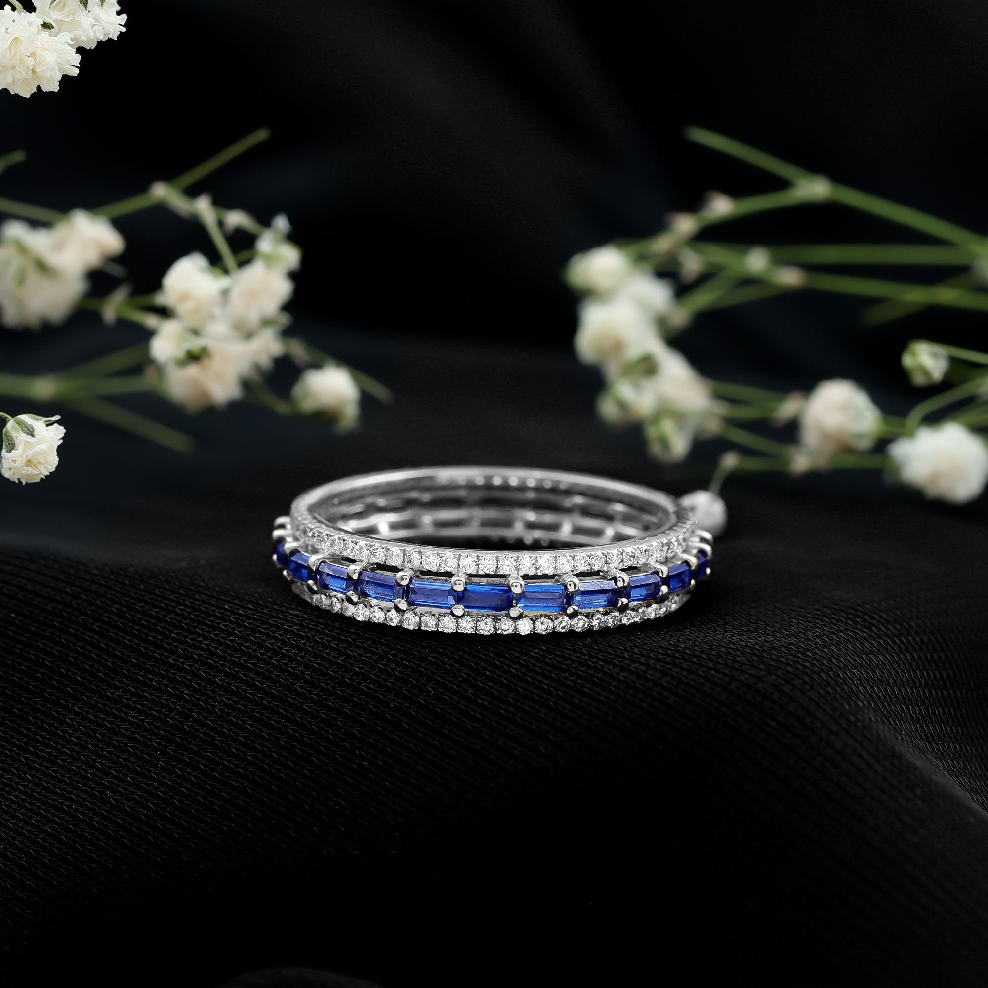 Unveil the beauty of modern romance with this Lab Blue Sapphire Ring, a masterpiece of craftsmanship and contemporary design that fuses rich color, intricate detail and timeless elegance that will captivate the sight of onlookers. Featuring Baguette Shaped Lab Blue Sapphire in East West stretches gracefully across the band. Add sparkle and contrast by radiating HI-SI Diamond without overpowering the beauty of the Baguette Eternity Band. Bold and sophisticated this Sapphire Wedding Band makes your forever shine brighter and redefines elegance where modern design meets beauty. The AAAA Lab Blue Sapphire Eternity Wedding Ring is crafted to stand the test of time.