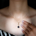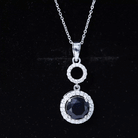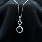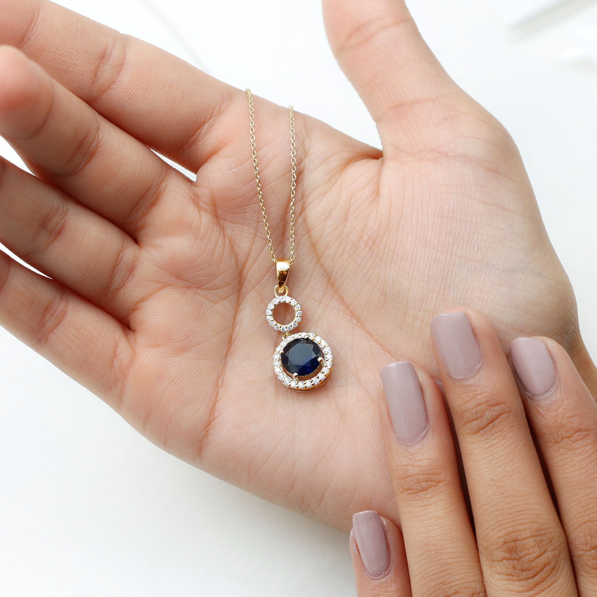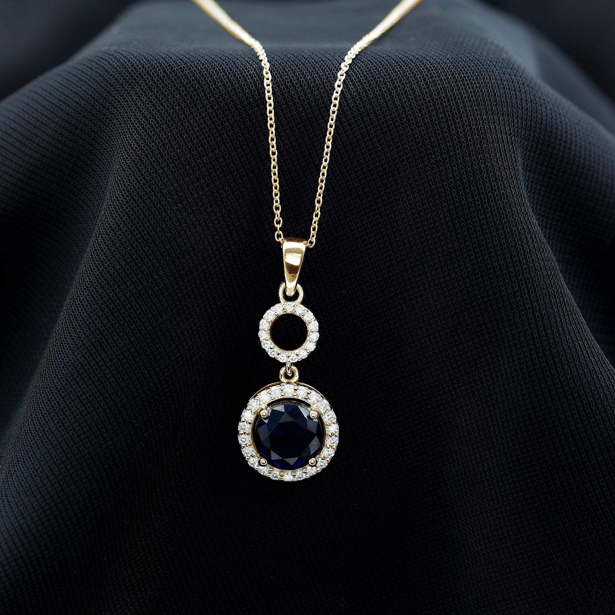This Lab Grown Blue Sapphire Pendant embrace the beauty. It features an 8 MM Round Shape Lab created blue sapphire nestled within a radiant moissanite halo. The claw setting gives it a modern and distinctive appearance. Adding to its allure, a circular frame studded with round moissanite is placed atop the created blue sapphire. The Circle Pendant Necklace is elegantly connected to a shiny metal bale, creating a seamless and polished look. Revel in the elegance and sophistication of this Halo Necklace that is sure to turn heads.