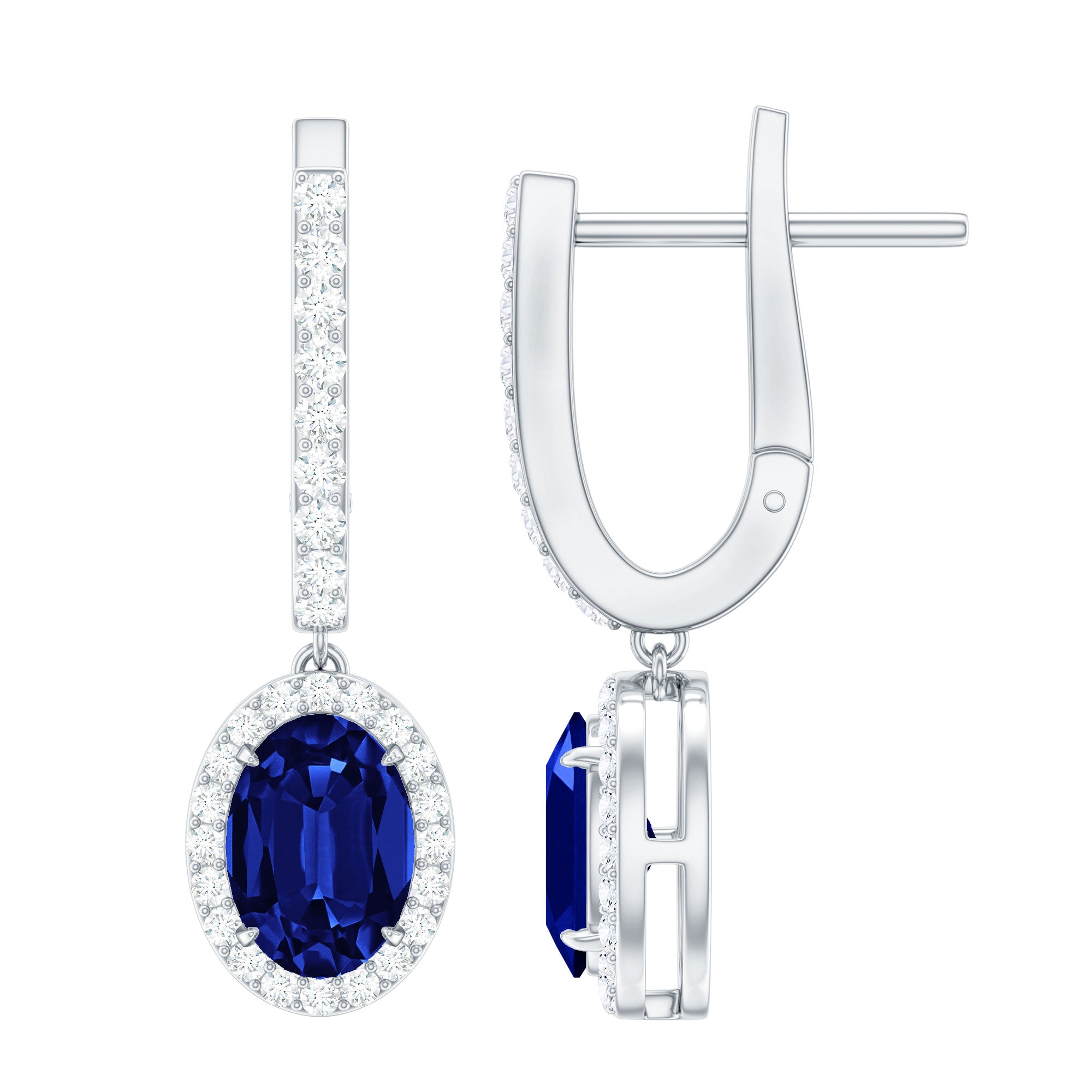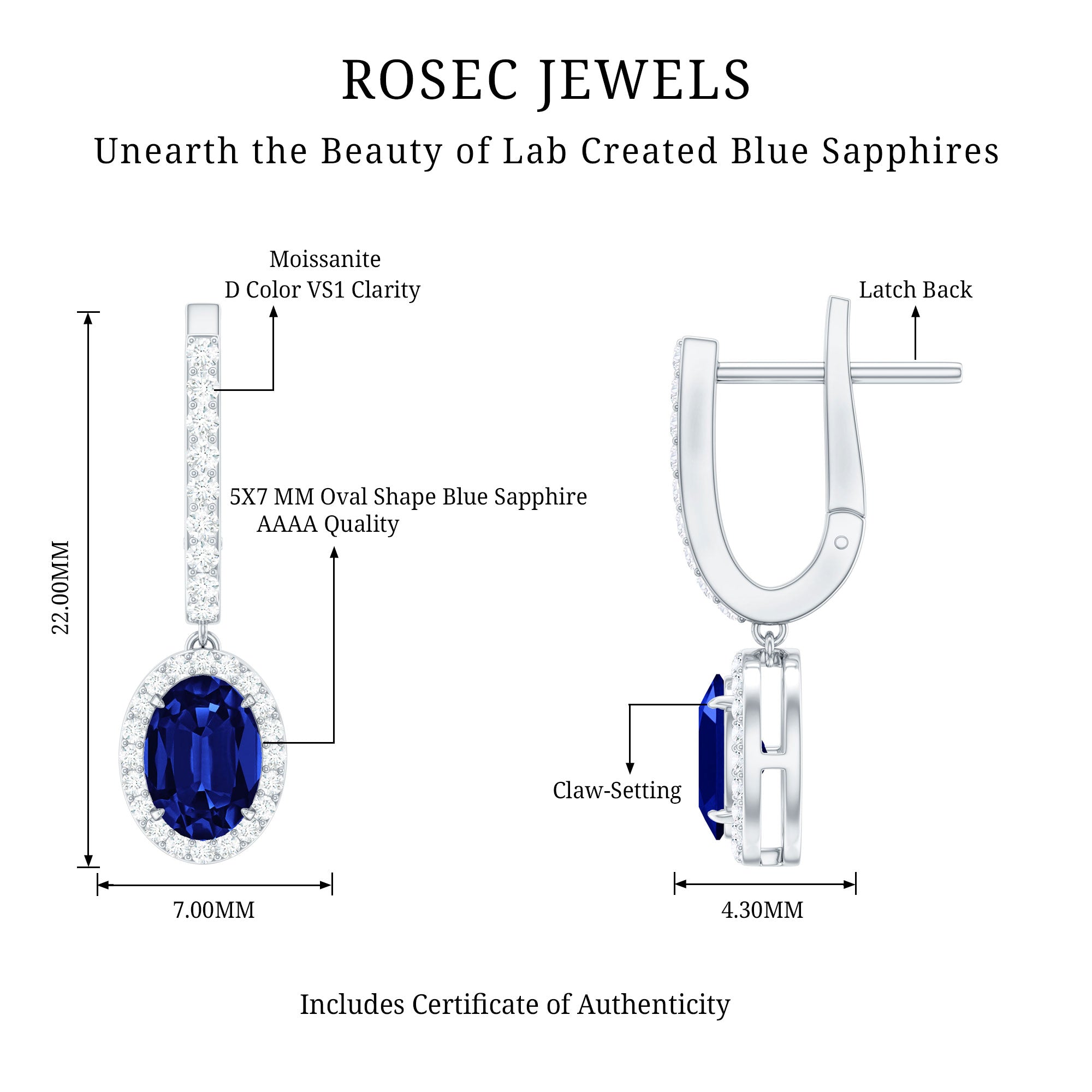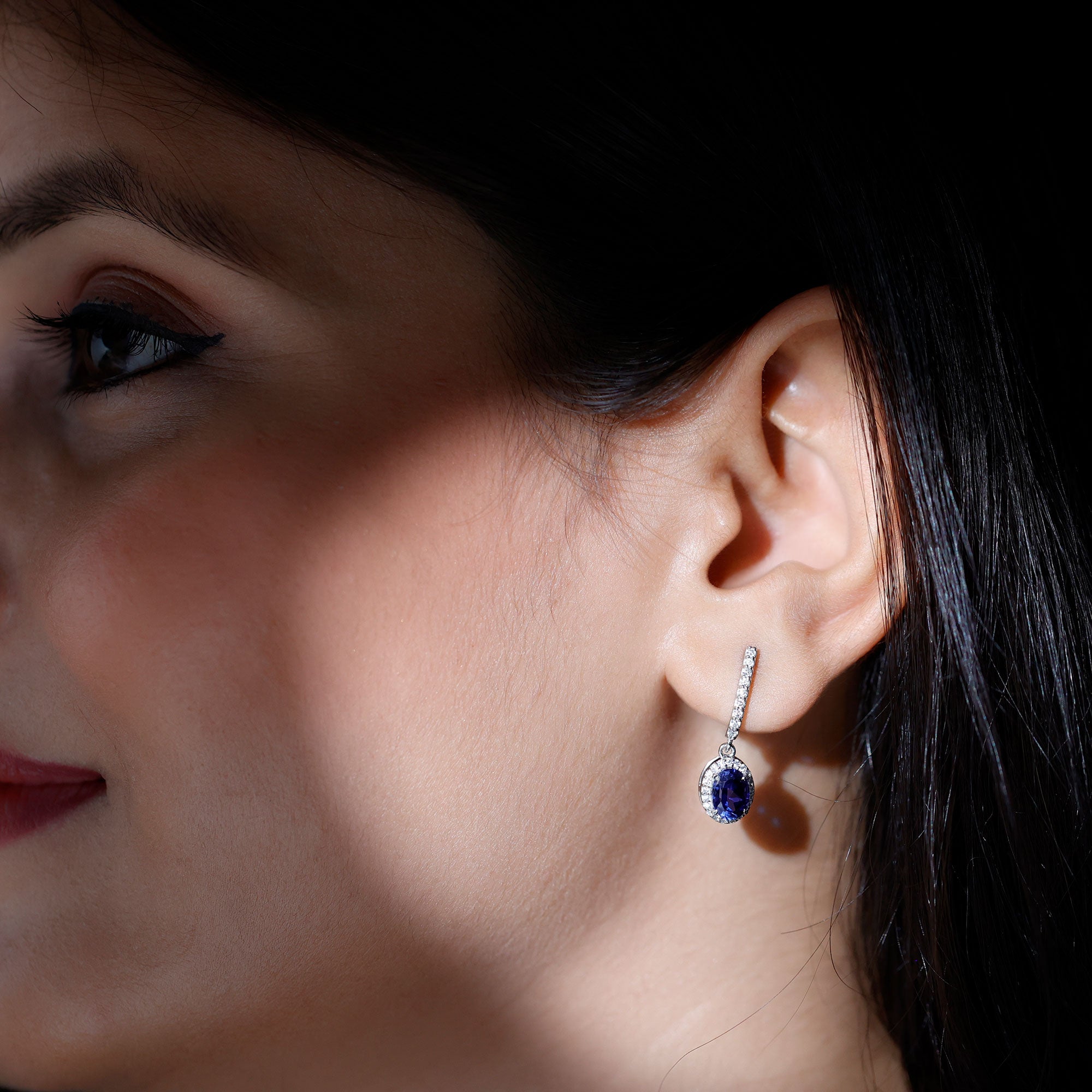 Make a statement with these exquisite Blue Sapphire Drop Earrings, a dazzling blend of vibrant color and sophisticated sparkle. Curated with a stunning AAAA quality 5X7 MM oval cut lab created blue sapphire, set securely in claw setting. Surrounding the sapphire is a halo of brilliant round cut moissanites, adding an elegant shimmer that enhances the royal blue of the center stone. The drop design allows the Drop Hoop Earrings to sway gracefully with every movement, creating a captivating effect perfect for weddings, romantic evenings, or any occasion when you want to elevate your look. Designed with a reliable latch back closure, they provide comfort and security, ensuring they stay in place while you enjoy your day or night. Presented in a beautifully crafted jewelry box, these Lab Created Blue Sapphire and Moissanite Earrings make a thoughtful and luxurious gift for special celebrations. These Oval Drop Earrings are a versatile and elegant choice for anyone who loves jewelry that combines classic charm with effortless sophistication.