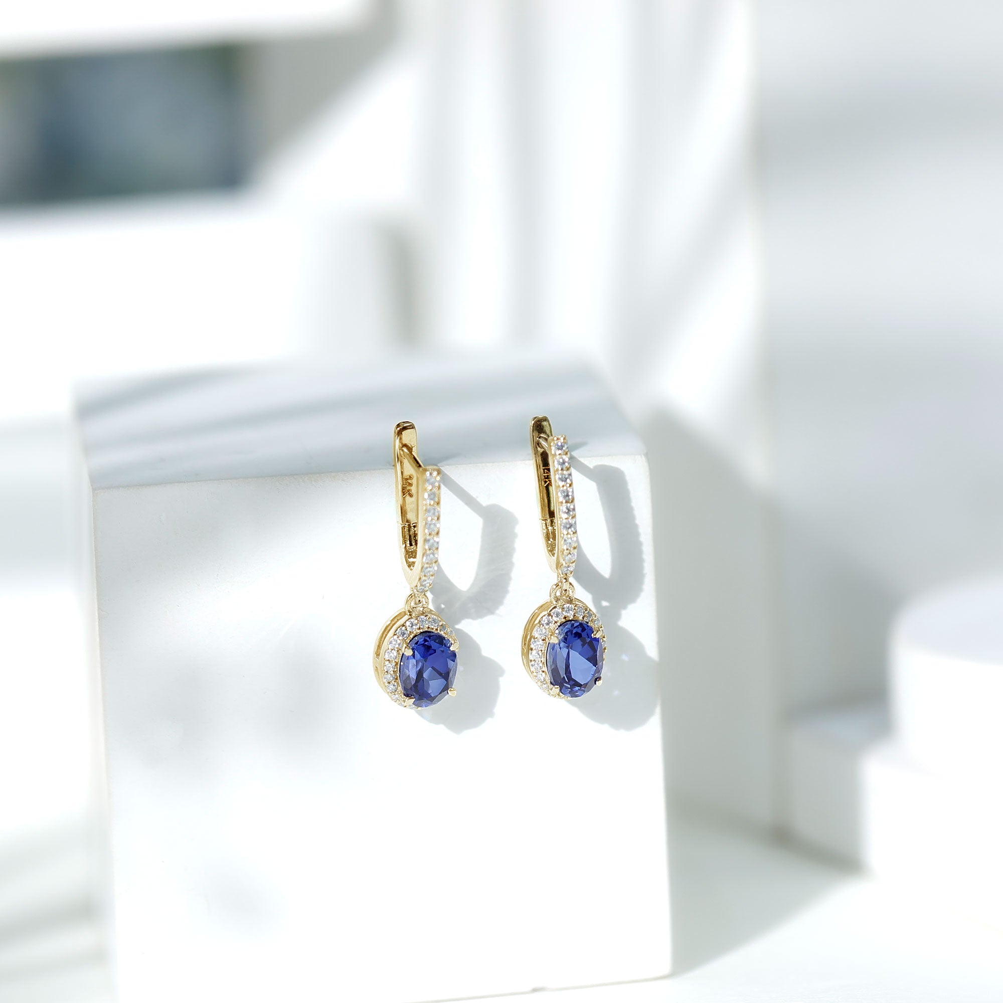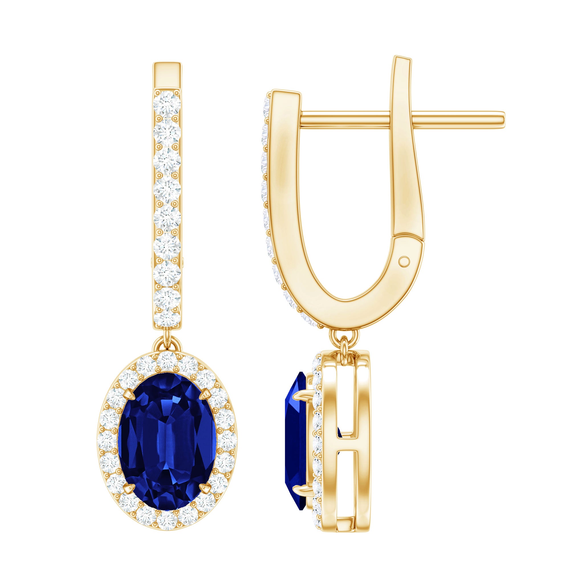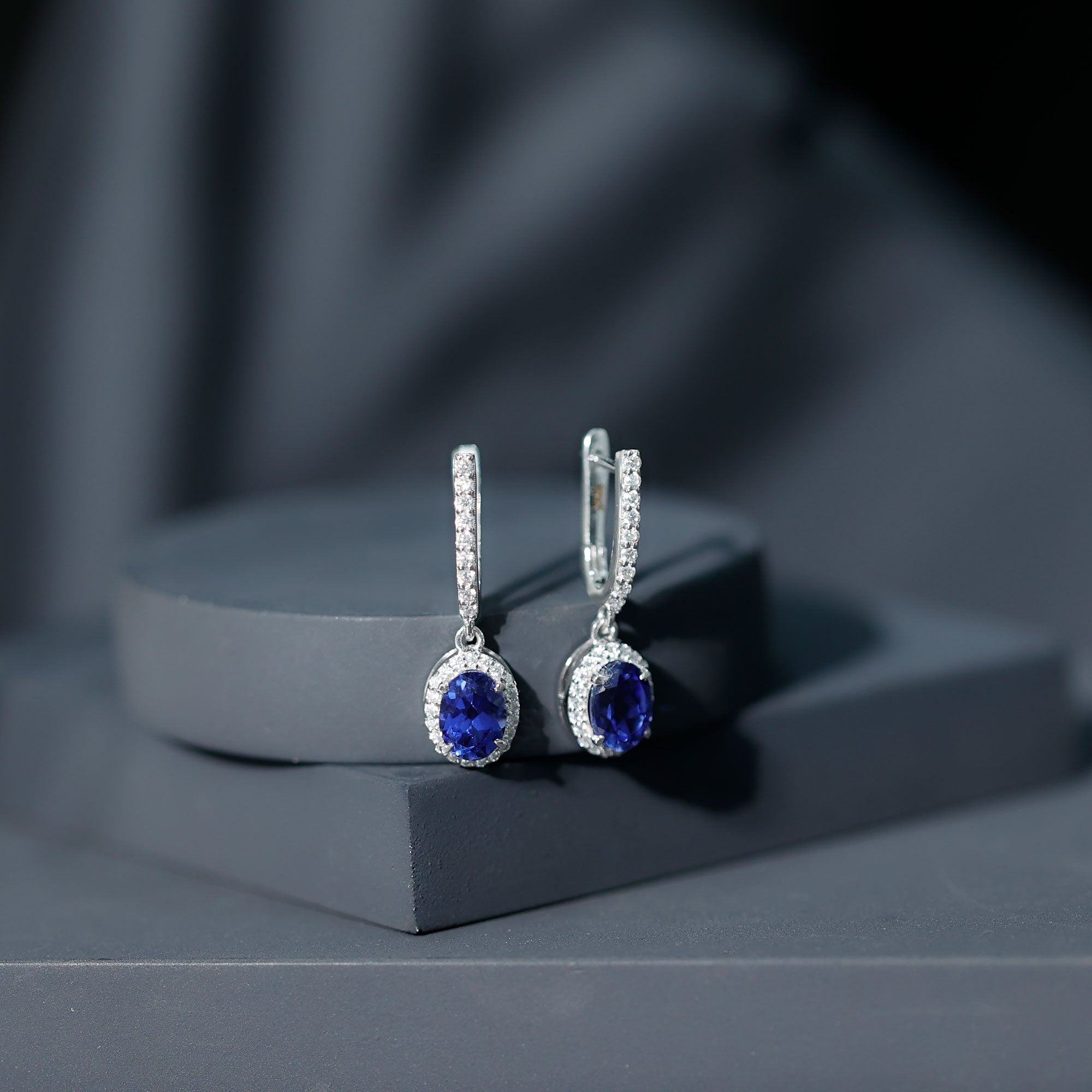 Make a statement with these exquisite Blue Sapphire Drop Earrings, a dazzling blend of vibrant color and sophisticated sparkle. Curated with a stunning AAAA quality 5X7 MM oval cut lab created blue sapphire, set securely in claw setting. Surrounding the sapphire is a halo of brilliant round cut moissanites, adding an elegant shimmer that enhances the royal blue of the center stone. The drop design allows the Drop Hoop Earrings to sway gracefully with every movement, creating a captivating effect perfect for weddings, romantic evenings, or any occasion when you want to elevate your look. Designed with a reliable latch back closure, they provide comfort and security, ensuring they stay in place while you enjoy your day or night. Presented in a beautifully crafted jewelry box, these Lab Created Blue Sapphire and Moissanite Earrings make a thoughtful and luxurious gift for special celebrations. These Oval Drop Earrings are a versatile and elegant choice for anyone who loves jewelry that combines classic charm with effortless sophistication.
