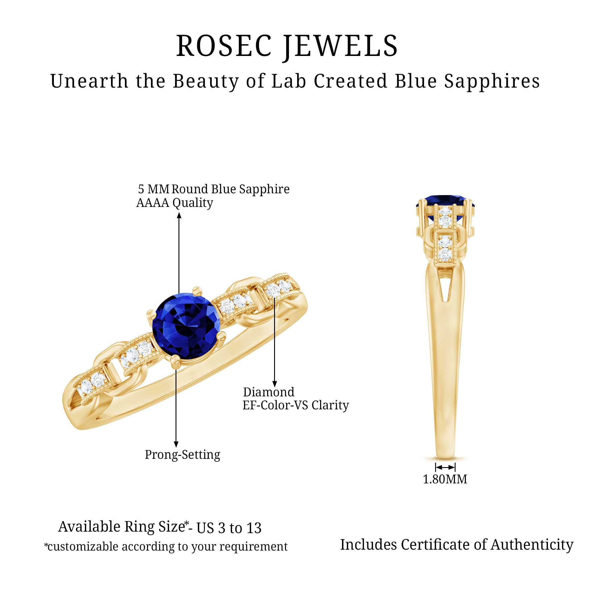 Elegance meets simplicity in our Minimal Promise Ring, featuring a 5 mm Round Shape Lab Grown Blue Sapphire in a secure prong setting. The chain design band, adorned with Round Shaped Lab Grown Diamonds, adds a touch of brilliance with the Aaaa Quality Sapphire. Meticulously crafted and certified, this Classic Ring stands as a timeless symbol of commitment, marrying sophistication with a modern aesthetic. Let this Sapphire Diamond Ring narrate your promise in a classically refined way.