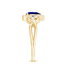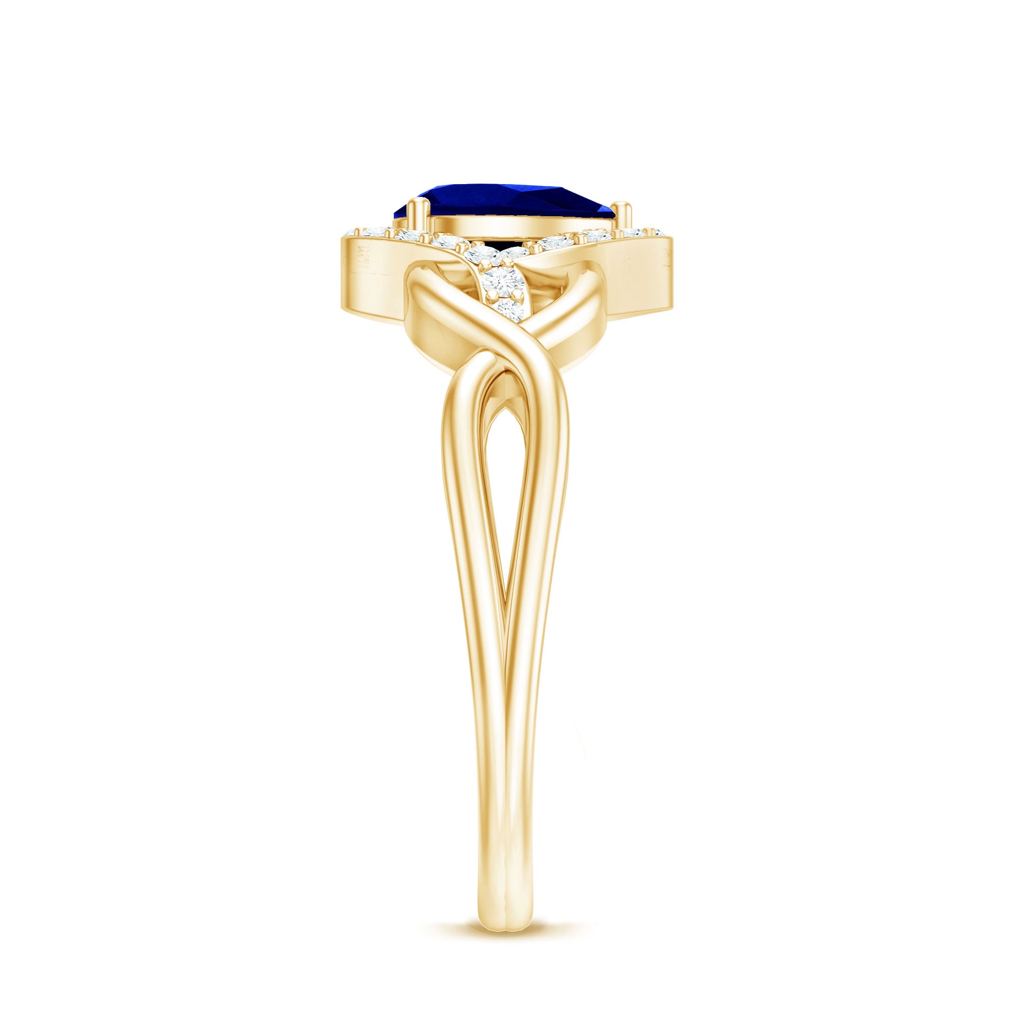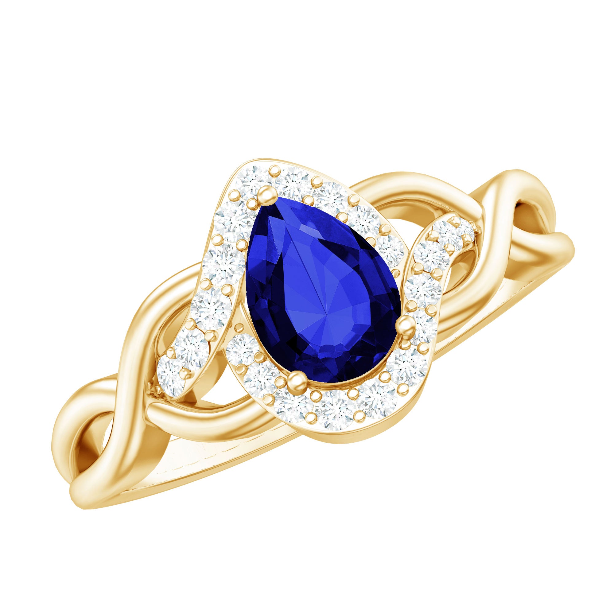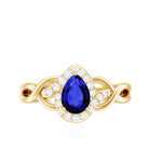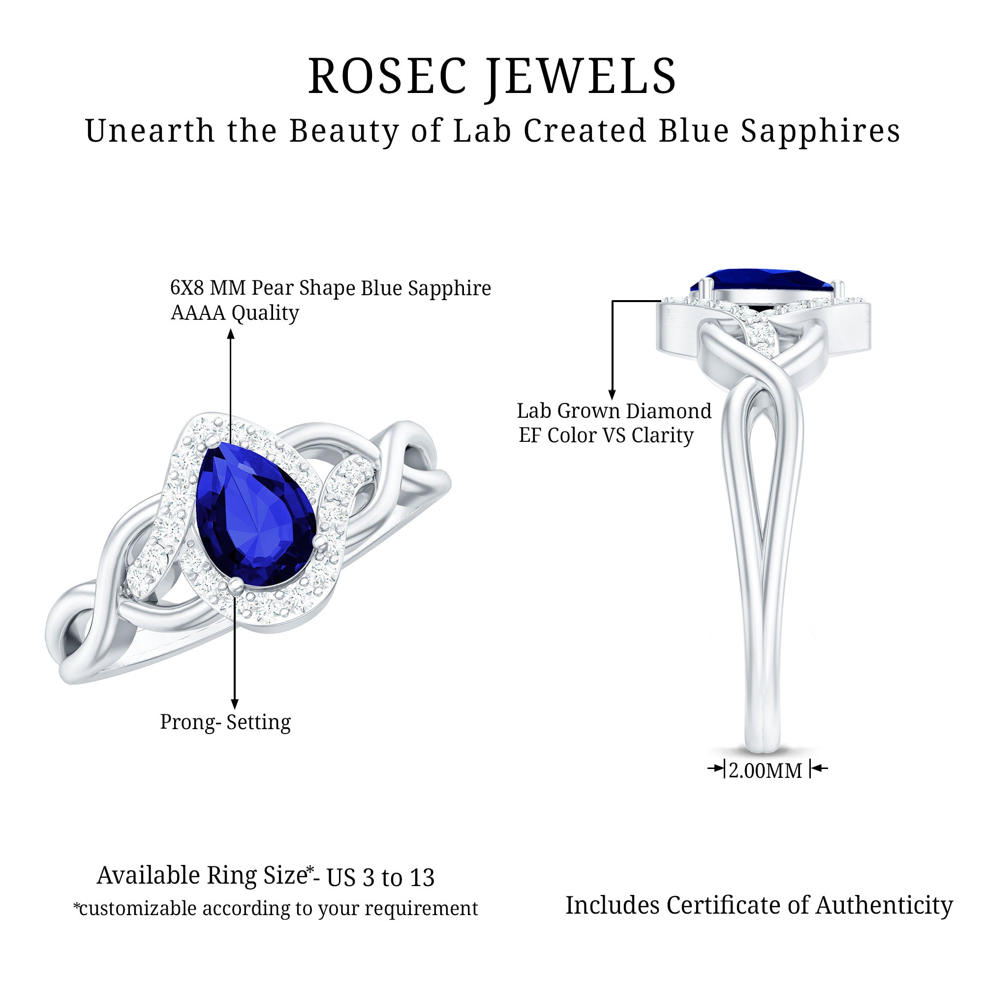 Profess your love with timeless elegance through this Crossover Engagement Ring. Crafted to perfection, the 6x8 mm Pear Shape Blue Sapphire takes center stage, surrounded by dazzling Lab Grown Diamond gemstones. The intricate crossover band adds a contemporary touch to this classic design. Meticulously created by Rosec Jewels, renowned for exquisite craftsmanship, this Blue Sapphire Diamond Ring (Synthetic) is a symbol of everlasting love and commitment.
