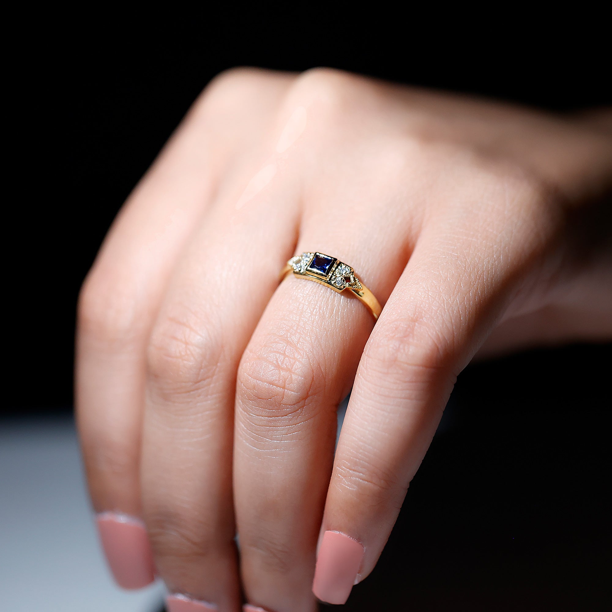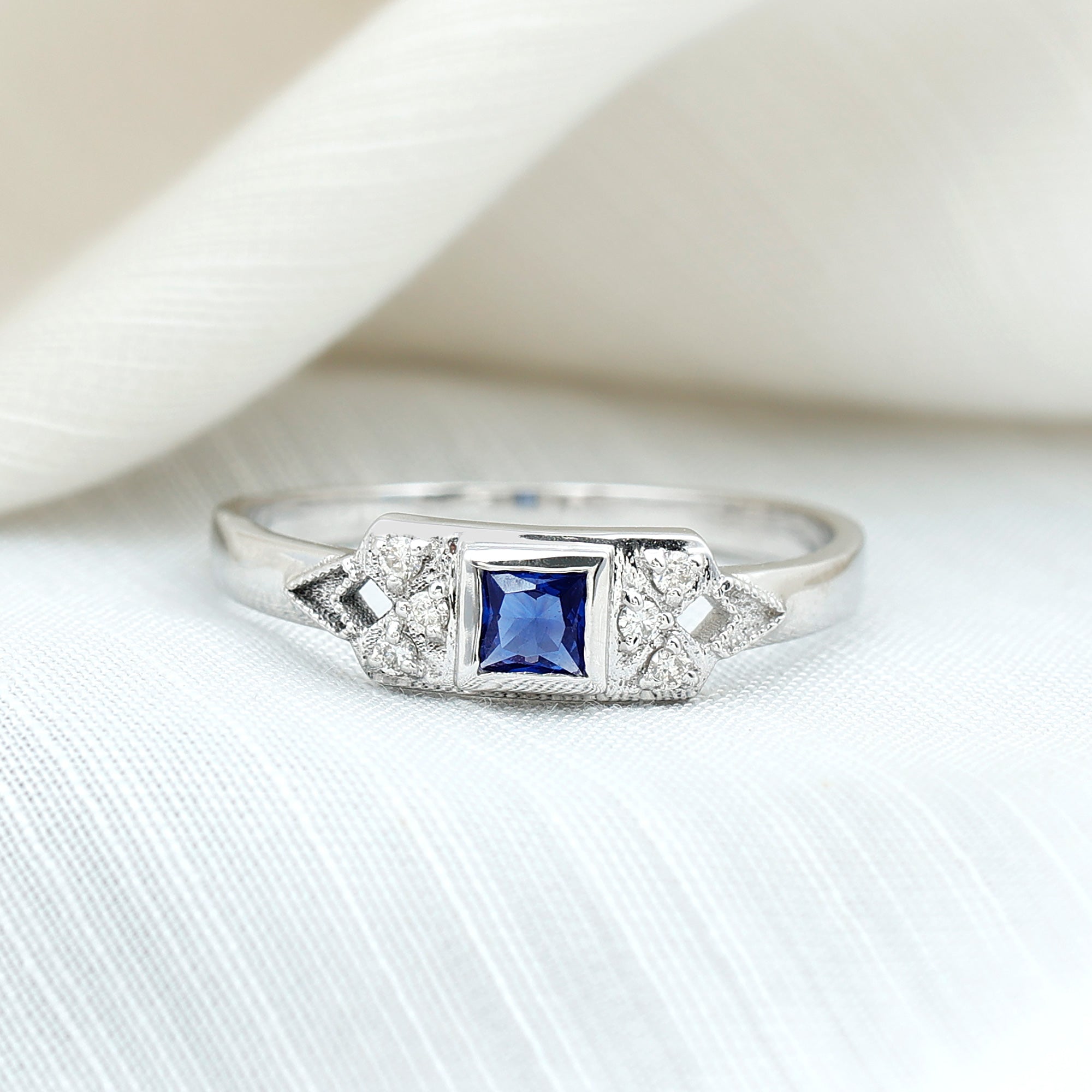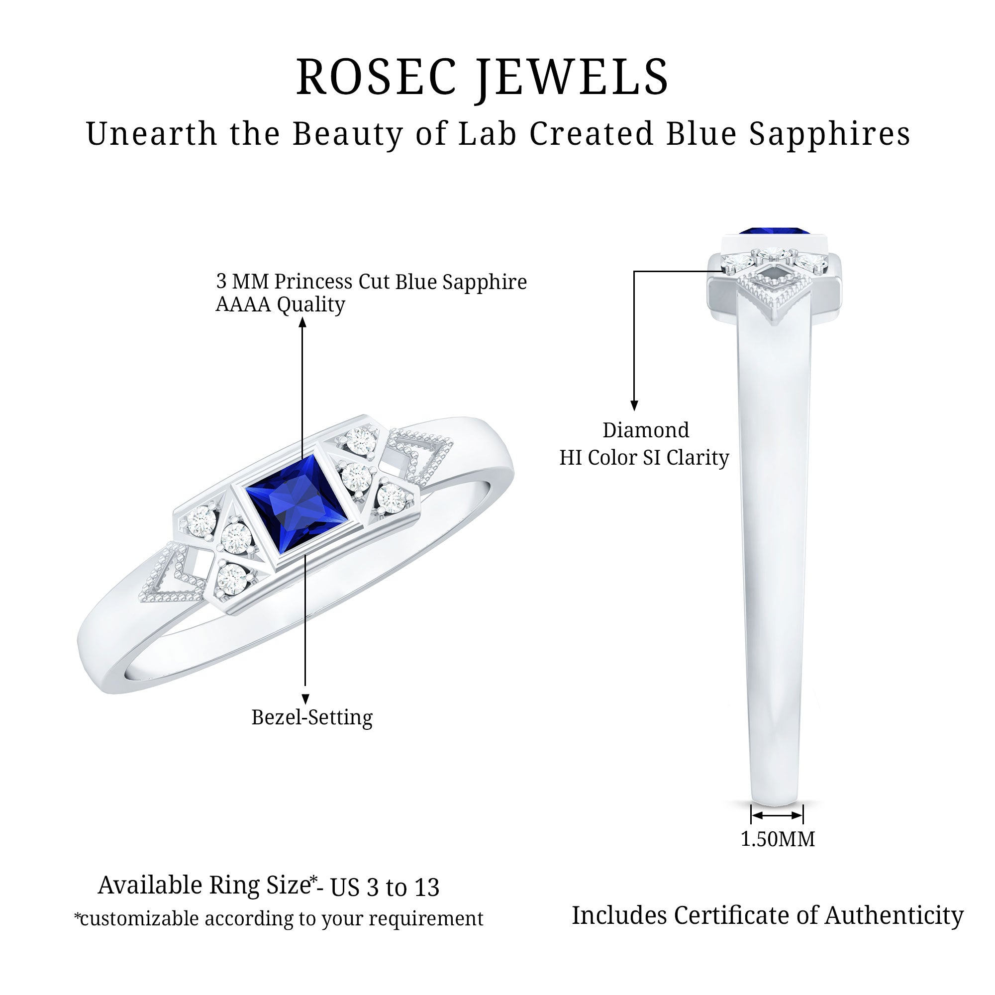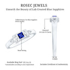 The timeless Unisex Promise Ring showcases a princess cut Lab Created Blue Sapphire, elegantly placed in a bezel setting, flanked by Round Shape Diamond gemstones in a prong setting. This exquisite Lab Grown Blue Sapphire Ring designed for women offers a range of metal options, adding to its versatility and charm.