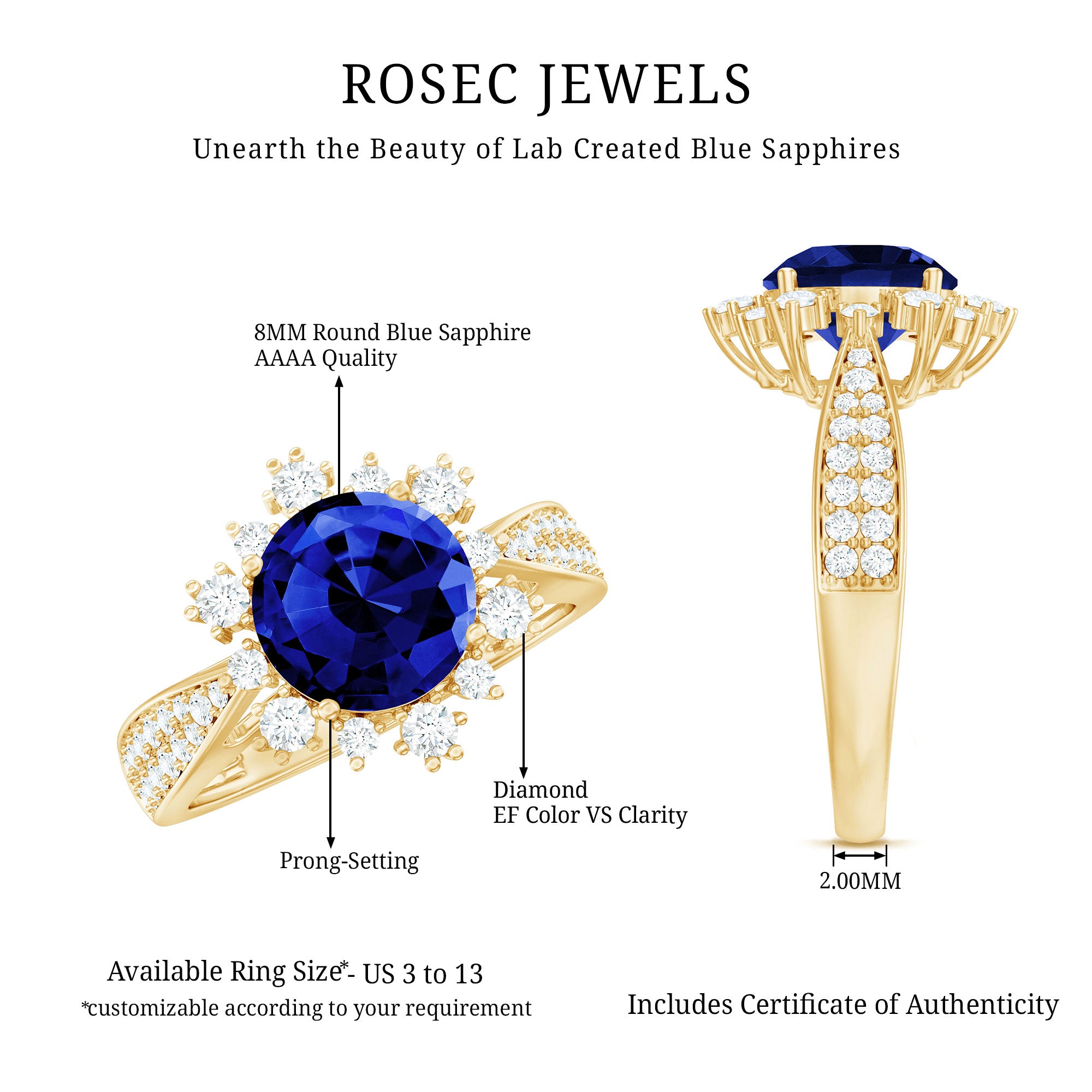 Indulge in timeless elegance with this Classic Engagement Ring, featuring a 8 mm Lab Grown Blue Sapphire at its center, embraced by sparkling Lab Grown Diamond gemstones that enhance its radiant allure. Meticulously crafted, this Blue Sapphire Ring is embedded with Aaaa Quality Sapphire and Ef-Vs Quality Diamonds that embodies Rosec Jewels commitment to environmental responsibility. Elevate your love story with this Sapphire Diamond Ring ethically crafted symbol of commitment, that seamlessly blends tradition and innovation.