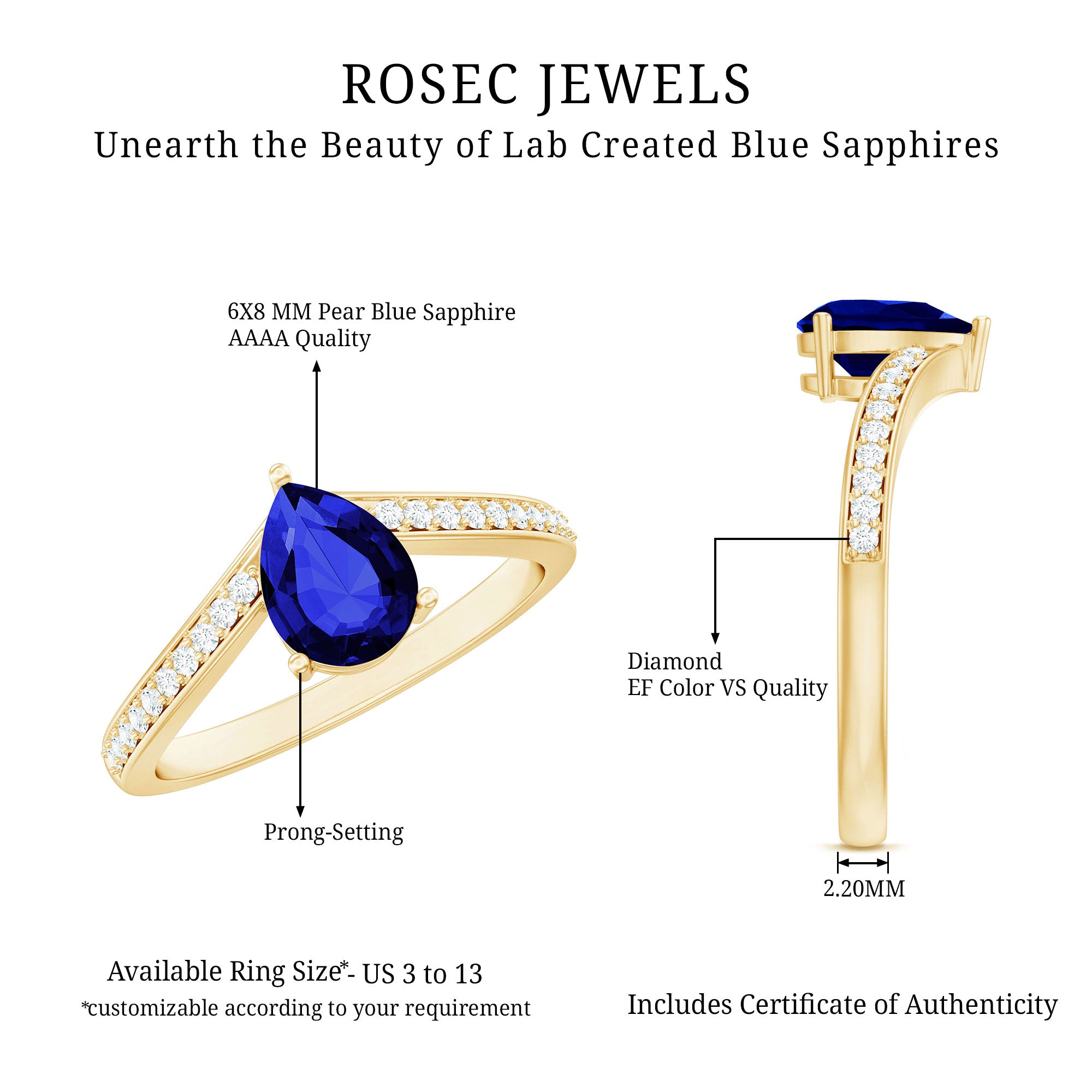 The hue of blue in our Lab Created Blue Sapphire Solitaire Engagement Ring is truly captivating, reminiscent of the serene blue skies or the enchanting depths of the ocean. Its a beautiful choice for your big day and it encapsulates both elegance and romance. A 6x8mm Pear Shaped Lab grown blue sapphire takes the center stage and the chevron band is adorned with Round lab created diamonds. This Designer Ring will capture your heart and mind with Aaaa quality Sapphire and Ef-Vs Quality Diamonds. Rosec Jewels specializes in crafting stunning Blue Sapphire Ring using certified lab cultured gemstones.
