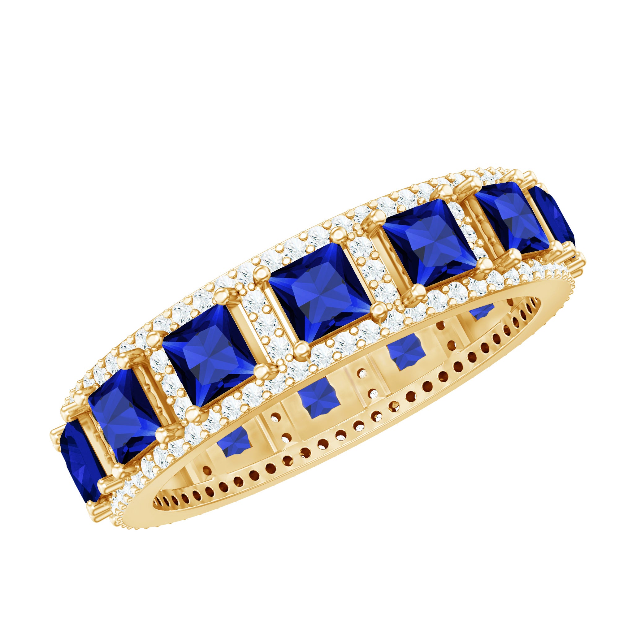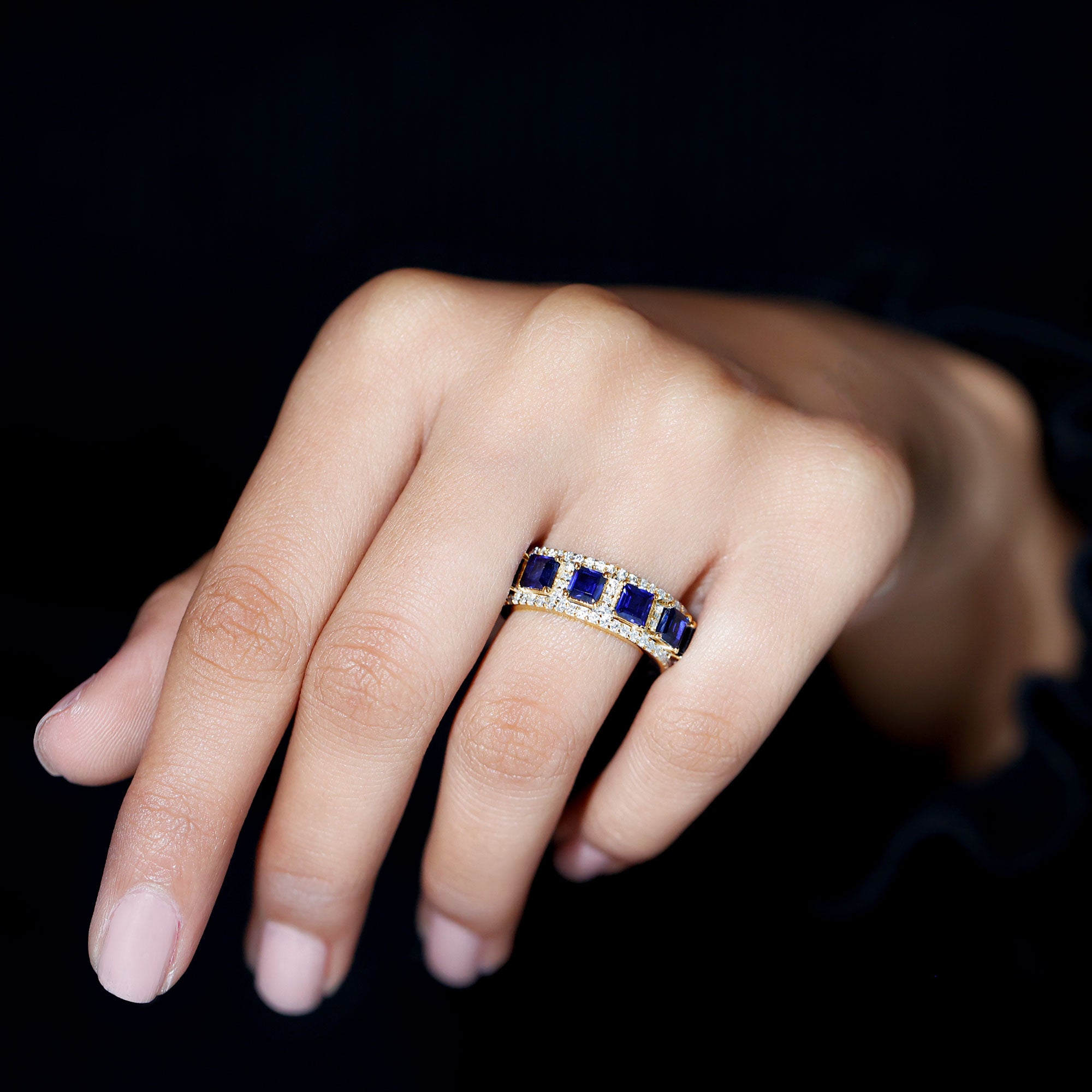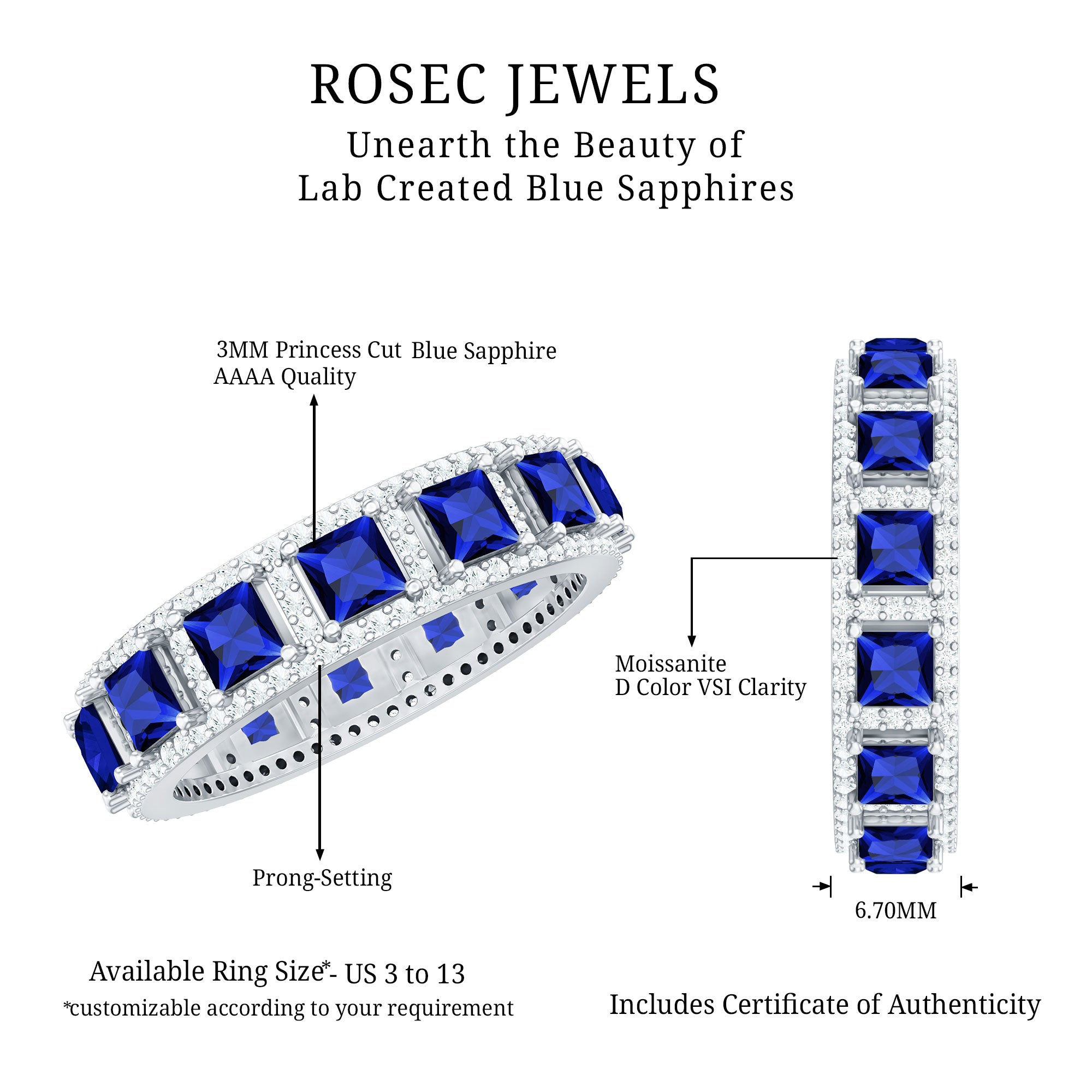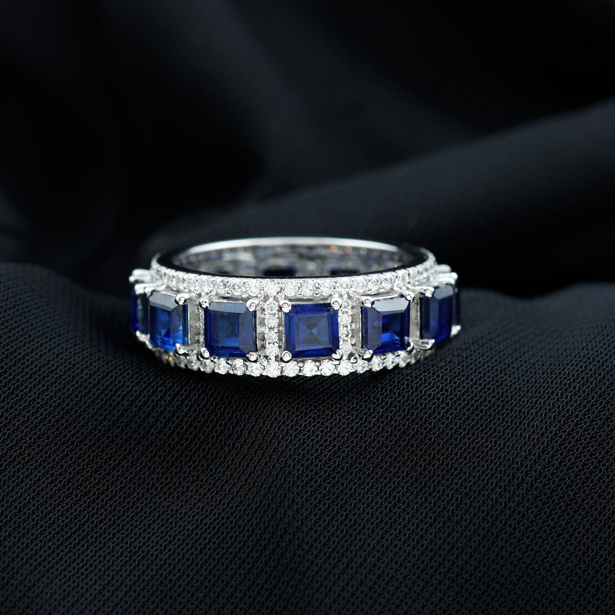 The elegant Classic Wedding Band is a wonderful choice for your partner to be to make her feel special. Embellished with Princess Cut Lab Created Blue Sapphire in Prong Setting along with a Moissanite Accent.
