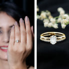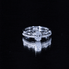 Take her heart away with the stunning details of this Solitaire Engagement Ring features a 5X7 MM oval shaped diamond (EF-VS quality) securely set in a prong setting. Its unique double band shank adds a touch of artistry, with one band decorated with a row of surface prong set round cut diamonds for a continuous sparkle, while the other showcases delicate marquise metal motifs and gemstones set alternatively for a contemporary look. Together, these elements in this Oval Diamond Ring create the illusion of a stackable ring while maintaining the comfort of a single band. Designed to symbolize everlasting love, this Lab Grown Diamond Engagement Ring is a perfect choice for the bride who values elegance, uniqueness, and timeless beauty.