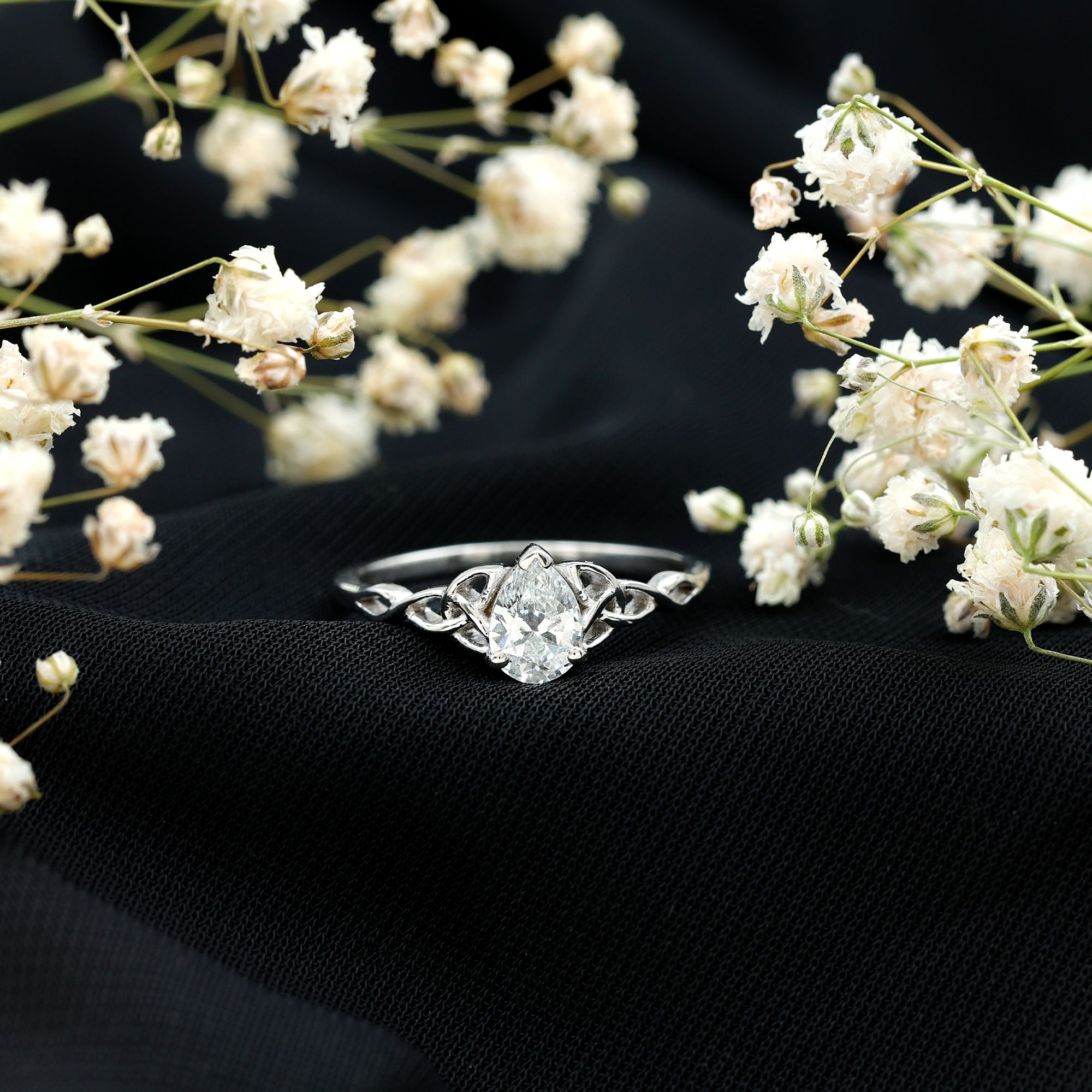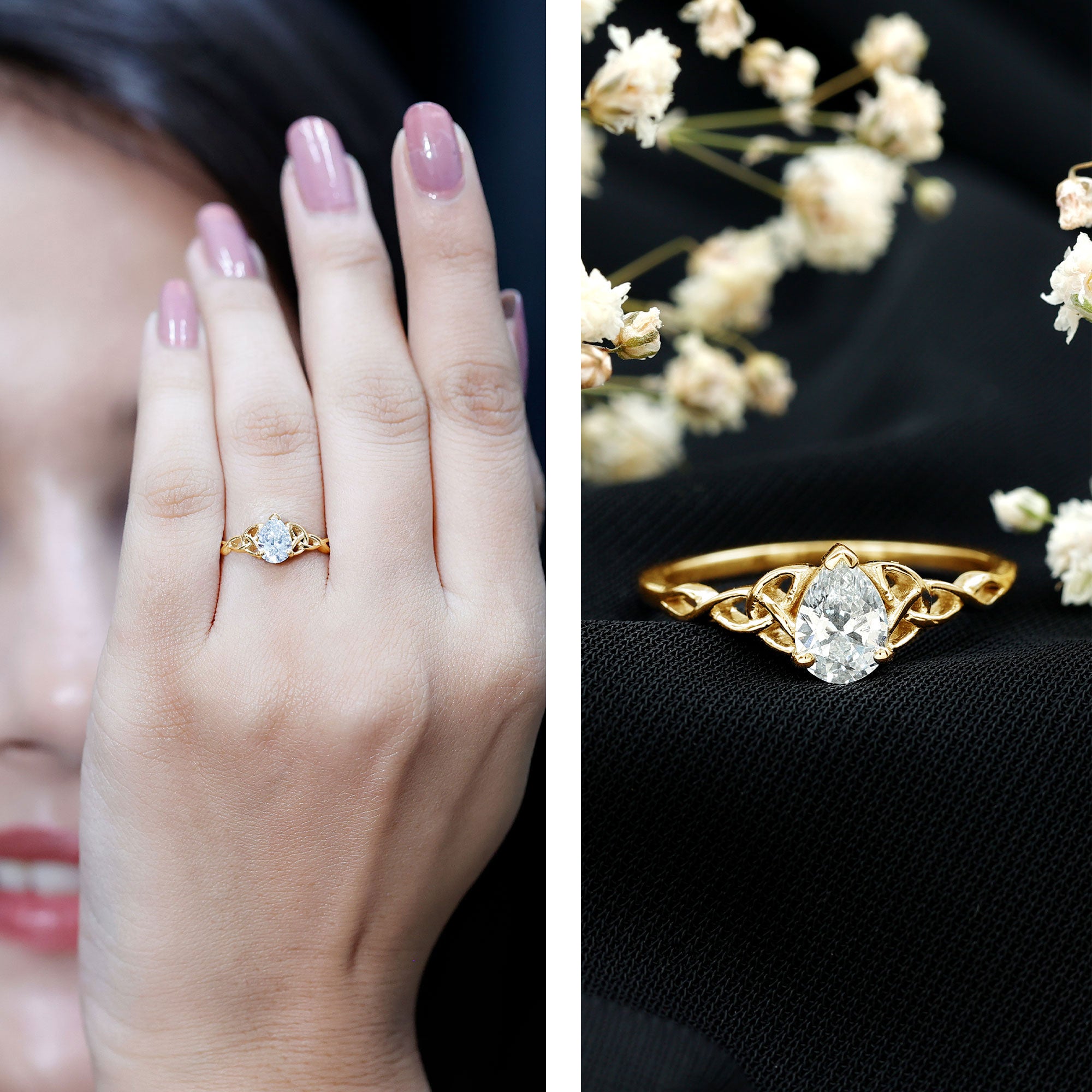 Rosec Jewels Teardrop Engagement Ring is a true masterpiece that combines the beauty of the unmatched sparkle of lab grown diamond and the timeless allure of Celtic Knot. This Solitaire Ring is embellished with a 5X7 MM pear cut diamond set in a secure prong setting with Trinity knot detail on both sides of the center stone. Expertly handcrafted, this Diamond Engagement Ring blends the beauty of heritage and modern sophistication, making it a perfect choice for celebrating your unique love story. Our jewelry comes in the appropriate packaging ensuring they are ready for gifting upon arrival.