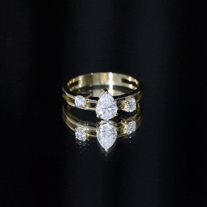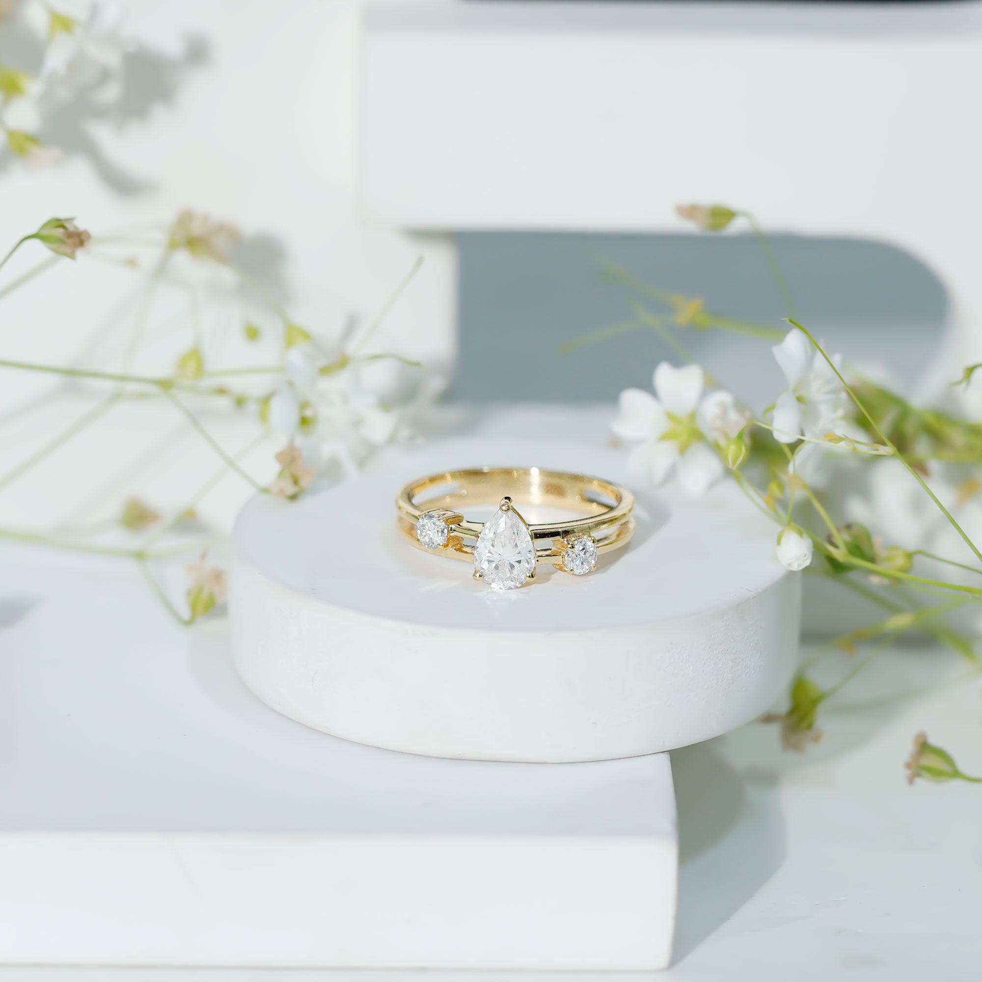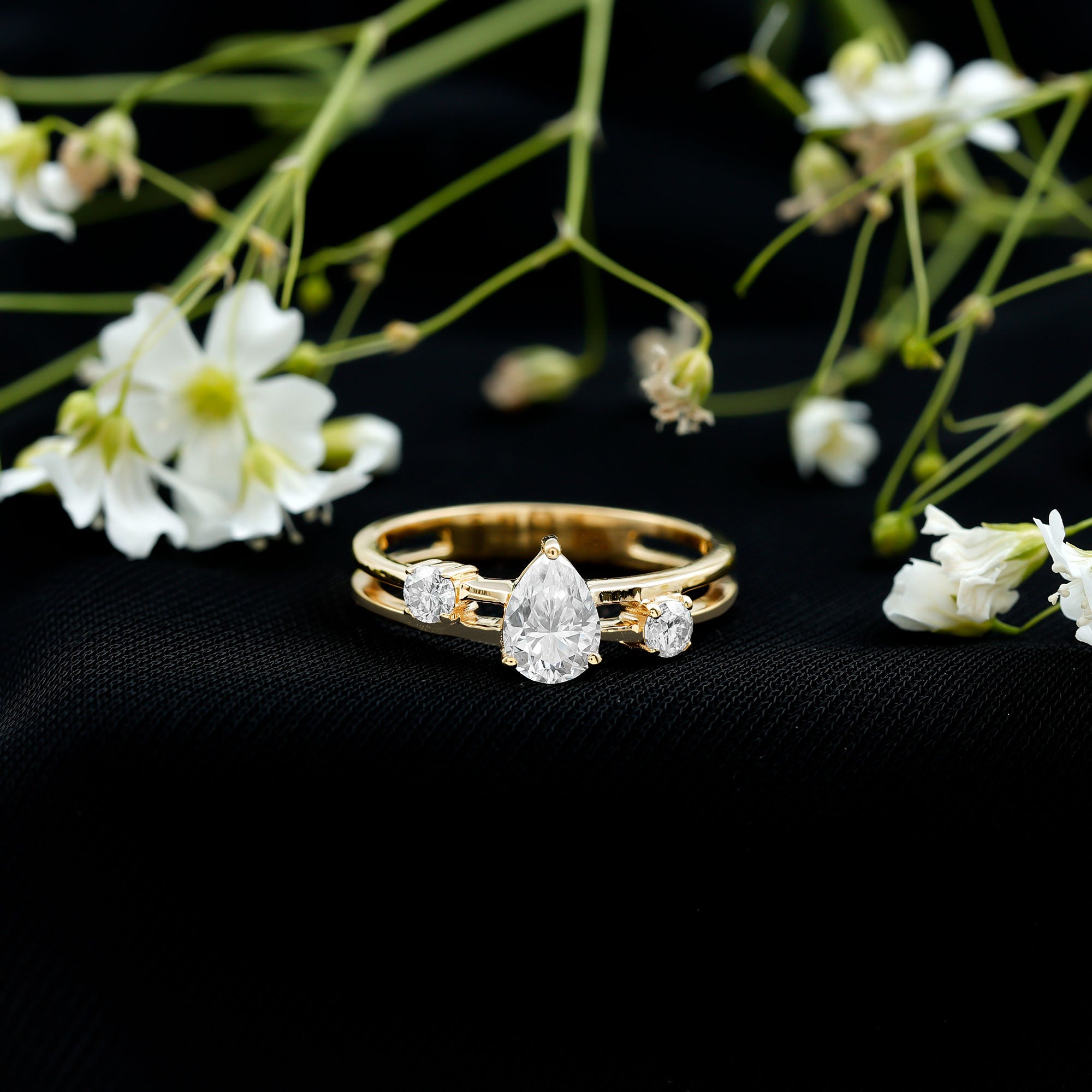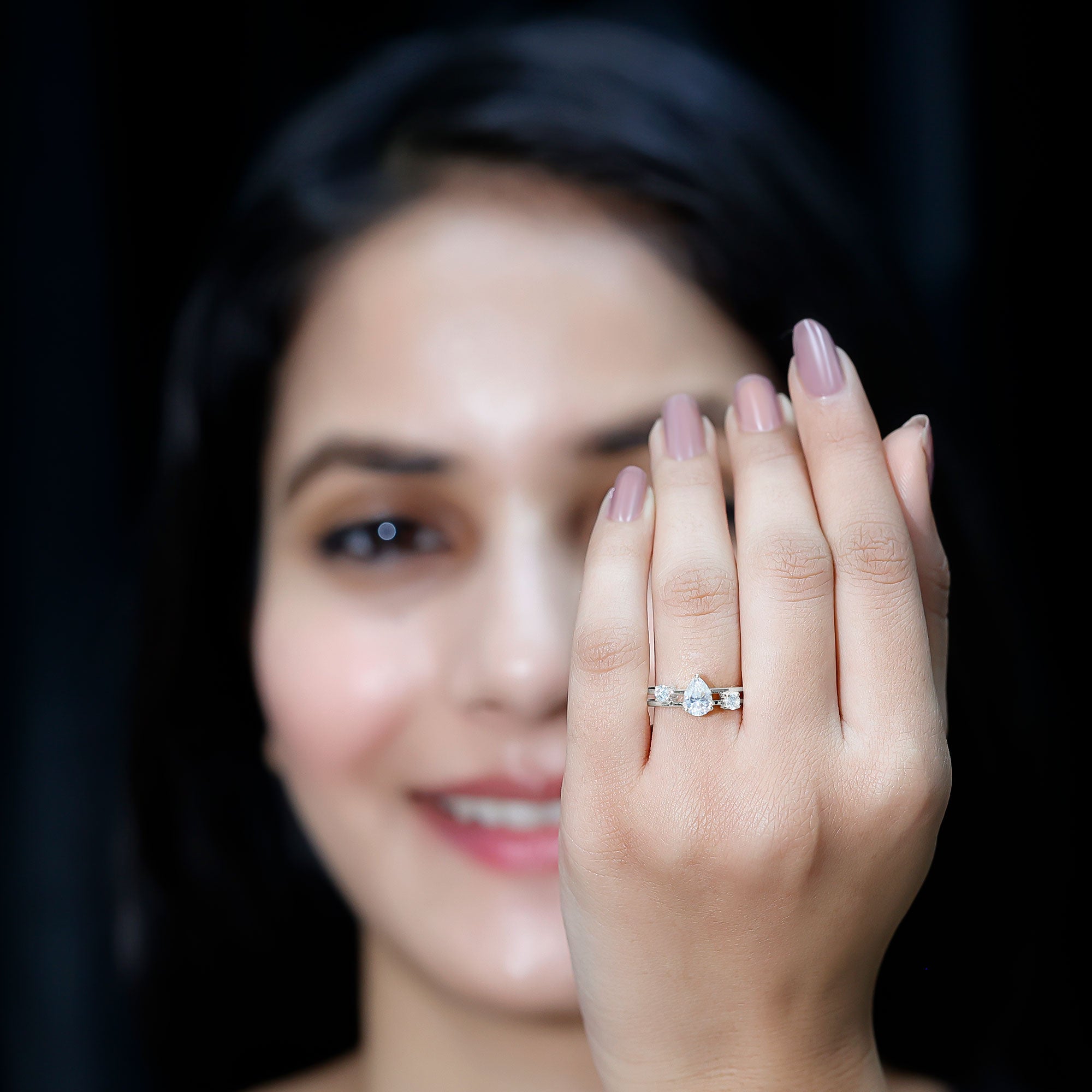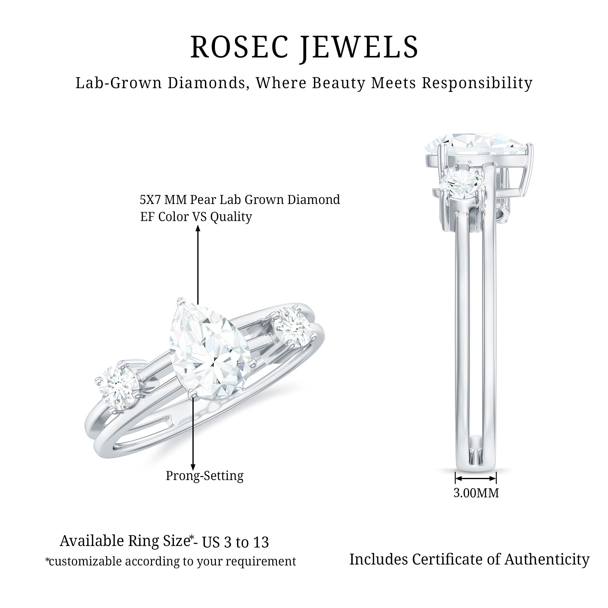 Experience the enchanting beauty of our handcrafted Diamond Solitaire Ring, created with meticulous attention to detail. The centerpiece is a 5X7 MM pear shaped diamond of EF-VS quality, carefully prong set to maximize its sparkle. Adding to its charm, two additional round diamonds sit on either side of the focal stone on a double band shank. This Teardrop Engagement Ring is designed by Rosec Jewels with lab grown diamonds, making it an environmentally friendly choice for your big day. Also, this Pear Shaped Diamond Ring is available in various Metal color and Purity Options so that you can choose as per your style and select the perfect ring size for a flawless fit. To ensure complete confidence in your purchase, it comes with a certificate of authenticity.