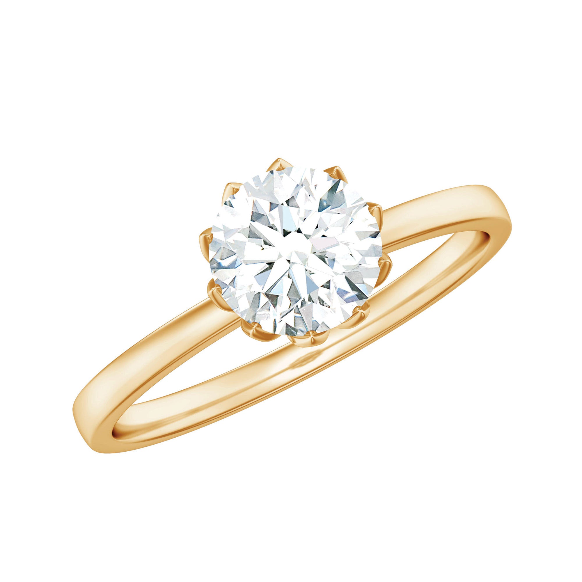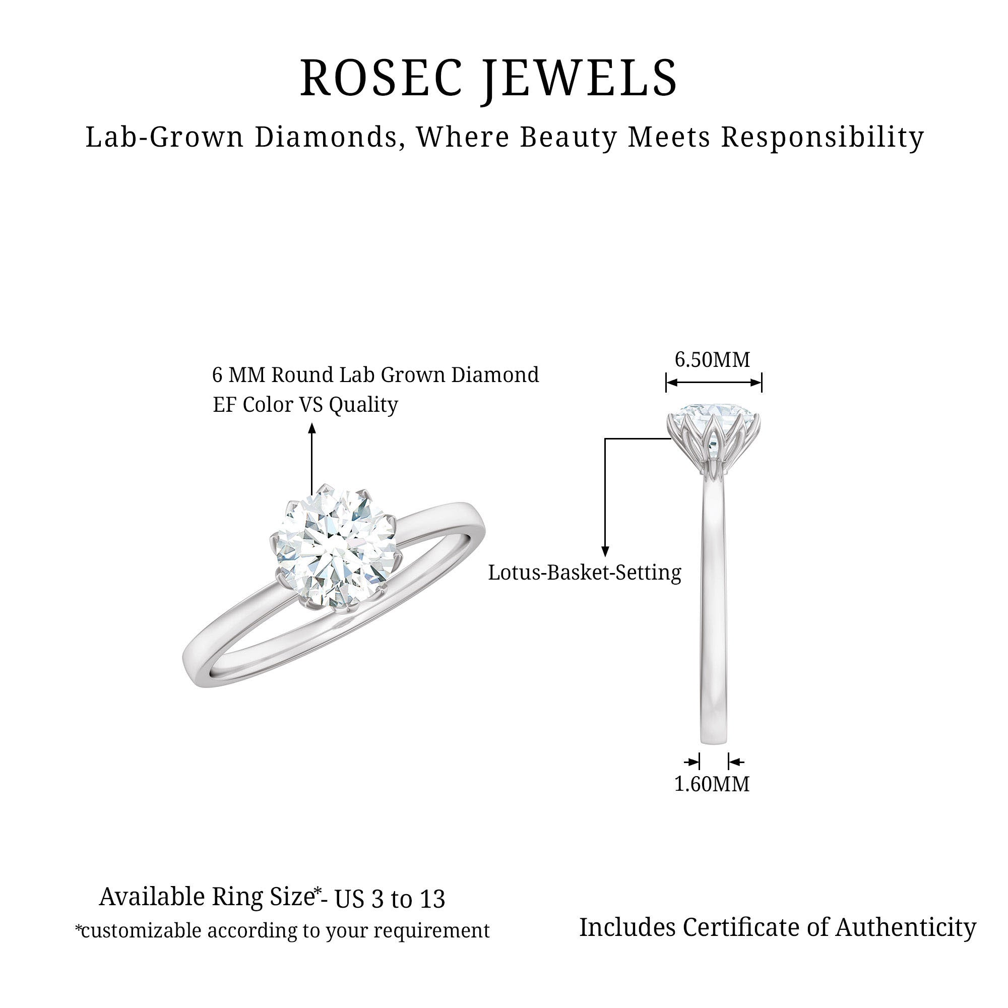 A petite perfection, this Round Cut Diamond Ring is the start of something beautiful. Featuring a single brilliant 6 MM round cut diamond of EF-VS Quality at the center set in a lotus basket setting that adds an elegant twist to the classic design. The band of this Lab Grown Diamond Proposal Ring is sleek and polished, ensuring all attention remains on the radiant gemstone. Our simple Solitaire Engagement Ring speaks volumes about everlasting love and commitment and the single stone makes it a perfect budget-friendly April Birthstone Ring. Also it is available in various metal color options to match your personal style and comes in different sizes to ensure the perfect fit.