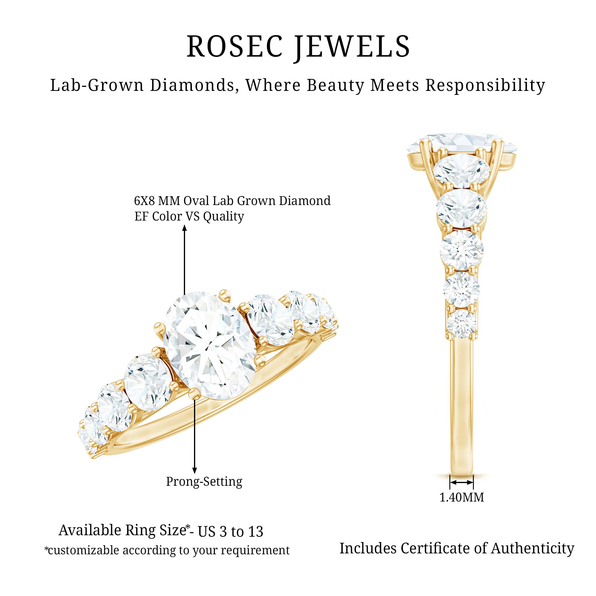 This Lab Grown Diamond Ring has a unique charm that blends classic beauty with a modern feel. Being eye-catching this Oval Diamond Engagement Ring is sure to rock your special day, whispering romance with 6X8 MM Oval Shaped Lab Grown Diamond in Prong Setting with Round diamond gemstones that are set in graduating style as Side Stones giving a perfect designer and spectacular look. This Oval Lab Diamond gemstone takes center stage while creating a timeless look that will never go out of style. This 2 ct Diamond Ring is a true showstopper that adds a subtle sparkle to the brilliant center stone, also making it a perfect heirloom piece.