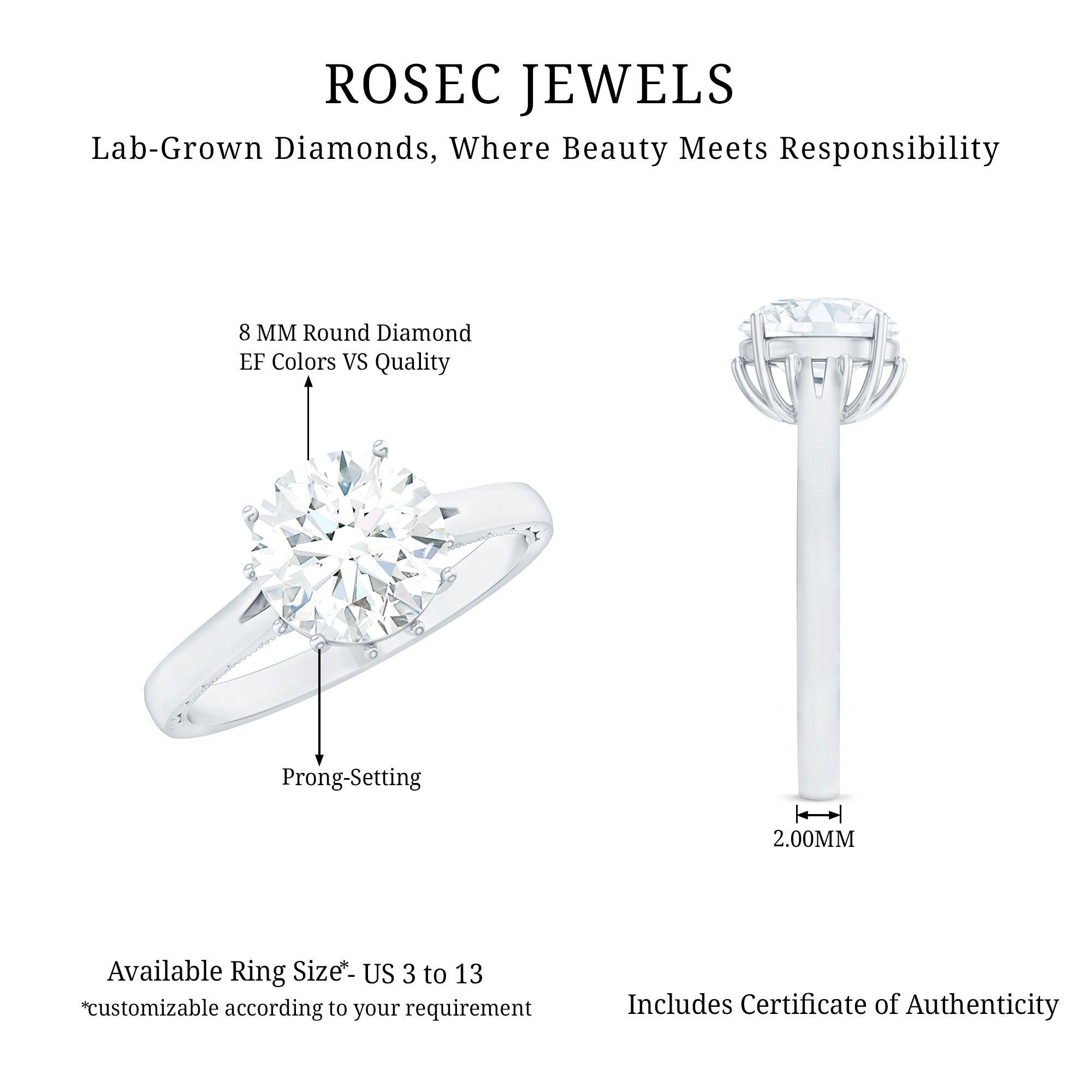 Some moments are truly meant to be cherished for a lifetime, and they deserve a brilliance that resonates on a deeper level. This Lab Created Diamond Engagement Ring is crafted to celebrate love in its most authentic and radiant form, showcasing a stunning EF-VS Quality 8 MM round lab grown diamond, securely held in prong setting that captures light and draws everyones gaze. With its elegant band and milgrain detailing, this Round Diamond Ring exudes a timeless, meaningful, and effortlessly stylish vibe. Ethically made to endure, this Round Engagement Ring honors your unique bond. Presented in a lovely jewelry box, this Solitaire Engagement Ring is ready to dazzle from the very first moment you unveil it. Available in sizes 3 to 13, this 2 Carat Diamond Ring is designed to fit perfectly and feel just right, regardless of your personal style. Whether it signifies the start of forever or serves as a sweet reminder of enduring love, this Lab Diamond Ring embodies beauty, brilliance, and a profound depth of emotion. Let it be the sparkle that tells your love story, your promise, and everything in between.