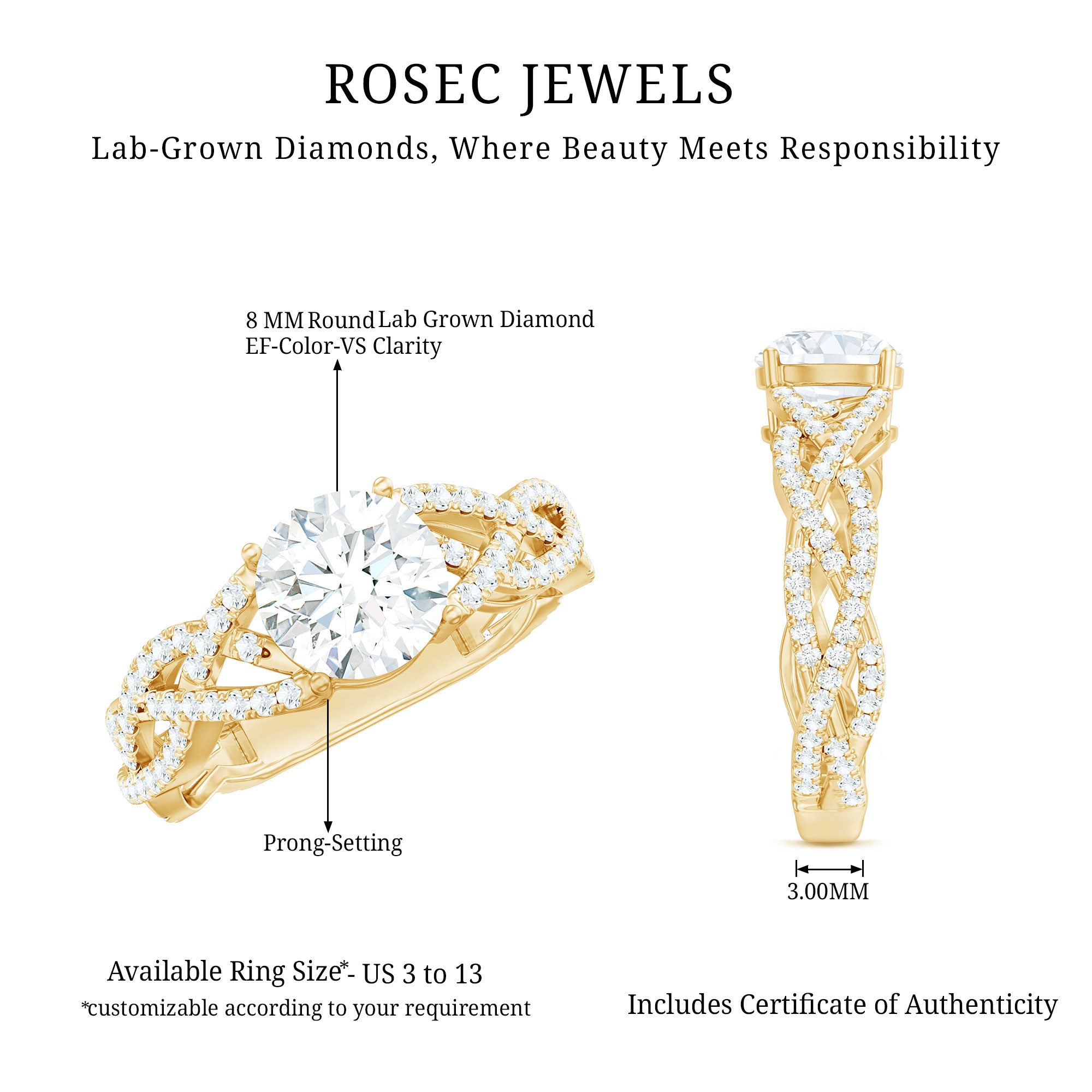 Steal her heart by presenting this stunning Diamond Engagement Ring, an excellent choice to commemorate your love. The band of this Crossover Ring features three elegantly intertwined strands, creating a braided appearance, and is embellished with sparkling round cut diamonds. This captivating design highlights a central 2 carat Diamond of round shape, securely held in a delicate four-prong setting. Both charming and fashionable, this Criss Cross Engagement Ring represents everlasting love and reflects a sophisticated taste. This Circle Engagement Ring serves as a thoughtful and budget-friendly gift for your beloved. Crafted with ethically sourced, lab-grown diamonds, it provides the luxury of fine jewelry while remaining environmentally conscious.