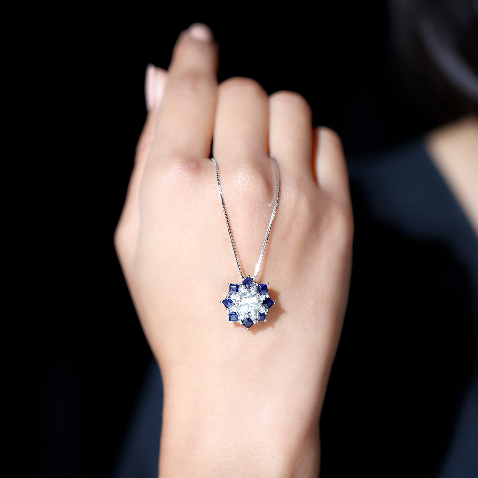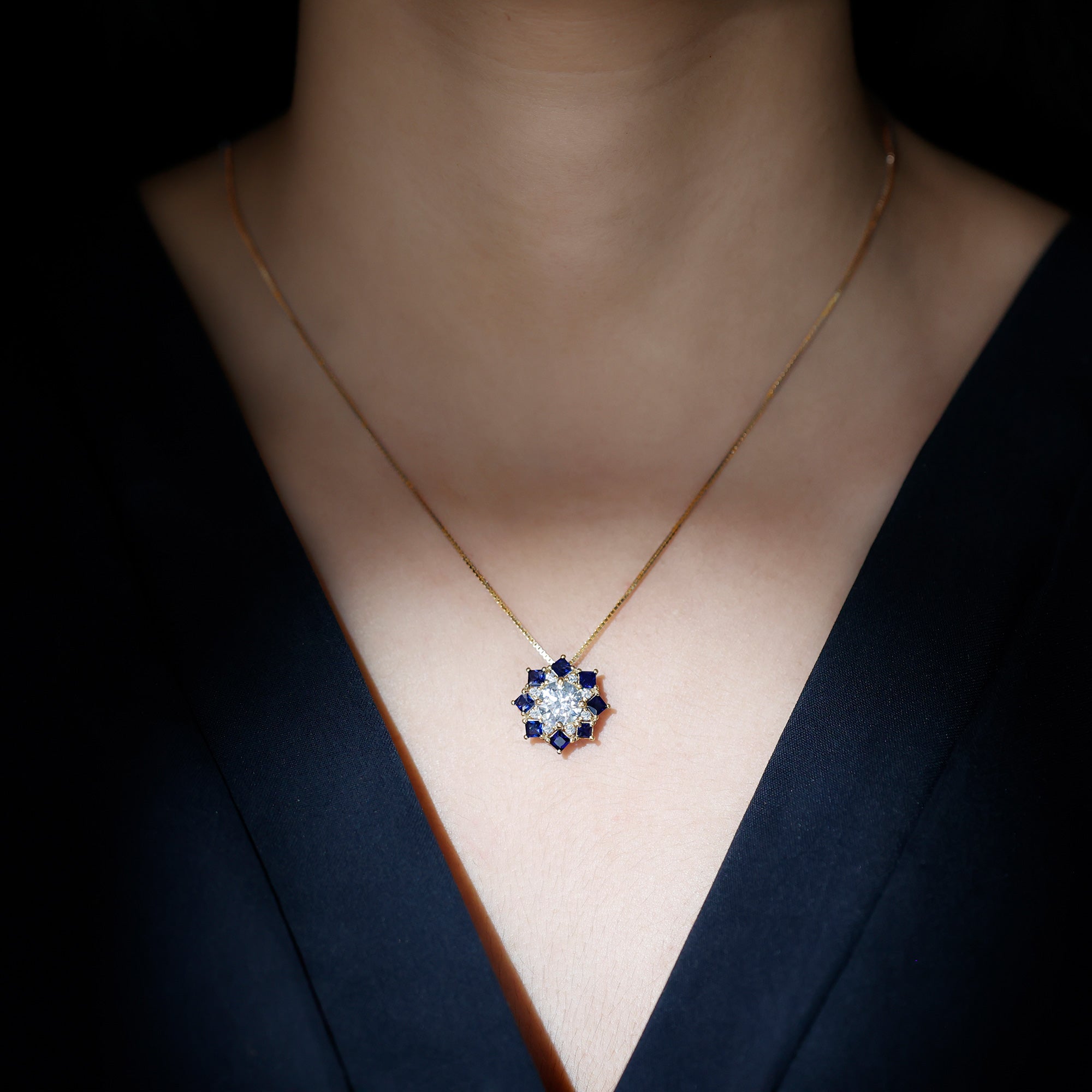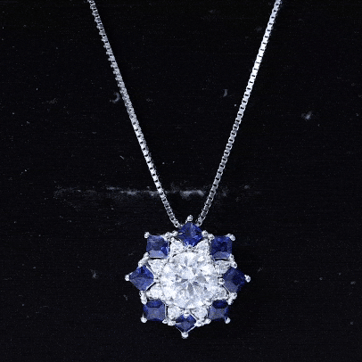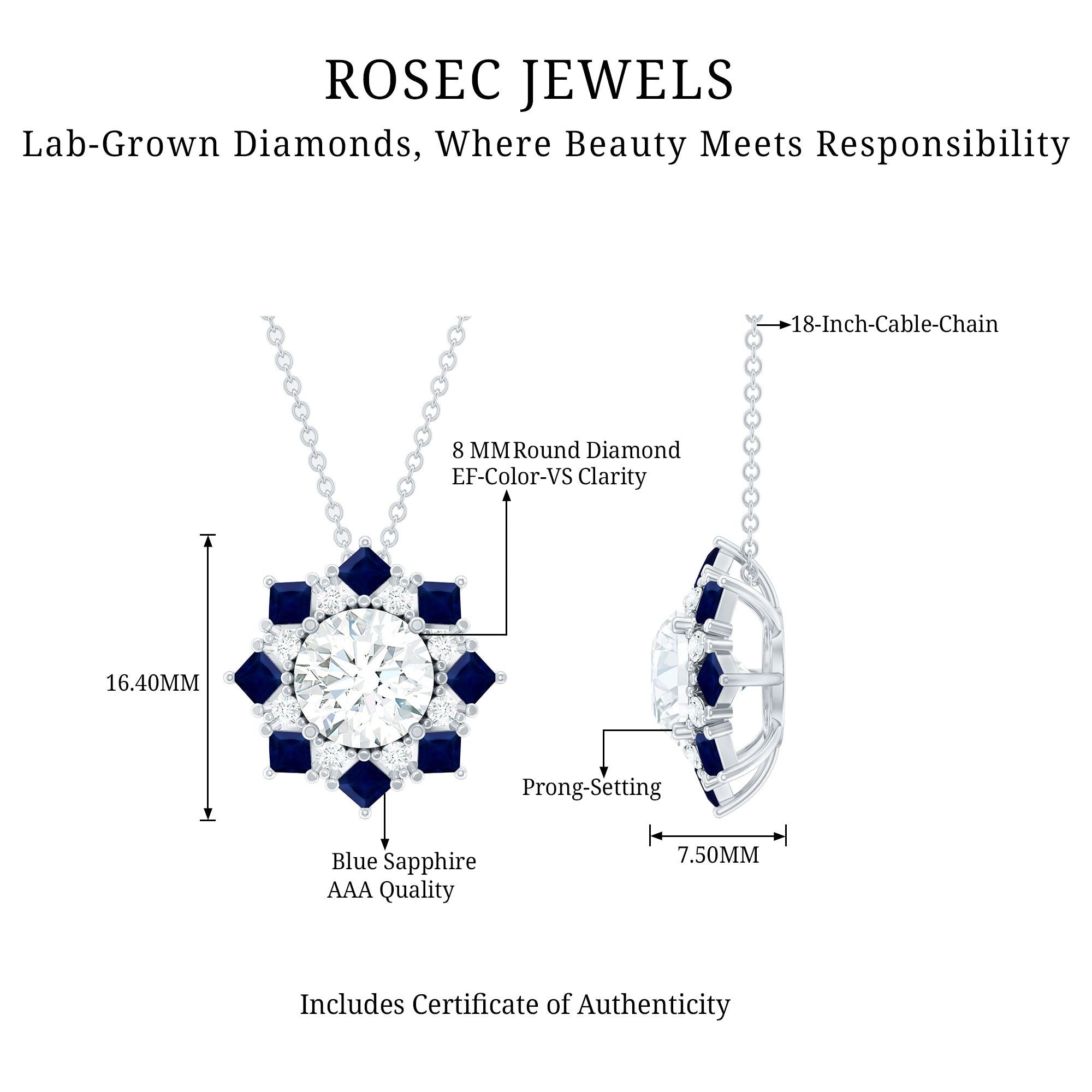 Elevate your fashion game with this Vintage Style Necklace, a perfect blend of classic charm and contemporary appeal. At its heart, a stunning 8 MM round cut lab-grown diamond is beautifully showcased in prong setting, surrounded by a dazzling halo of princess cut blue sapphires and smaller round diamonds, resulting in an enchanting shimmer. This Diamond Pendant Necklace adds a refined touch of elegance and glamour to any outfit that will be admired for years to come. It makes a heartfelt gift for anniversaries, birthdays, Valentines Day or just to remind someone special that your love for them knows no limits. Designed by Rosec Jewels, this Halo Pendant Necklace is more than just jewelry, it is a promise of forever.