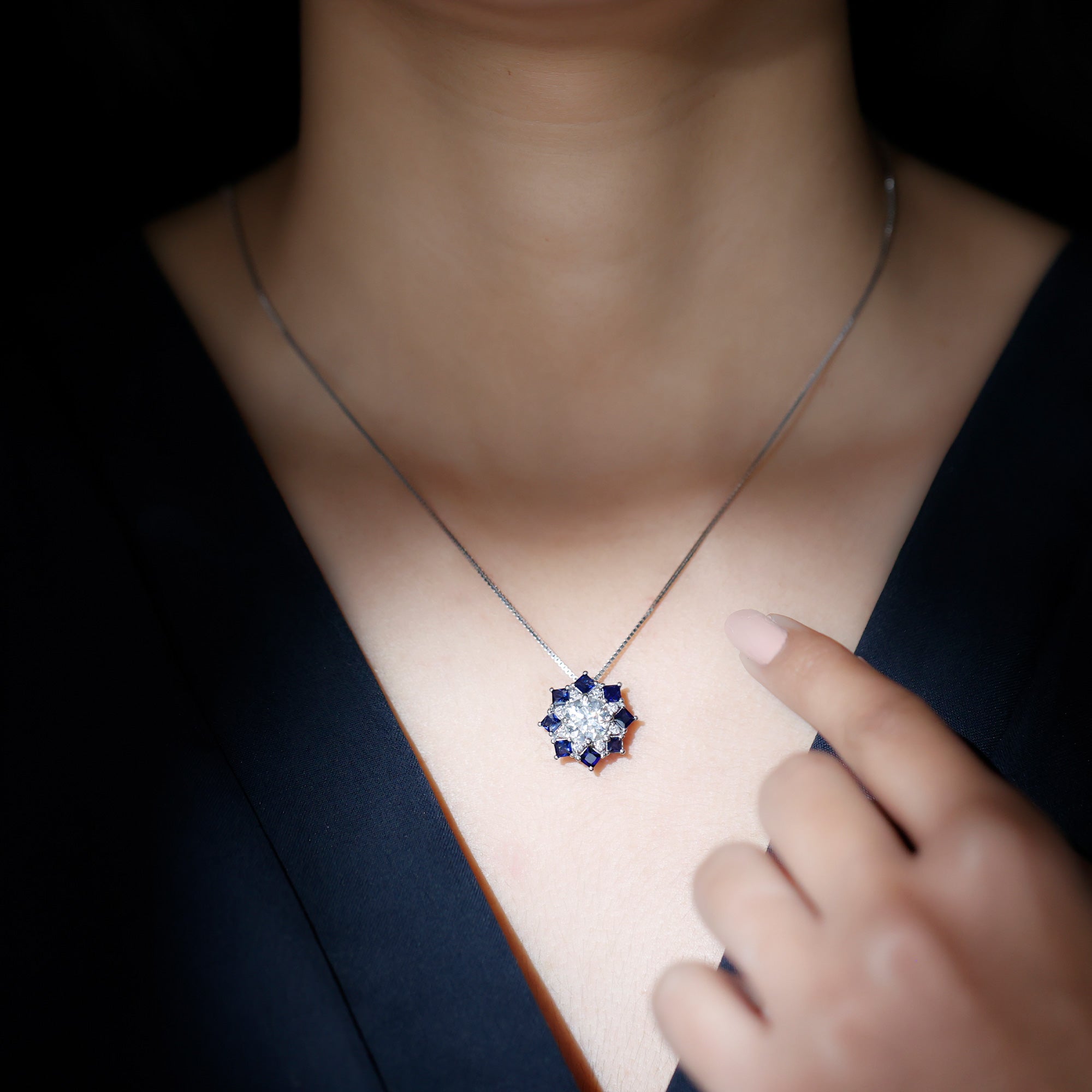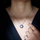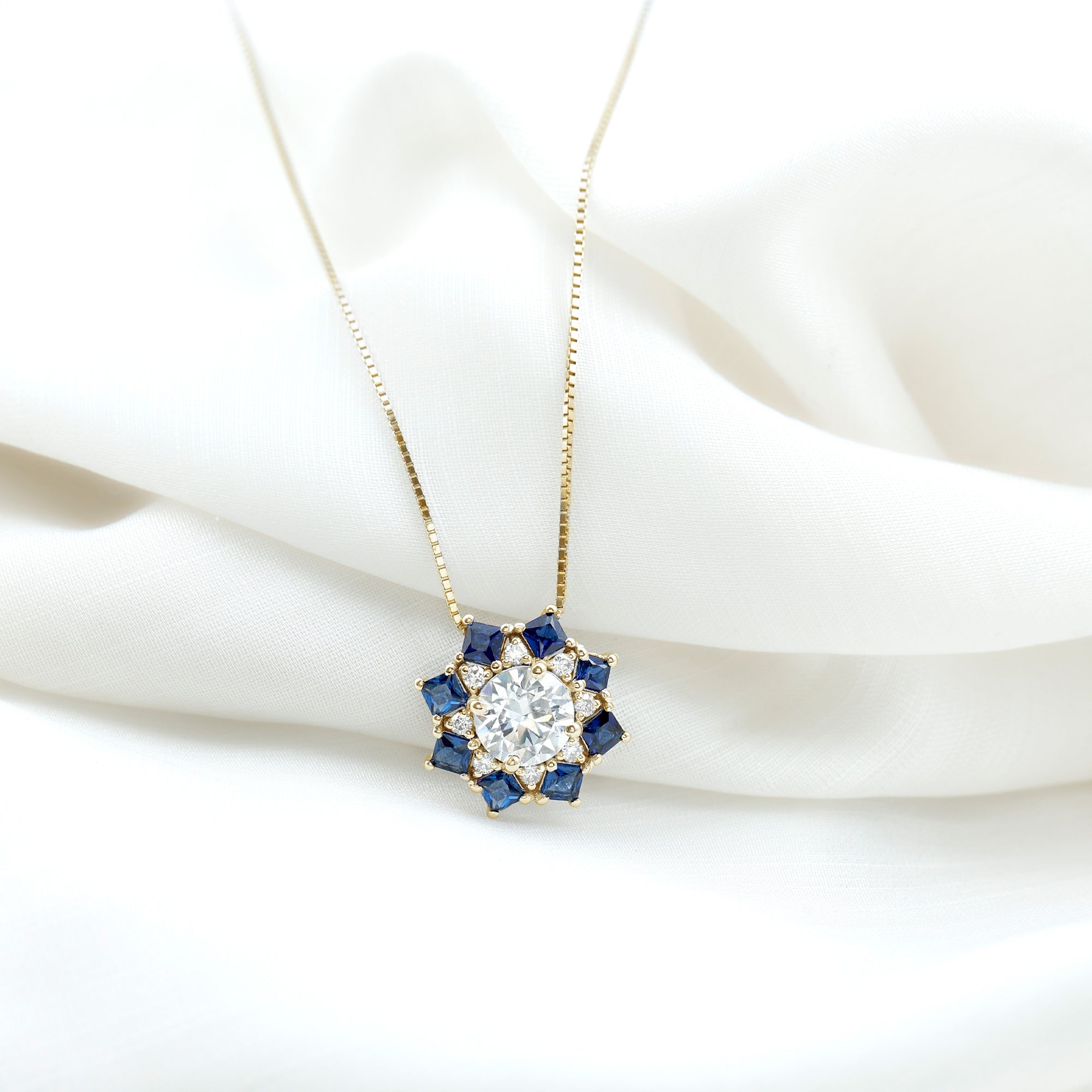 Elevate your fashion game with this Vintage Style Necklace, a perfect blend of classic charm and contemporary appeal. At its heart, a stunning 8 MM round cut lab-grown diamond is beautifully showcased in prong setting, surrounded by a dazzling halo of princess cut blue sapphires and smaller round diamonds, resulting in an enchanting shimmer. This Diamond Pendant Necklace adds a refined touch of elegance and glamour to any outfit that will be admired for years to come. It makes a heartfelt gift for anniversaries, birthdays, Valentines Day or just to remind someone special that your love for them knows no limits. Designed by Rosec Jewels, this Halo Pendant Necklace is more than just jewelry, it is a promise of forever.