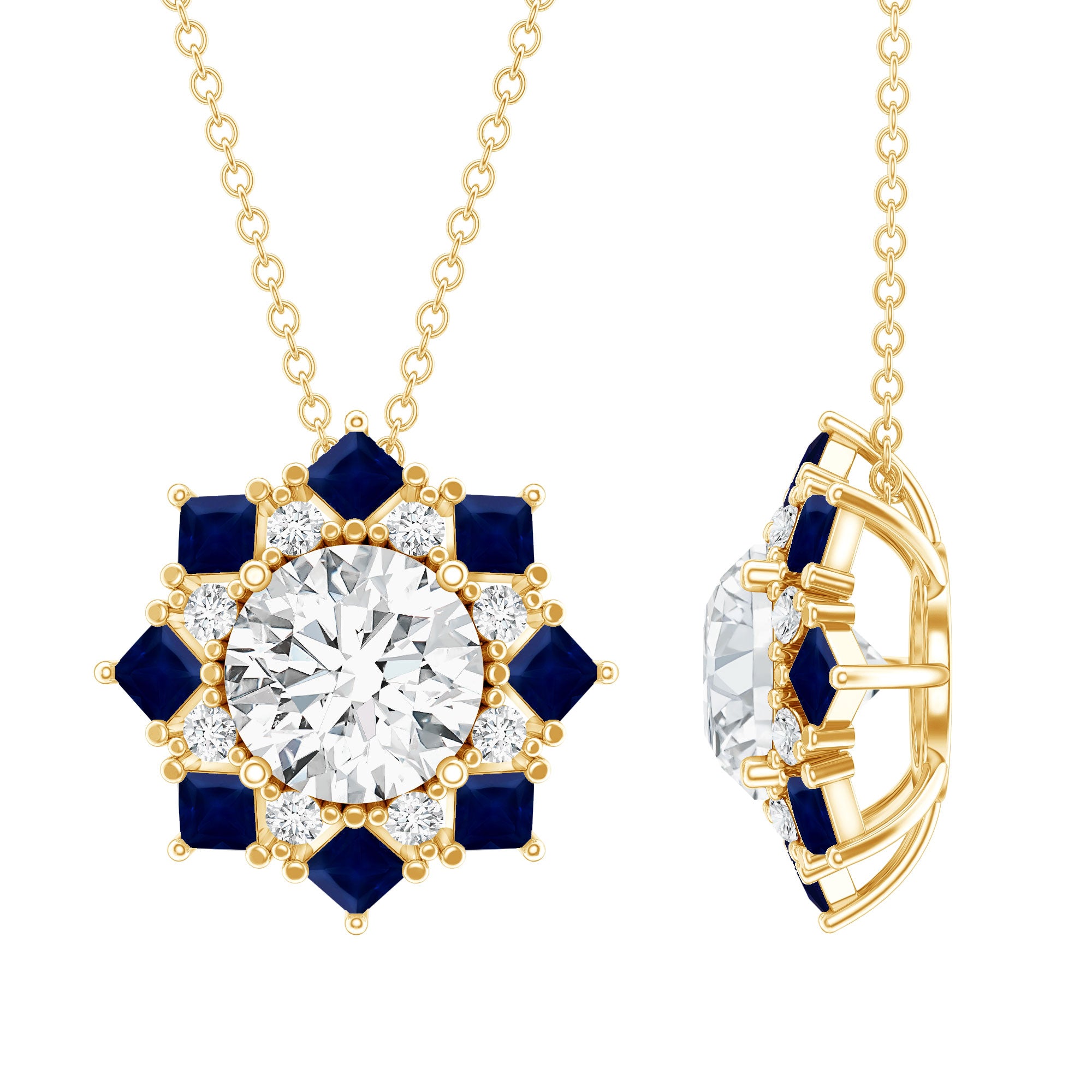 Elevate your fashion game with this Vintage Style Necklace, a perfect blend of classic charm and contemporary appeal. At its heart, a stunning 8 MM round cut lab-grown diamond is beautifully showcased in prong setting, surrounded by a dazzling halo of princess cut blue sapphires and smaller round diamonds, resulting in an enchanting shimmer. This Diamond Pendant Necklace adds a refined touch of elegance and glamour to any outfit that will be admired for years to come. It makes a heartfelt gift for anniversaries, birthdays, Valentines Day or just to remind someone special that your love for them knows no limits. Designed by Rosec Jewels, this Halo Pendant Necklace is more than just jewelry, it is a promise of forever.