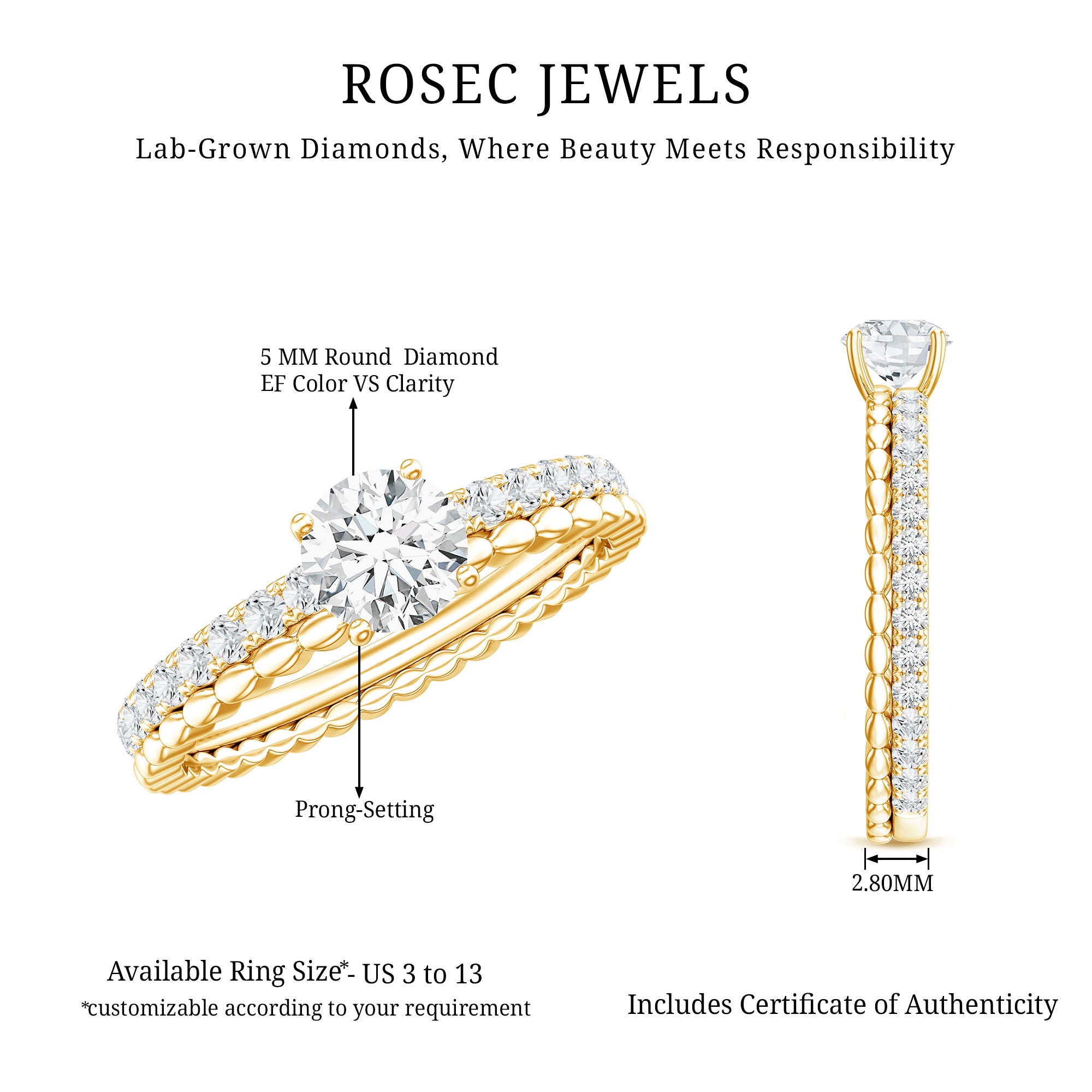 This Solitaire Diamond Engagement Ring is the perfect finishing touch for those moments when love is in the air, designed to radiate timeless beauty. At the heart of this Solitaire Ring, a 5 MM round lab-grown diamond takes center stage, securely held in prong setting. To enhance its elegance, the unique band features two rows one is adorned with round cut diamond side stones and the other one is made of plain metal in a designer pattern that complement the main diamond beautifully and giving this beauty a stackings rings like appearance. This Lab Grown Diamond Ring for Women comes with a certificate of authenticity and a signature jewelry box, allowing you to keep your ring safe when it is not being worn. With options for customization, you can make this Round Engagement Ring truly unique. Add a touch of sparkle to your style with our handcrafted jewelry, made with precision and passion. All EF-VS quality diamonds are lab-grown, and this Promise Engagement Ring includes a certificate of authenticity to guarantee you get excellent value for your investment. Delight your future bride with this gorgeous ring, and see her eyes light up with joy and happiness.