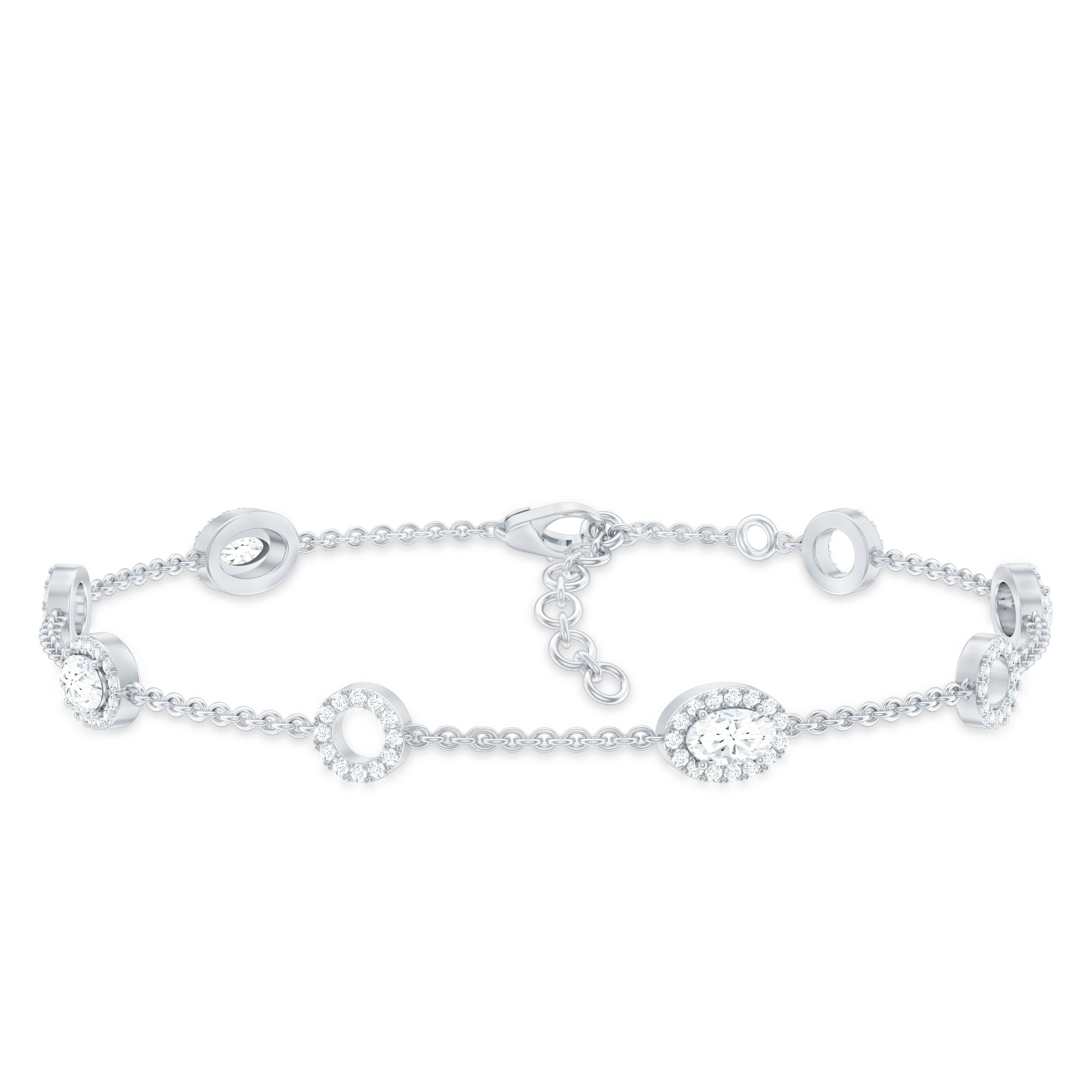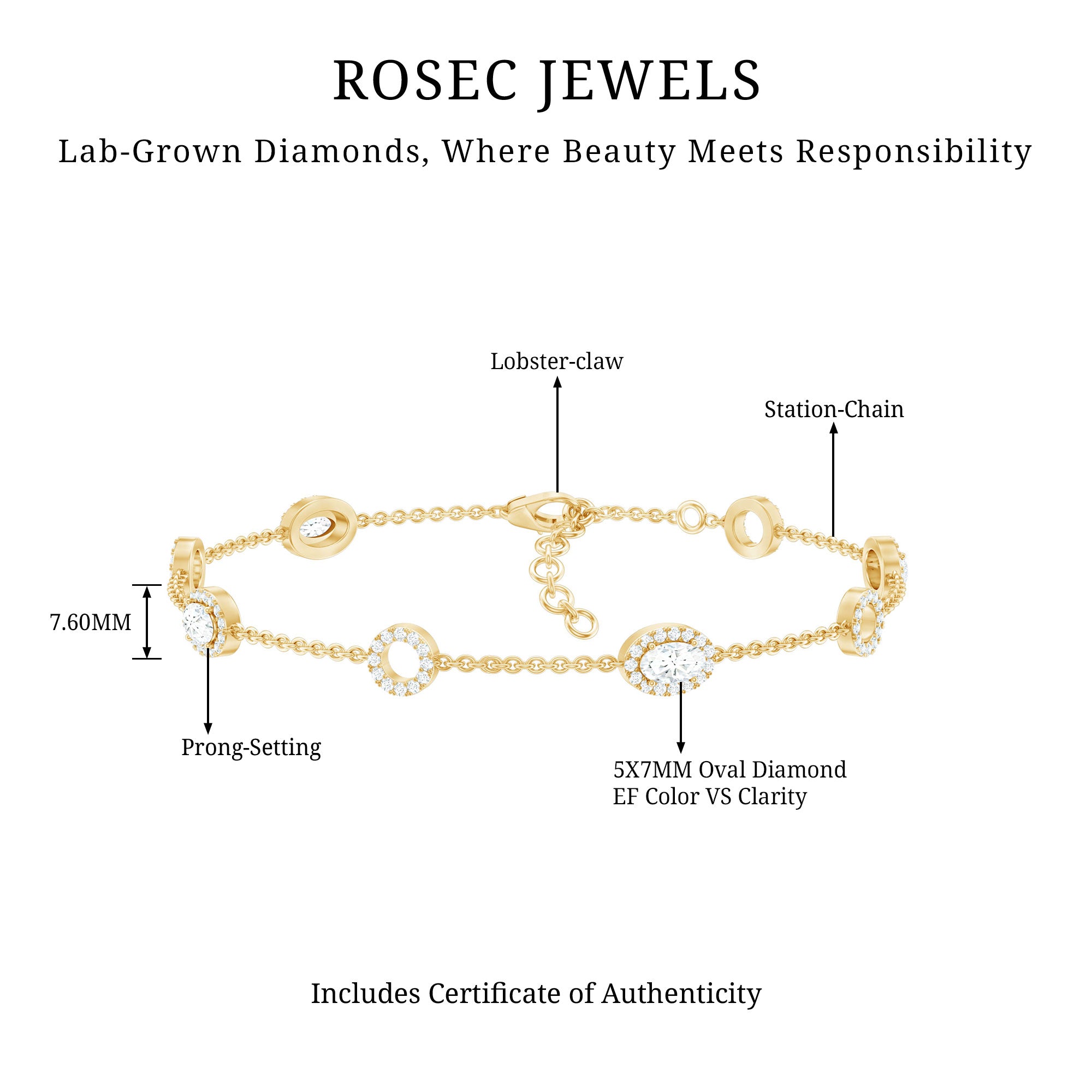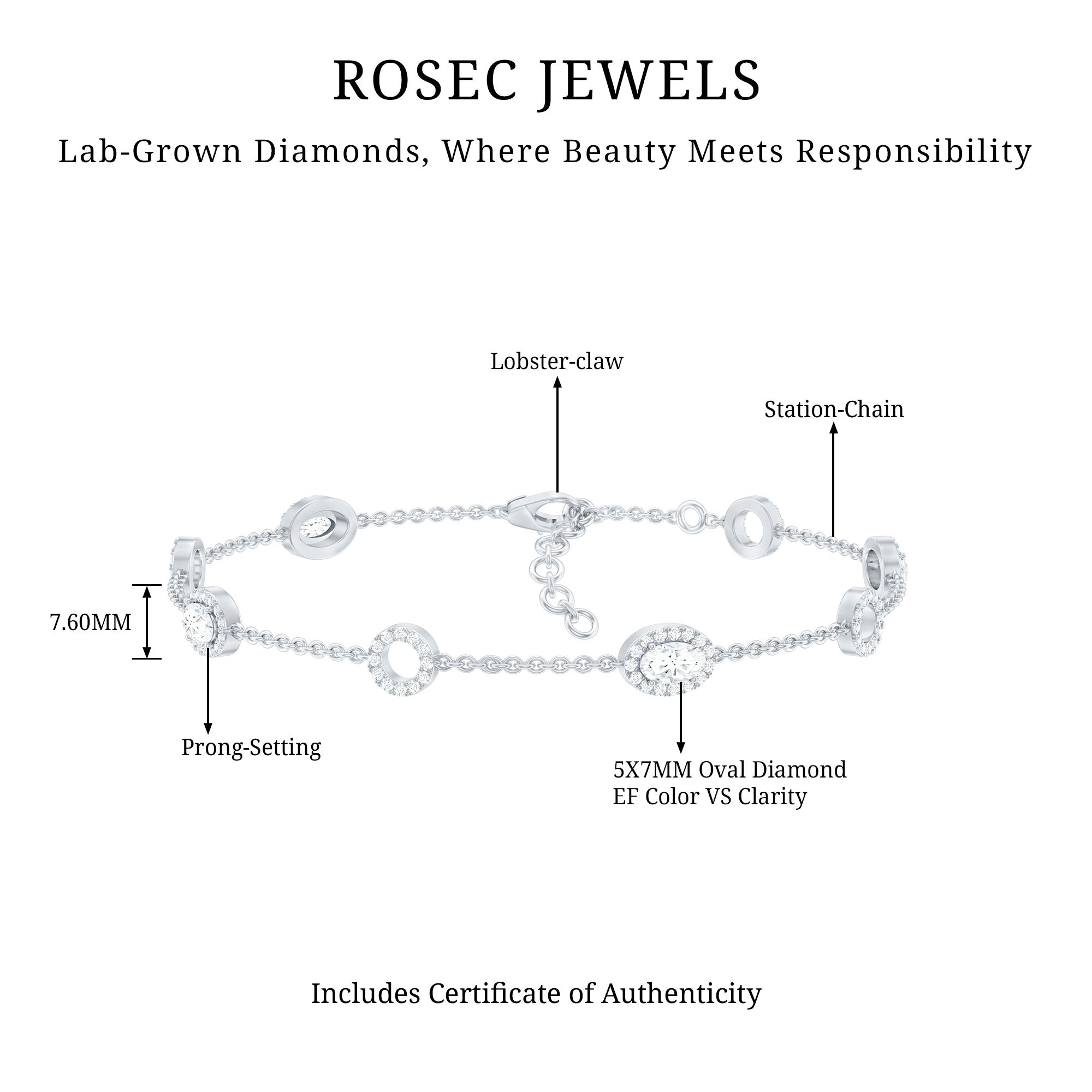 Strike out a wonderful statement on any special occasion by wearing this Halo Bracelet featuring 5x7 mm Oval Shape Diamond gemstones set in a prong setting and encircled by a Halo. This Lab Grown Dimaond Bracelet boasts Open Circle Design, adorned with shimmering gemstones, creating a sophisticated and timeless allure. The Lobster Clasp Closure ensures a secure fit. Embrace elegance with Rosec Jewels, where innovation meets beauty in every piece. This Wedding Bracelet makes an ideal gift for your lady love, perfect for celebrating the love and connection you share. Simple, yet stunning, this Ef-Vs quality Diamond Chain Bracelet will make her feel truly loved and appreciated.