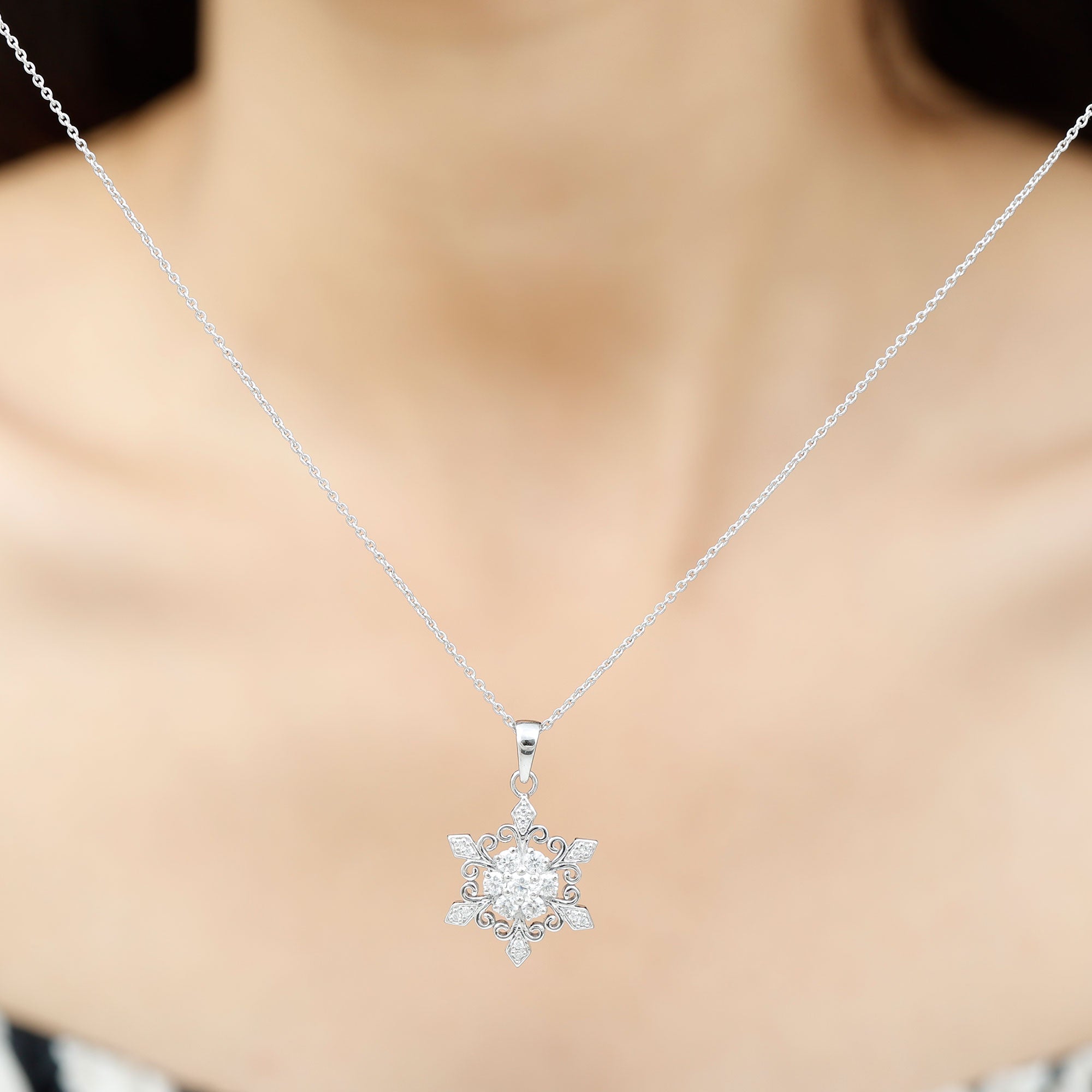 Captivating and full of charm, this Snowflake Pendant brings a fresh sparkle to your jewelry collection. Inspired by the delicate beauty of real snowflakes, this Fine Pendant is designed to shine with graceful detail. Each angle of the snowflake is carefully crafted and adorned with shimmering Round Shape Lab Grown Diamond stones, giving it an elegant glow that catches the light beautifully. Made with EF-VS Quality Lab Diamond stones, this necklace reflects the same brilliance and clarity as natural stones, but with a more thoughtful and eco-friendly touch. The snowflake design is eye-catching, making this Lab Grown Diamond Necklace perfect for everyday wear or dressing up for special occasions. Suspended on a fine chain, the snowflake sits gracefully at the neckline, adding a subtle sparkle that feels timeless and winter-kissed. Whether you are gifting it to someone special or adding it to your collection, this Lab Diamond Necklace is a lovely way to express your unique style, beautifully captured in a stunning snowflake. Presented in a beautiful jewelry box, this Lab Created Diamond Pendant is ready to become a favorite piece in any wardrobe. Elegant, meaningful, and easy to wear, this Diamond Snowflake Necklace (Lab Diamond) adds a little magic to every moment.