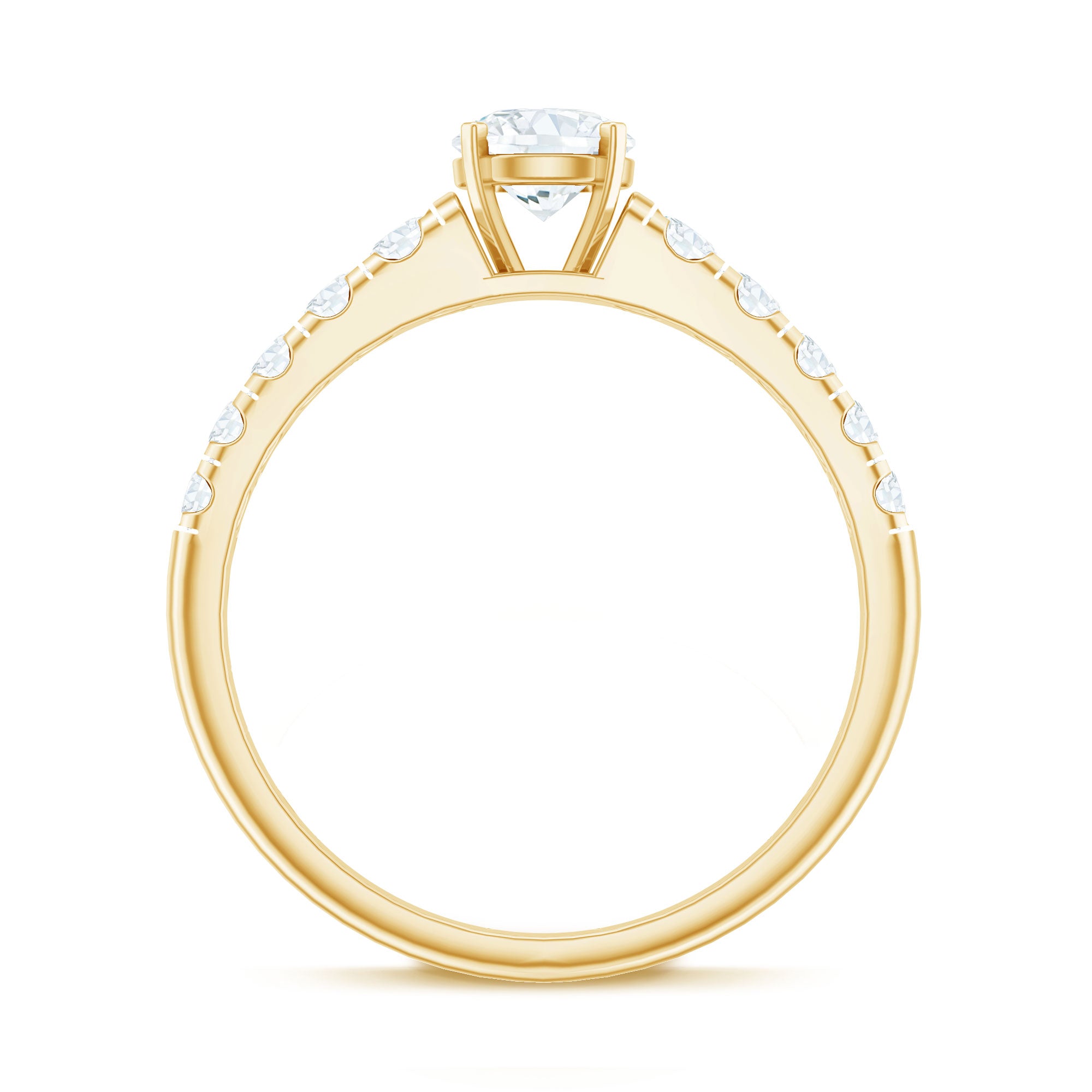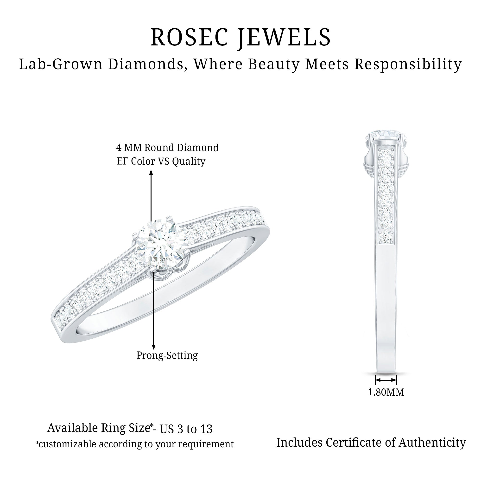 Your search for the Best Engagement Ring ends here. This stunning Solitaire Ring features a dazzling 5 mm round shaped lab grown diamond of Ef-Vs quality set in prong setting at its center. The round cut diamond side stones grace the band with their brilliance. This Diamond Engagement Ring is an absolute showstopper thatll make your special day unforgettable, and the gemstone will catch everyones eye and leave them wondering where you got such a stunning piece. Our Side Stone Ring comes in the appropriate packaging ensuring it is ready for presenting upon arrival.