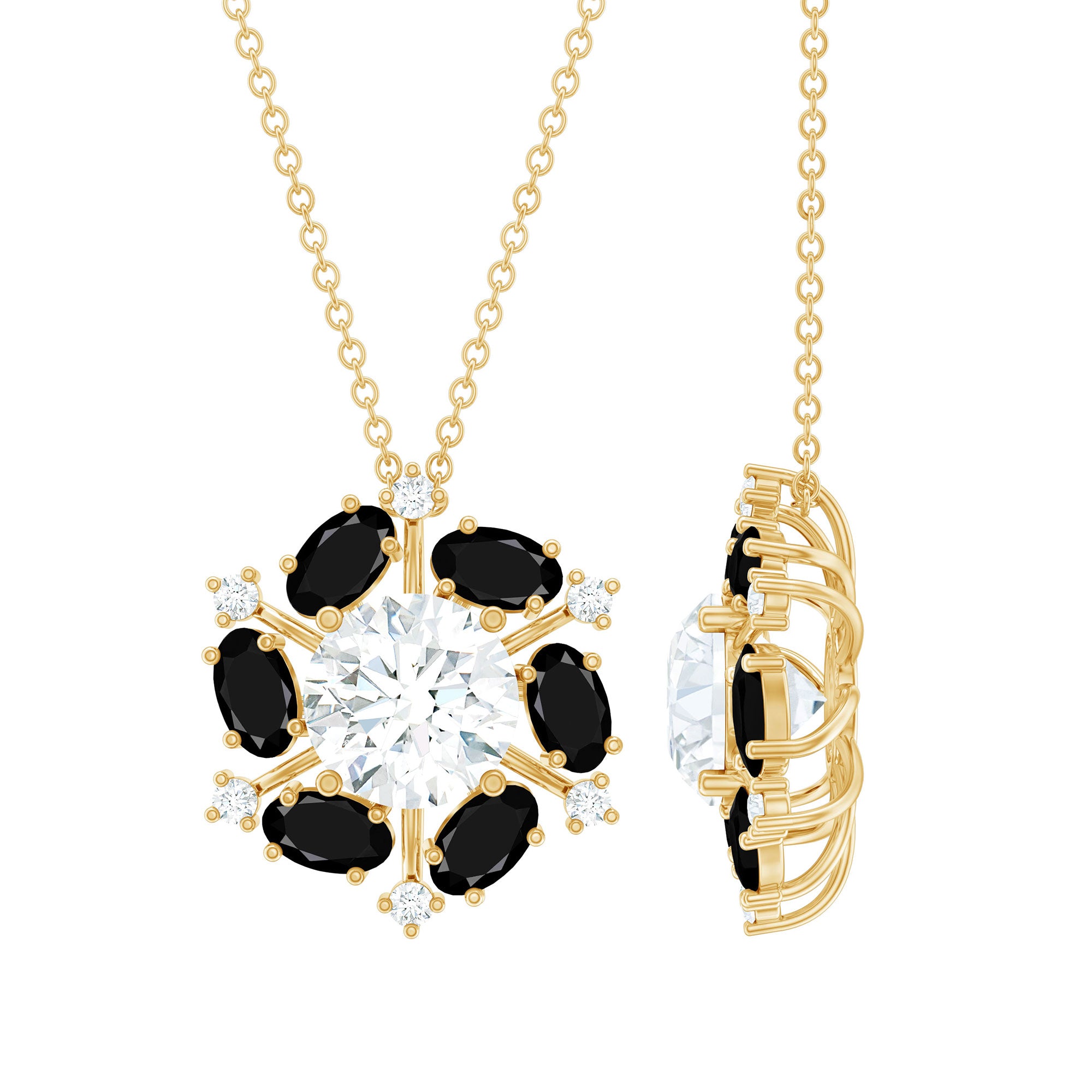 Make a bold statement of elegance with our Diamond Pendant Necklace, where timeless brilliance meets modern sophistication. This stunning Monochrome Necklace features a 2 Carat Diamond of round shape, responsibly sourced and ethically made in a lab. Surrounding it, oval shaped black onyx and round cut diamonds create a striking contrast, giving this Statement Flower Necklace a bold and classy look. The Diamond and Onyx Necklace has the perfect touch of contrast, making it ideal for any outfit. It is ideal for events like weddings, parties, or formal dinners, where you want to stand out with timeless beauty.