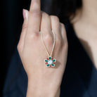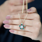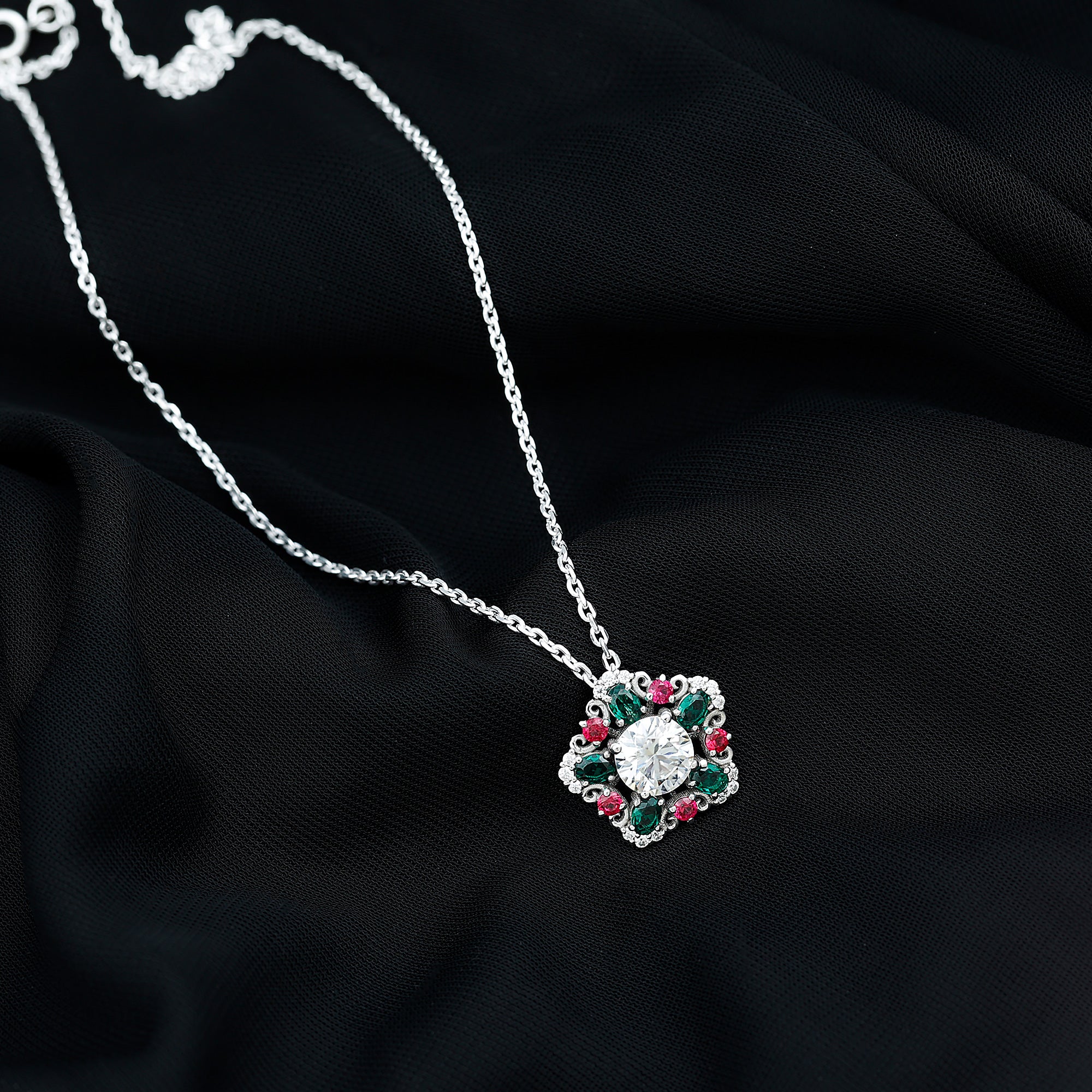 The Diamond Floral Necklace represents a timeless and elegant addition to any jewelry collection, radiating a sense of feminine allure. Its exquisite flower motif is designed to attract attention and admiration. The Cocktail Necklace features a breathtaking array of various gemstones, resulting in a captivating visual display. At its heart lies an 8 MM Round Shape lab-grown Diamond, securely held in prong setting. Additionally, the Halo Necklace is adorned with small round rubies, diamonds, and oval-shaped emeralds with vintage-inspired designs that make a bold statement. This sophisticated Floral Inspired Diamond Pendant embodies the beauty of nature and is a perfect expression of your affection. You can have confidence in the quality of our offerings, as each piece is accompanied by a certificate of authenticity.