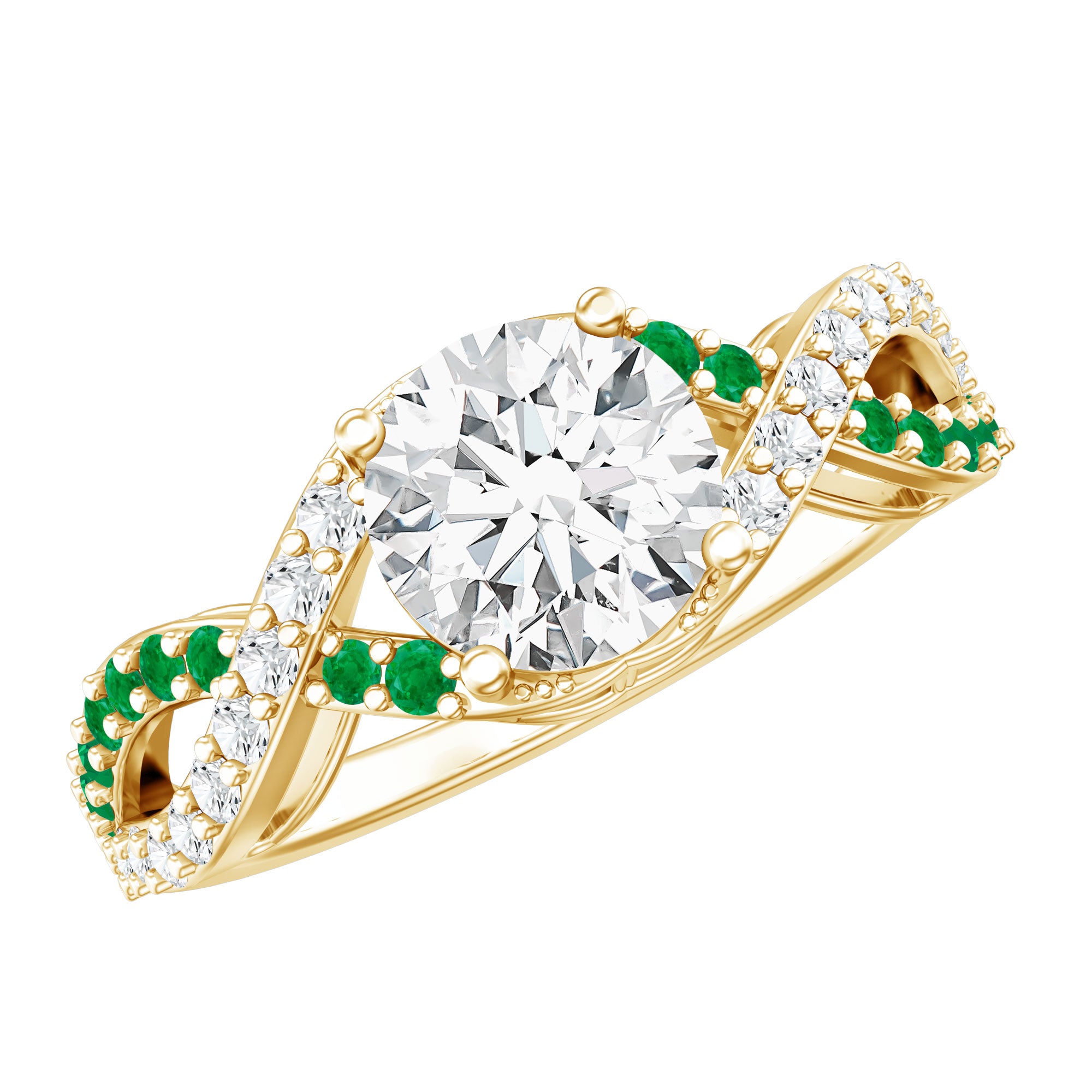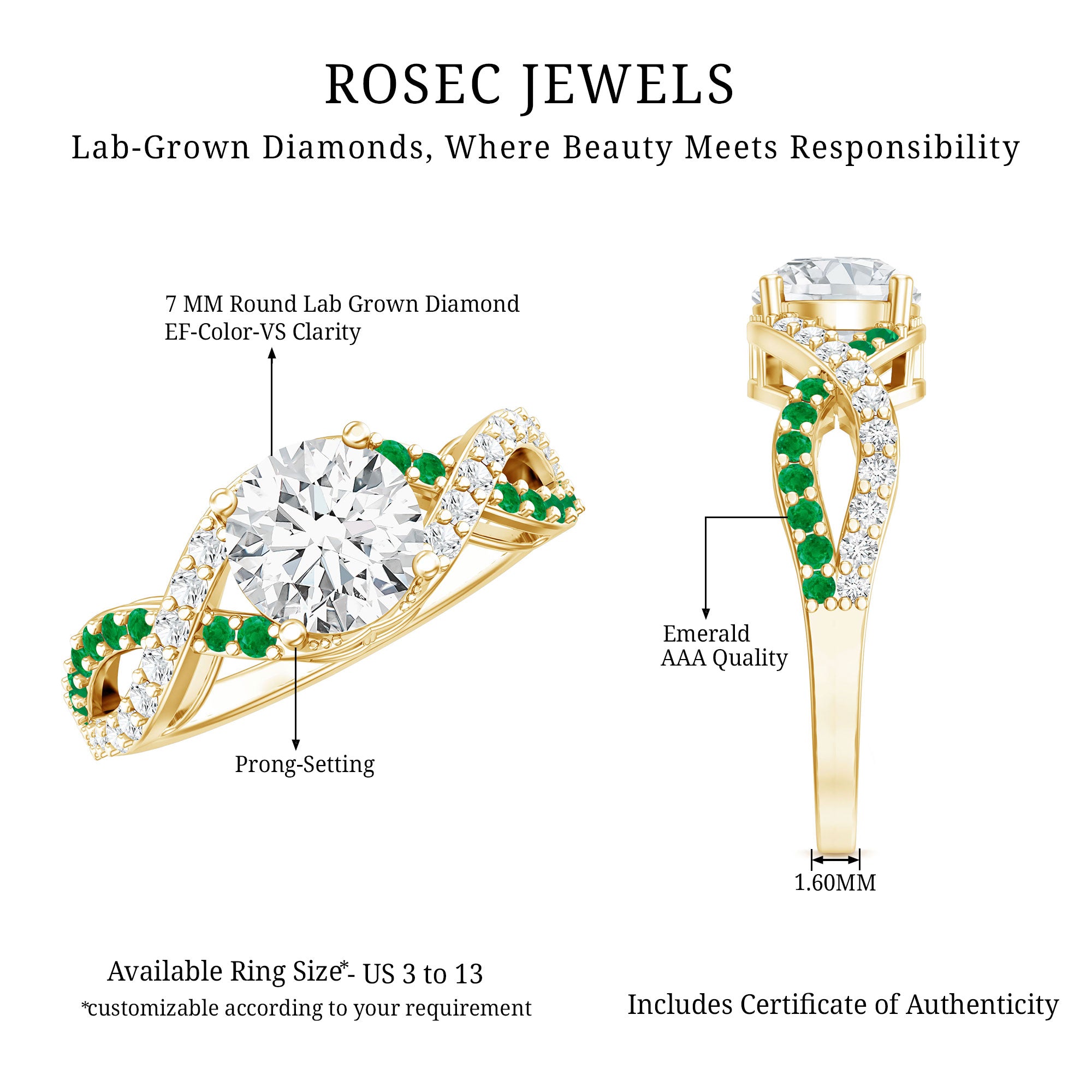 Introducing this stunning Diamond Engagement Ring, a beautiful combination of classic elegance and modern appeal. The band of this Crossover Ring features two strands one is adorned with round cut diamonds while the other one is graced with green emeralds that intertwine beautifully to create a criss cross effect. This playful design draws the eye to a central 7 mm round cut diamond (EF-VS quality ), cradled in a delicate four-prong setting. Charming and stylish, this Round Engagement Ring symbolizes enduring love and showcases refined taste. Its unique twist in design adds a touch of sophistication to this timeless piece. This Diamond and Emerald Ring is a thoughtful and affordable present for your loved one. Made with ethically sourced, lab grown diamonds, it offers the luxury of fine jewelry while being environmentally friendly.