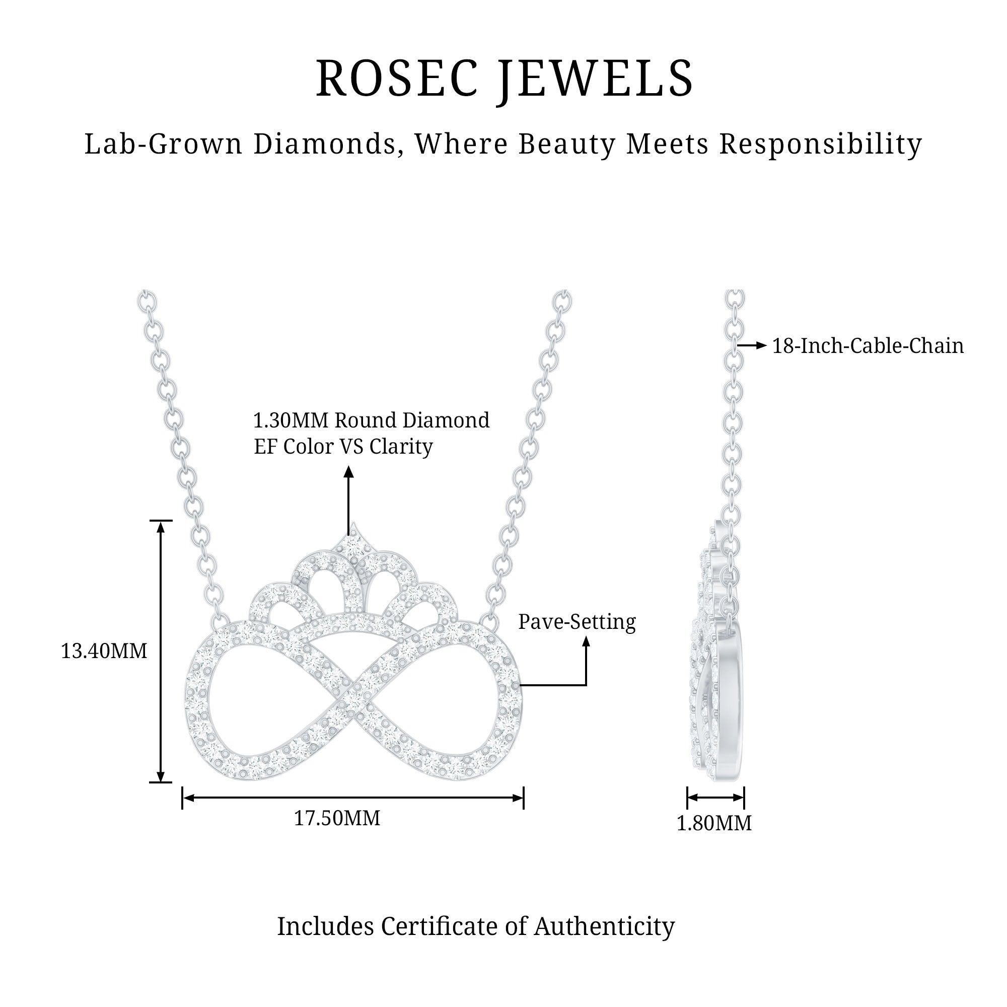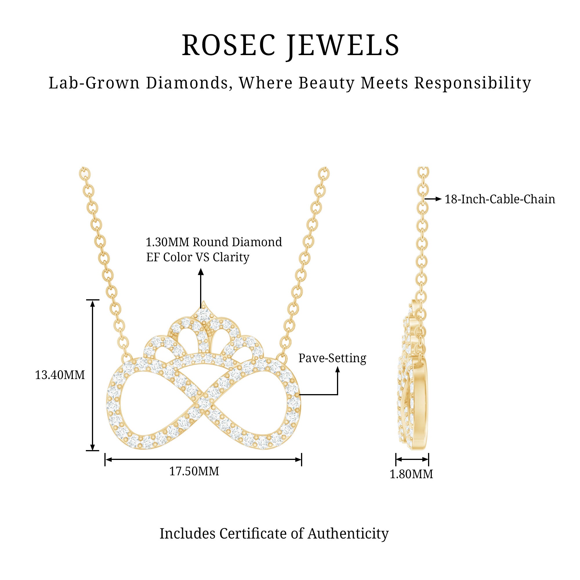 Sparkle meets eternity in this dazzling Infinity Sign Necklace, where every diamond whispers luxury and every curve tells a story of timeless beauty. This Minimalist Necklace has an infinity symbol encrusted with round cut lab made diamonds, representing eternal love and endless possibilities. Adding a regal touch, a delicate diamond-studded crown motif is set at the top of infinity. Not only does this Diamond Necklace exude luxury, but it also reflects a conscious choice, handcrafted with lab grown gemstones, it is eco-friendly and affordable. It is a perfect mix of timeless beauty and royal charm, giving you all the equal sparkle of a mined diamond.