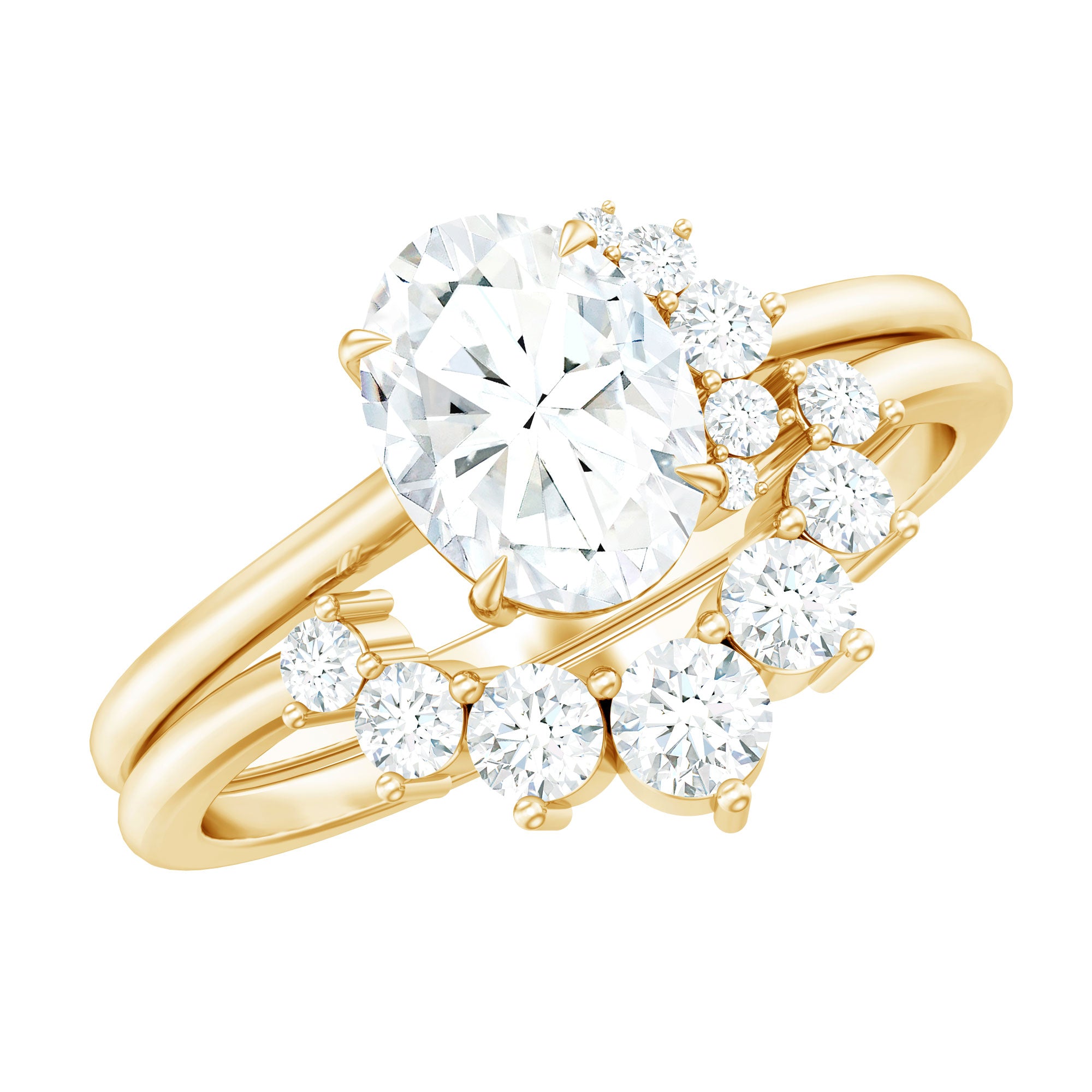 This Lab Grown Diamond Bridal Set is a beautiful symbol of your lifelong commitment, serving as a visual reminder of your bond and the beginning of your never-ending love story. Handcrafted by Rosec Jewels, this Designer Engagement Ring with Band features precious metal and certified lab grown diamond gemstones. The Bridal Ring Set showcases a 6X8 MM oval cut lab grown diamond in a claw setting, complemented by small round diamond gemstones. The Enhancer Guard is adorned with petite round cut lab made diamond gemstones arranged in a graduated style, which enhances the length of the main ring. This Engagement Ring and Wedding Band Set is exactly what you need to shine on your big day. Redefining traditional styles, this Oval Wedding Ring Set features EF-VS Quality diamonds that sparkle beautifully while keeping a classic look. With its designer touches, this Ring Set highlights the natural beauty that represents the essence of your love story, creating a meaningful and lasting symbol of your journey together.