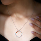 Embrace your neckline with this Lab Grown Diamond Pendant Necklace, handcrafted with 14K White Gold Plated Silver. This Circle Pendant Necklace is embedded with petite round shape Lab Cultured Diamonds secured in a prong setting. This pendant shines with the classic shine of EF-VS quality Lab Created Diamond, which perfectly complements your look for the special day. The pendant dangles with a sturdy cable chain, which perfectly makes it sit on your neckline. This Karma Necklace can be presented to the special one as a token of love. The pendant will be delivered to you in a velvet pouch with the certificate of authenticity.