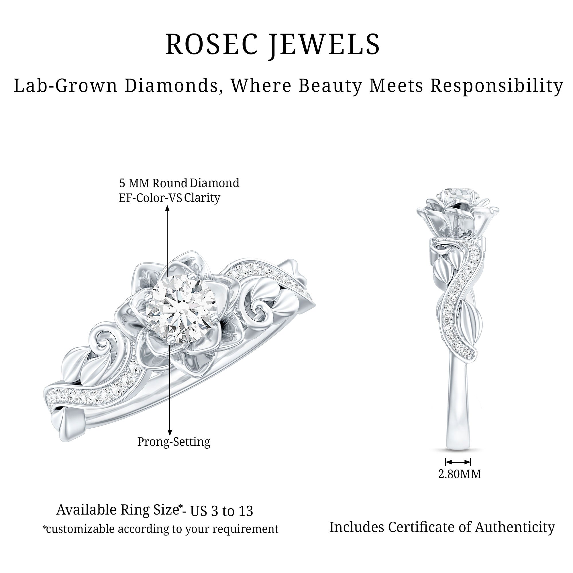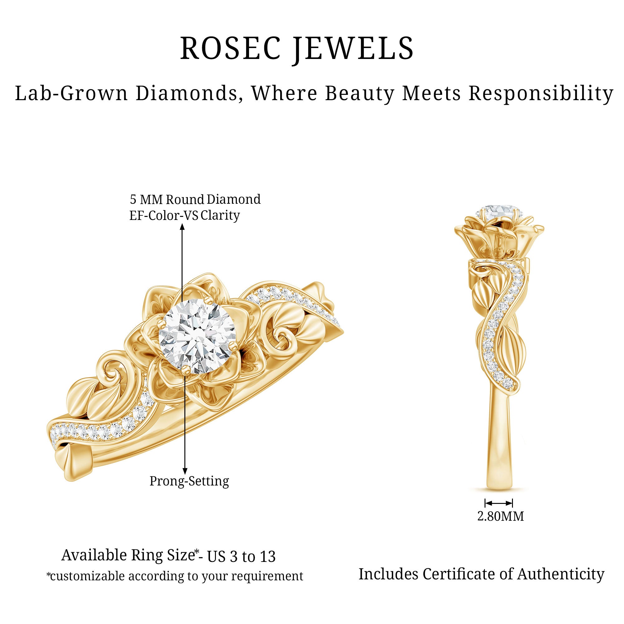This Lab Grown Diamond Engagement Ring is special and unique, adding a brilliant sparkle with its floral design to your big day. It perfectly matches your individual style and is made from certified lab-created gemstones. Featuring a 5 MM round cut lab created diamond set in prongs, it showcases a blooming flower design. The stunning flower petals and metal crafted leaves create a striking effect for this Rose Engagement Ring. A curved line of round brilliant cut diamonds on each side of the shank enhances the rings style. Symbolizing love, this Floral Engagement Ring carries a deep meaning that radiates romance with its classic yet distinctive design, making it sure to be her top pick. If you love nature-inspired jewelry, this Diamond Flower Ring offers a simple yet stylish look that draws attention with its classic charm, giving a rosy effect in its intricate design.