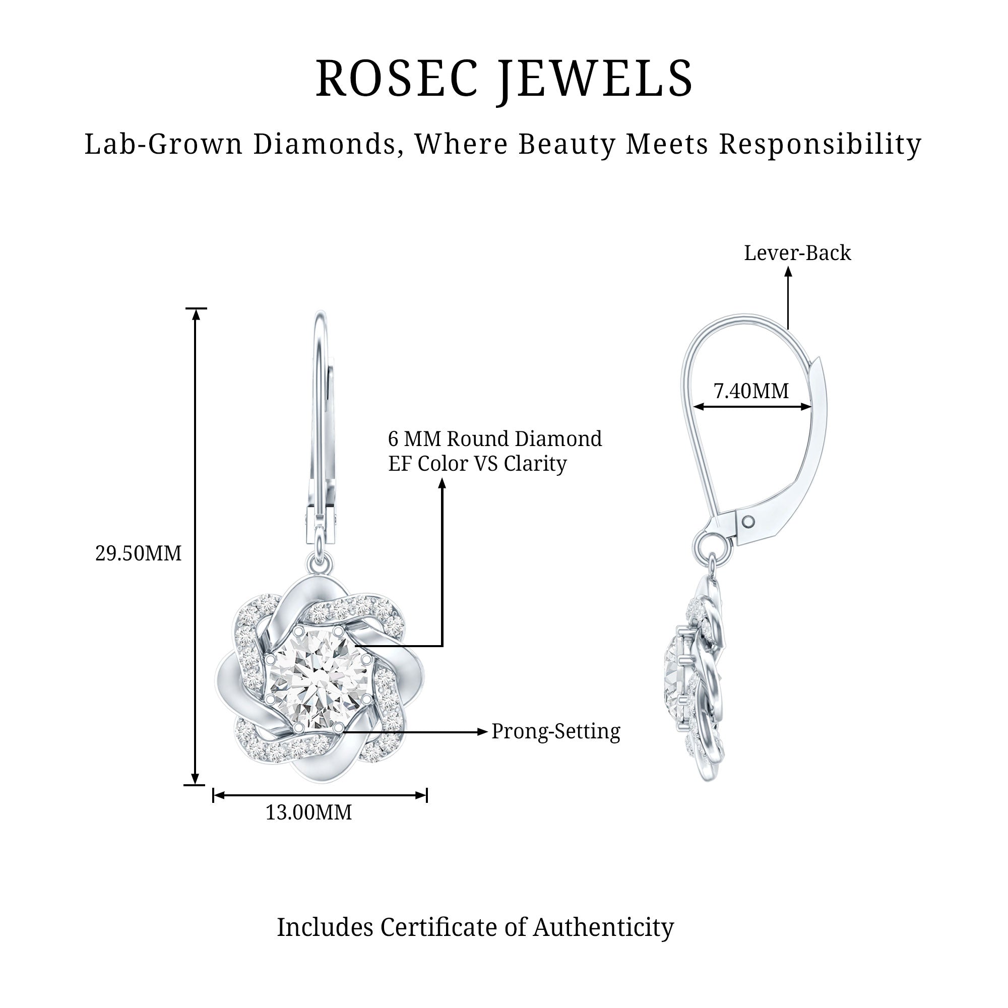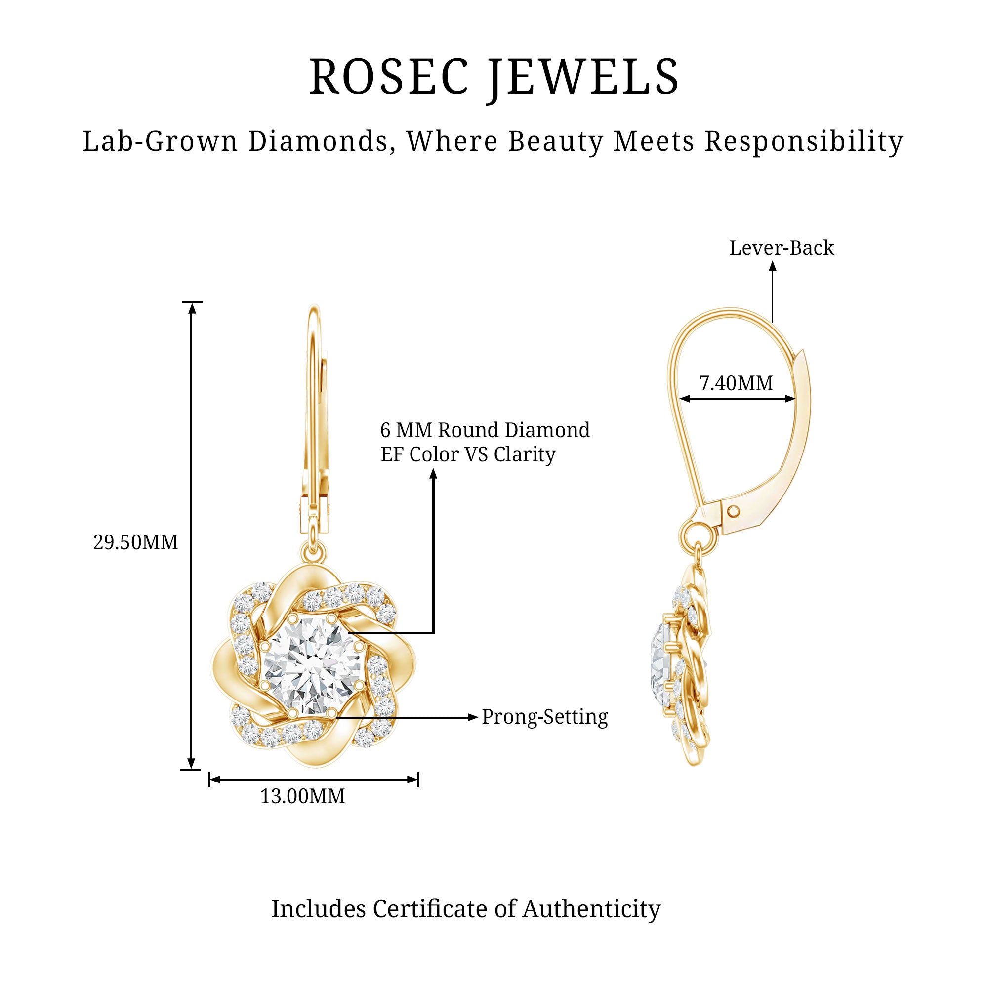 Let your style blossom with these Diamond Drop Earrings, designed to add a touch of natures grace to your jewelry collection. These beauties feature a radiant 6 MM round cut lab grown diamond of EF-VS Quality set in prong setting, surrounded by a floral motif. The intertwined curves of the flower are adorned with smaller diamonds that enhance the overall shimmer. These Flower Dangle Earrings are handcrafted with a secure and comfortable lever back closure, they stay in place allowing you to move with confidence. These Nature Inspired Diamond Earrings are a versatile addition to your jewelry collection, perfect for a wedding, cocktail party, or any grand celebration - wear them and watch every eye in the room turn to you.