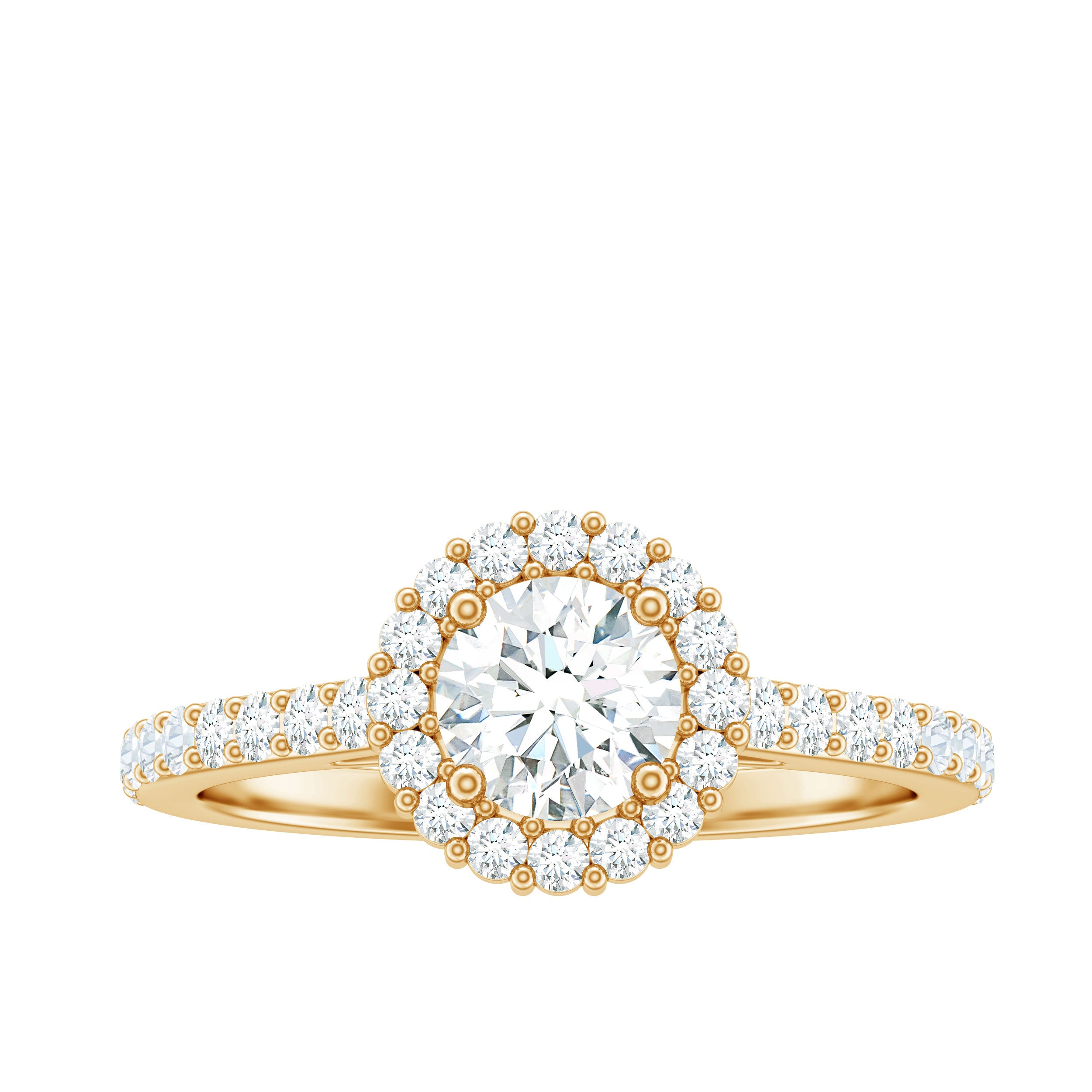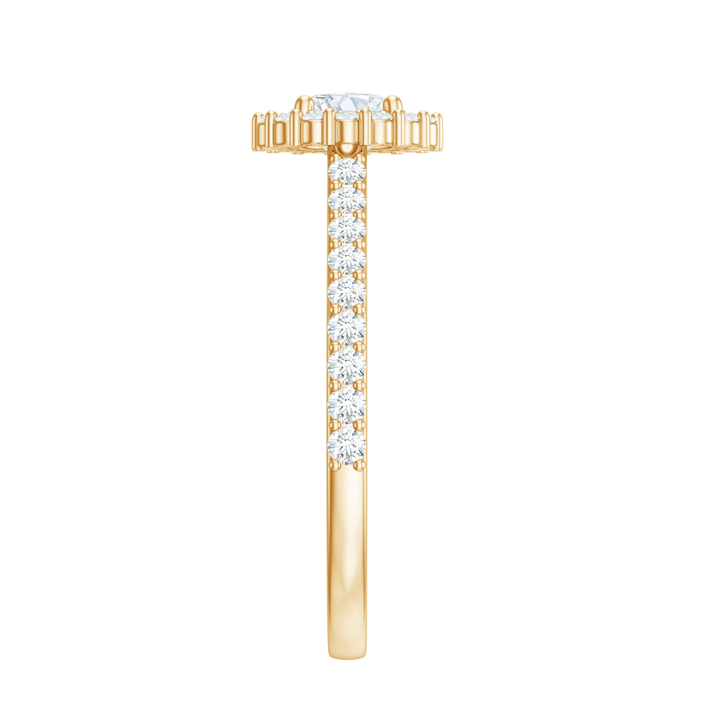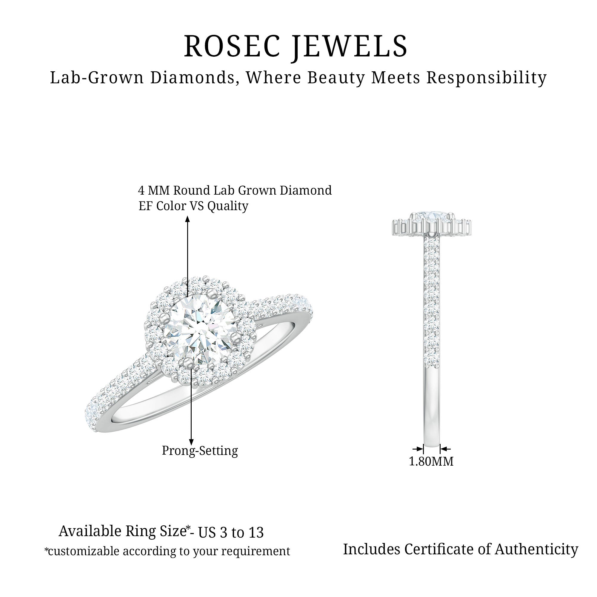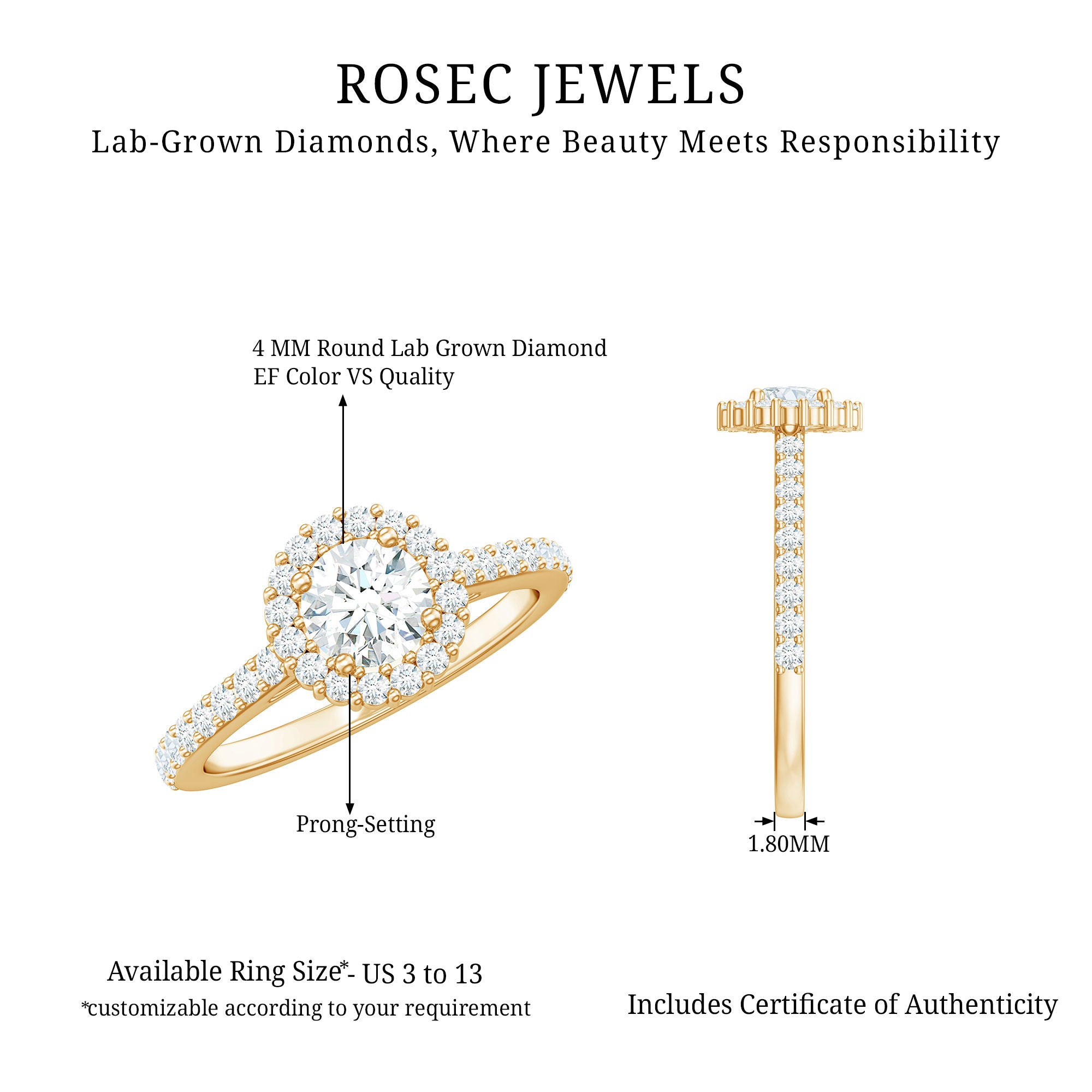 Capture her heart with this exquisite Lab Grown Diamond Engagement Ring. Featuring a delicate 4 MM round center stone surrounded by a halo of shimmering petite diamonds, this Engagement Ring exudes elegance and romance. The beautifully designed shank, adorned with additional round side stones, adds a stunning finish. A perfect symbol of your love and commitment, this Diamond Halo Ring is a cherished piece she will treasure forever. This well-designed Diamond Ring will look amazing on your bride-to-be’s finger and it will be a gift that she will never forget. Choose this Minimalist Ring in the best fit ring size and available metal color and purity variation to make it truly come from your heart.