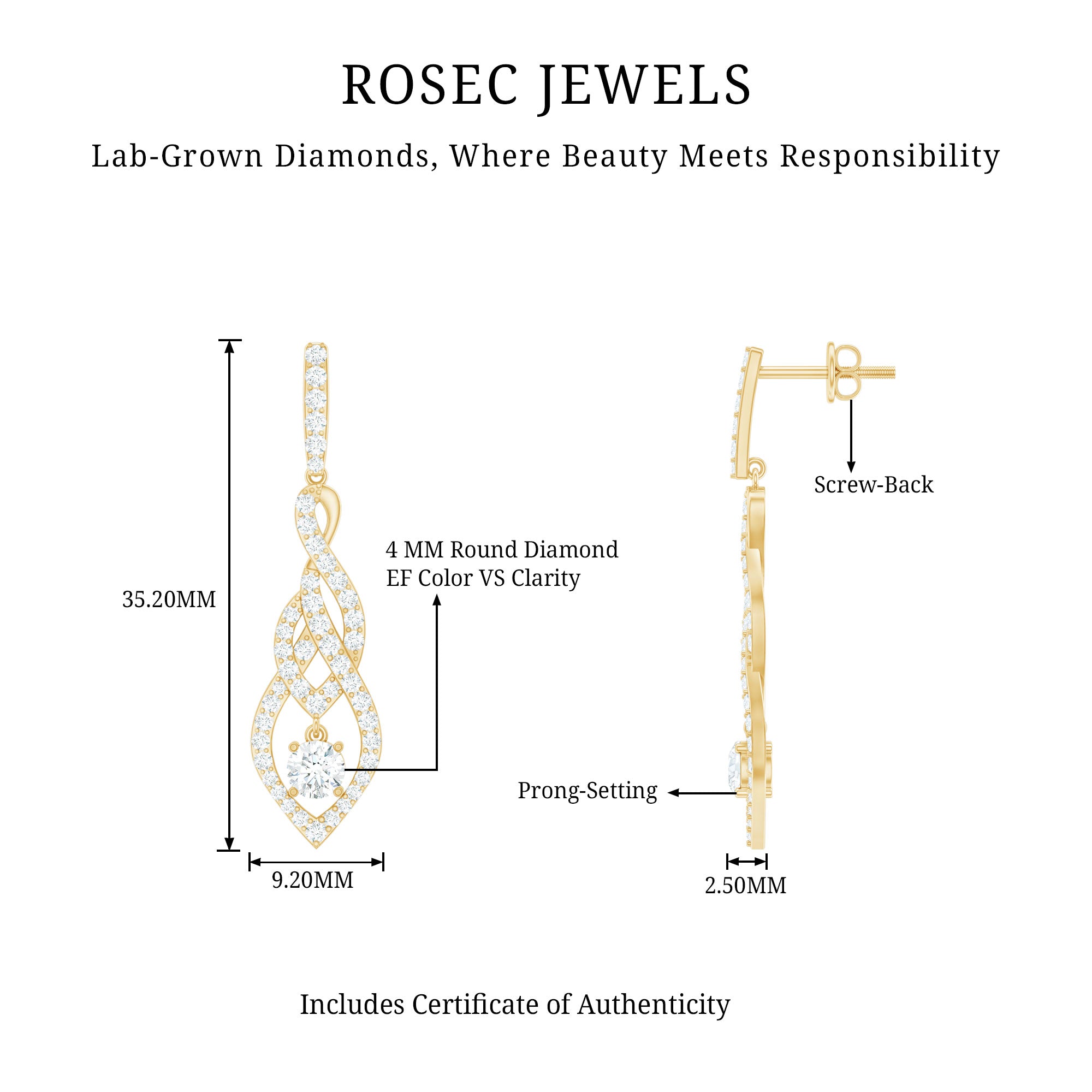 These lab-grown Diamond Earrings are a stunning enhancement to your jewelry collection, featuring exceptional craftsmanship and eco-friendly luxury. The 4 MM round diamond is elegantly set in prong setting, delicately dangling, and highlighted by sparkling small gemstones arranged in a distinctive pattern. With a reliable screw-back closure, these Dangle Earrings embody classic elegance. Ideal for brides, these Diamond Bridal Earrings are a versatile choice for weddings, cocktail parties, or any grand event - wear them and capture everyones attention. Experience ethical luxury with Rosec Jewels, a name that stands for exceptional craftsmanship and innovation.