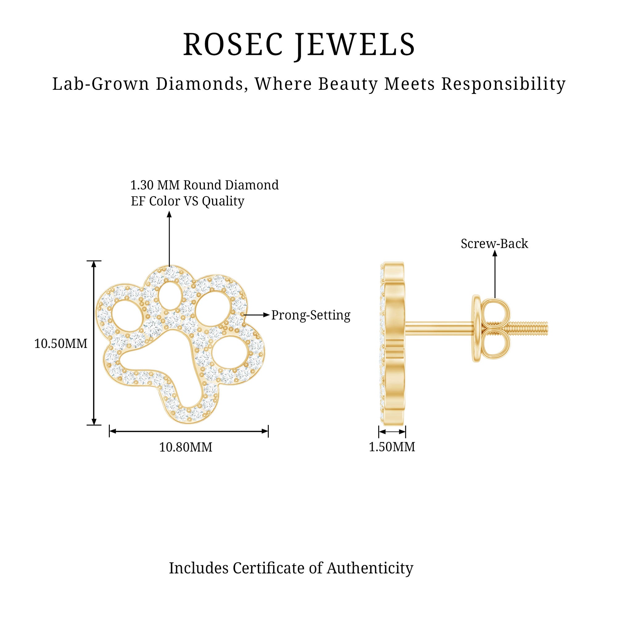 Inspired by your adorable furry pals, check out these Dog Paw Stud Earrings that showcase your love for dogs. These Paw Print Earrings are adorned with round lab grown diamonds securely set in prong setting over a cut open paw design. The Diamond Dog Paw Earrings are not only delicate but also eye-catching thanks to their stunning details. They make a perfect gift for her birthday, graduation, or anniversaries, especially if she loves everything Pawfect. These Diamond Paw Earrings sparkle with EF-VS Quality Lab Grown Diamonds, highlighting exceptional craftsmanship. Grab these Cute Diamond Earrings for her and create a memorable experience. Add a touch of cuteness and pawsitivity to your everyday life with these Diamond Stud Earrings. They are a fantastic way to express your love for furry friends in a delightful manner. The secure Screw Back Closure ensures comfort and confidence, making them a must-have for daily wear. Whether you are heading out for a casual coffee or an elegant evening, these Lab Grown Diamond Studs provide just the right amount of sparkle. Packaged in a lovely jewelry box, they are ready to be gifted or kept for yourself, and these Lab Grown Earrings are designed to match every unique style and occasion.