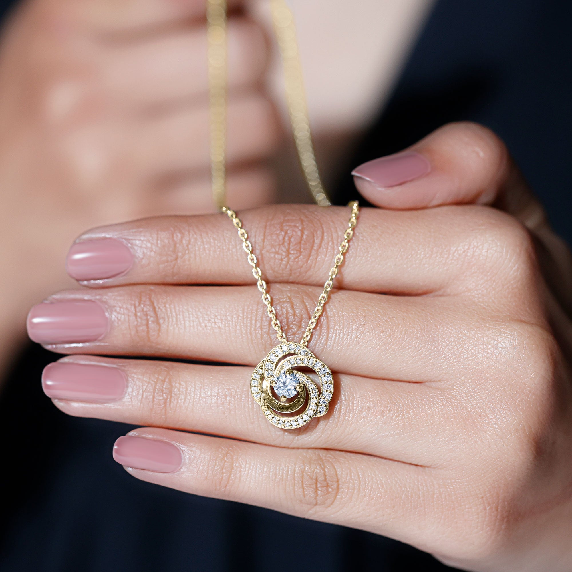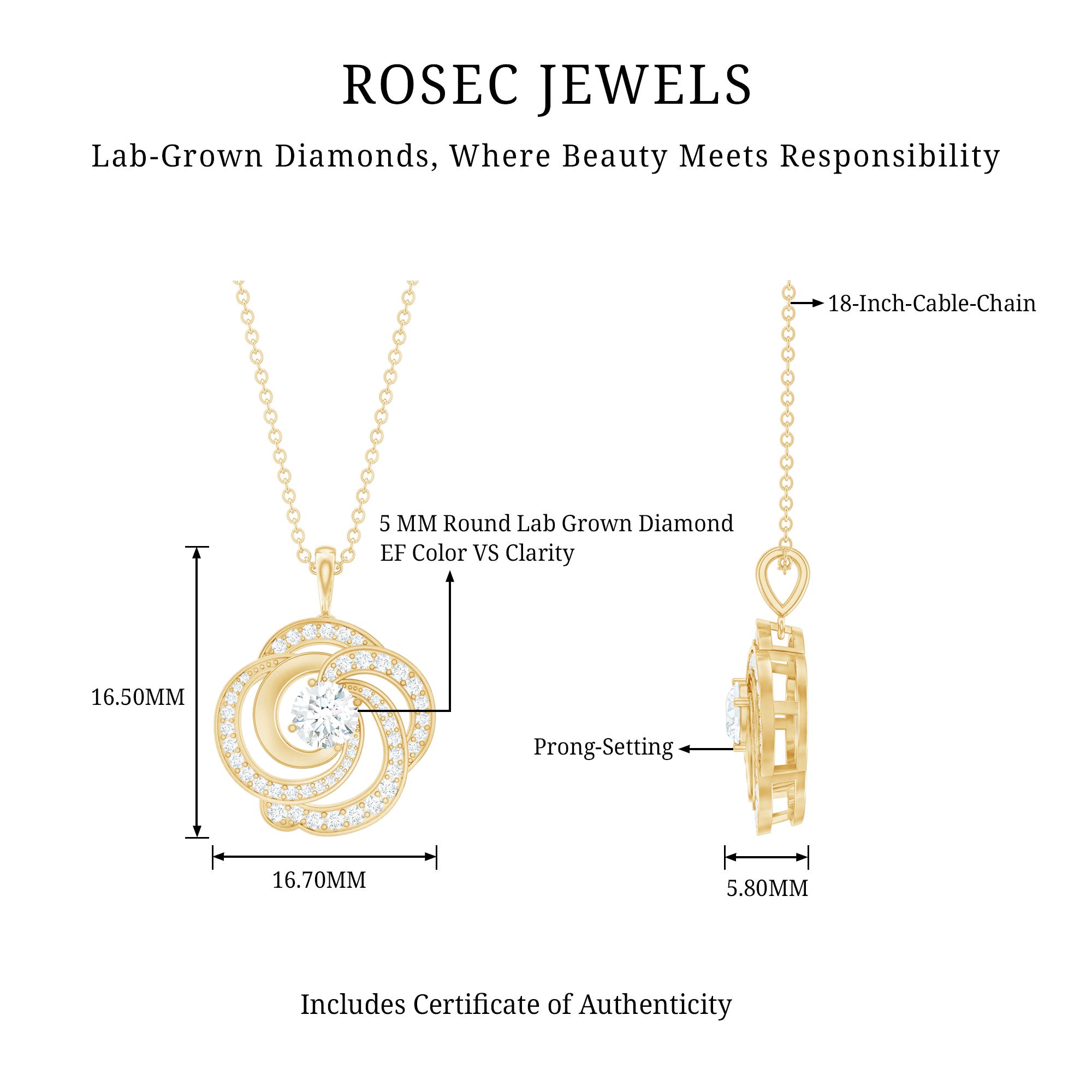 Just like a blooming flower symbolizes love and beauty, this exquisite Diamond Pendant is a radiant expression of elegance and affection. The floral inspired design features gracefully overlapping petals, adorned with shimmering round cut diamonds. At the center, a 5 MM round cut lab grown diamond catches the light with every movement, set in prong setting. The delicate curves and intricate details create a mesmerizing effect, making this Diamond Flower Necklace a timeless addition to any jewelry collection. Perfect for gifting on special occasions, this Floral Pendant Necklace is an ideal choice for anniversaries, birthdays, Valentines Day, or as a heartfelt surprise to celebrate your lady love.