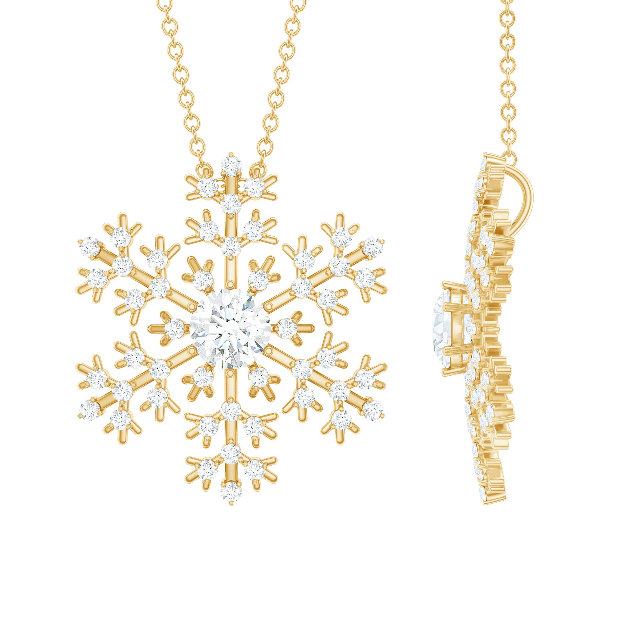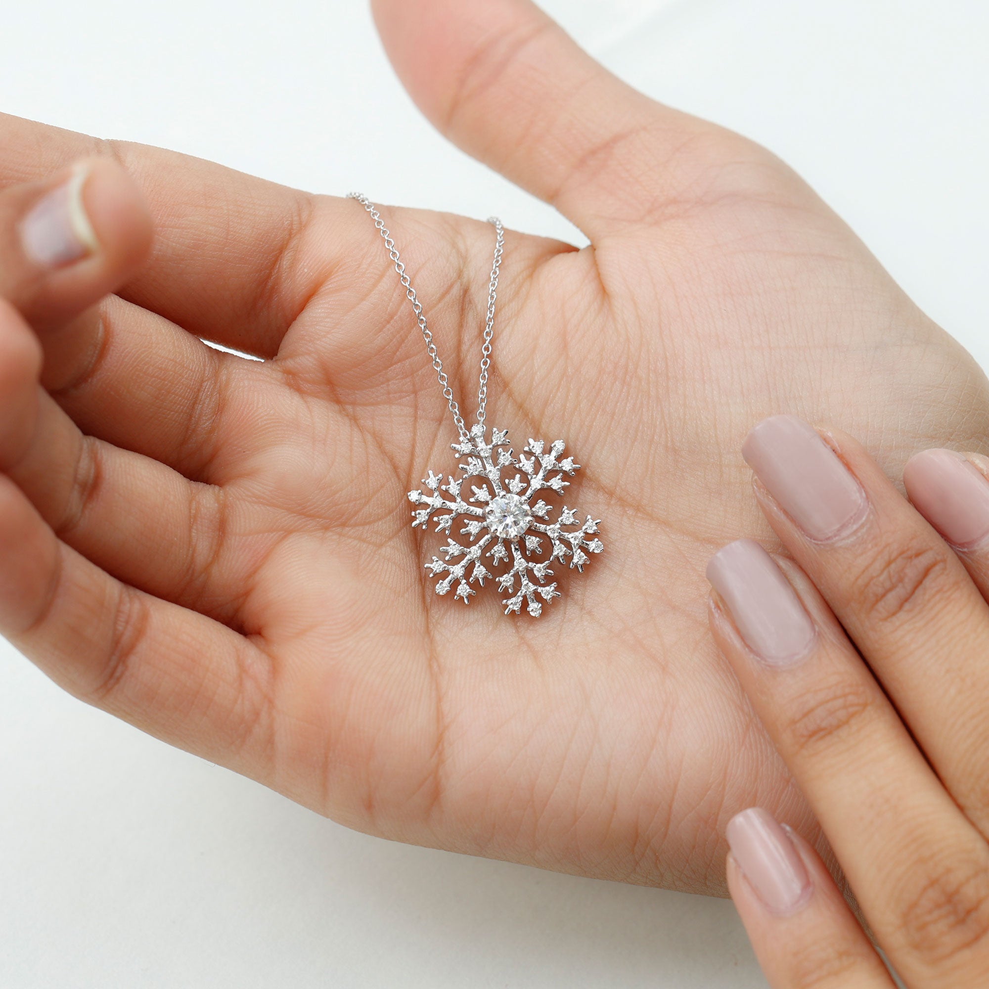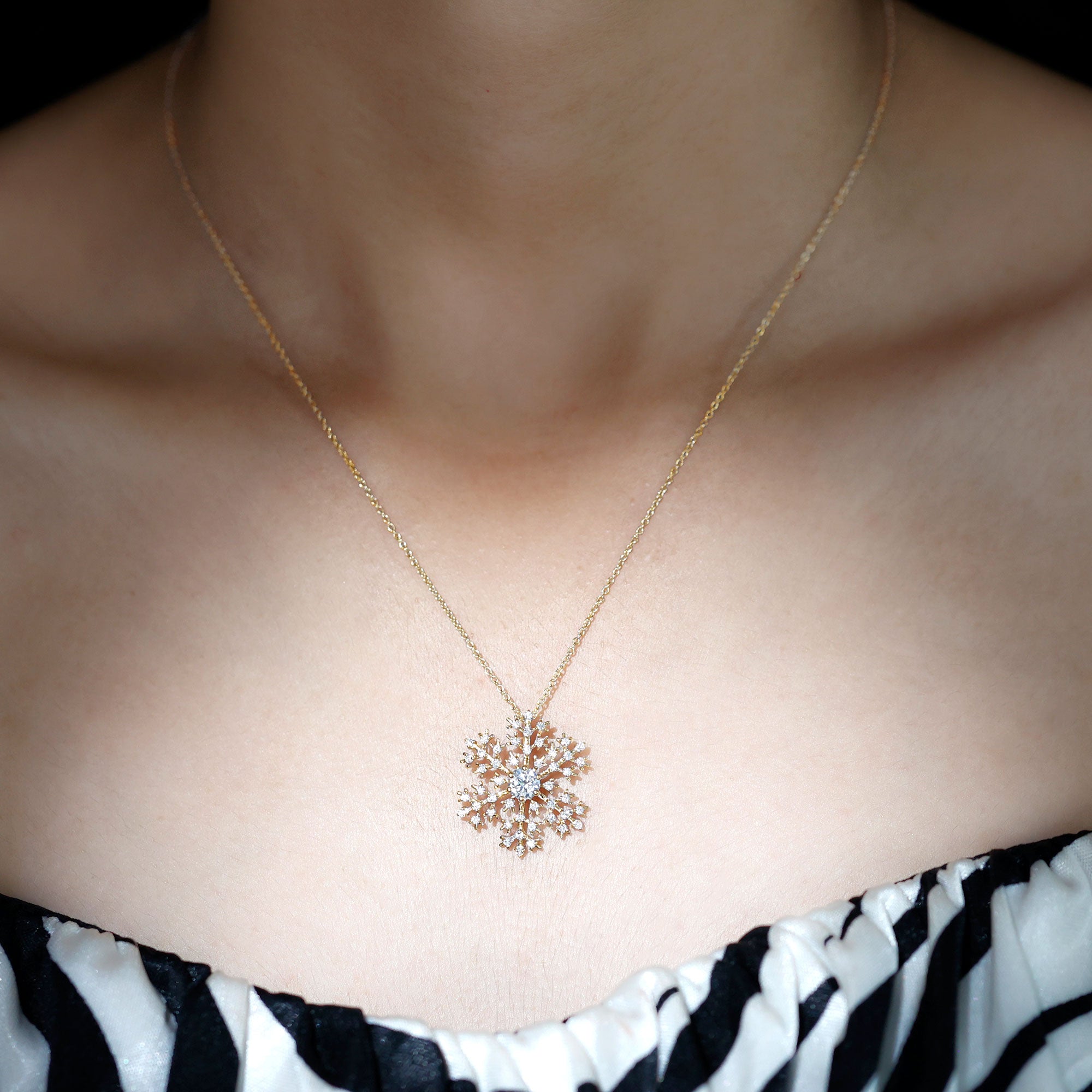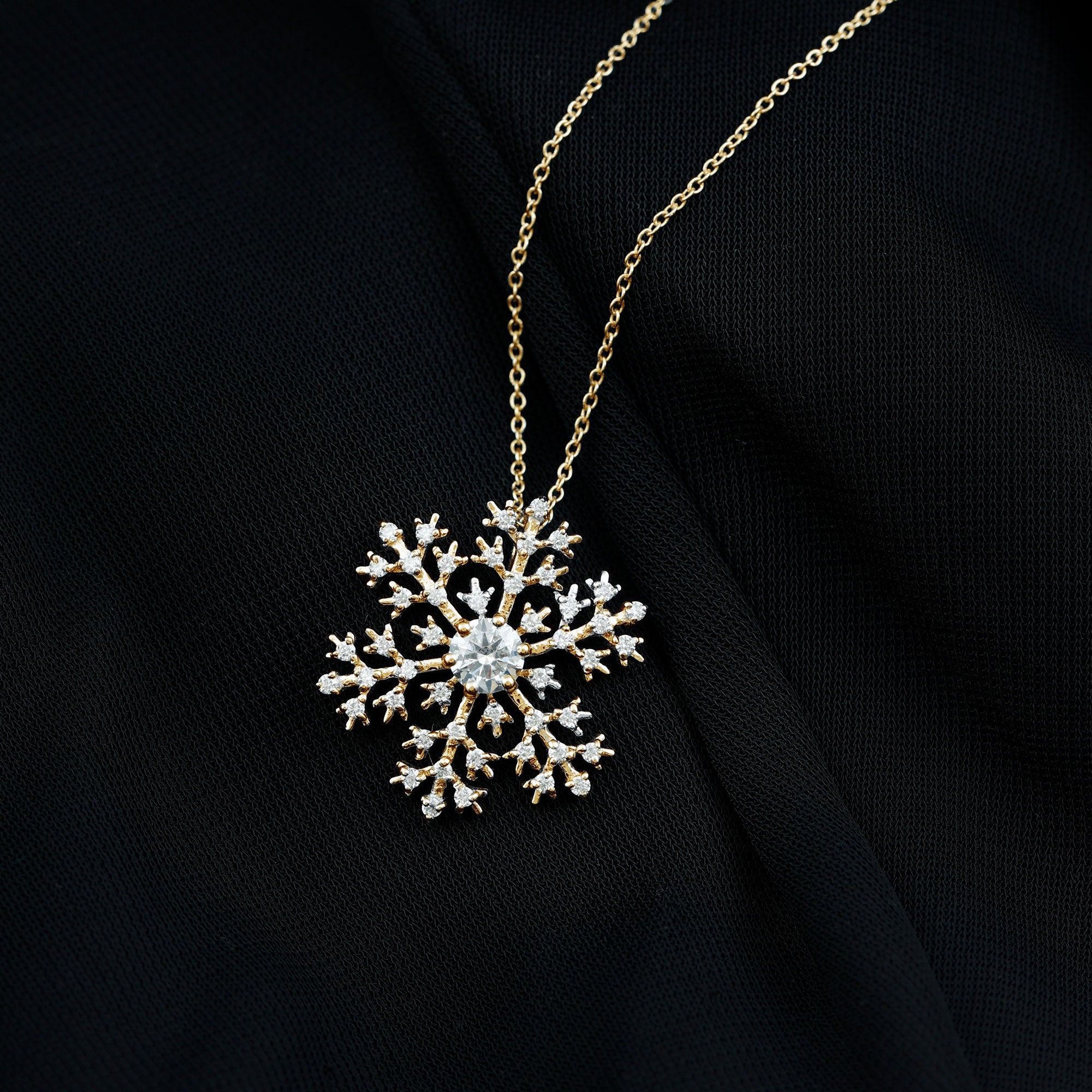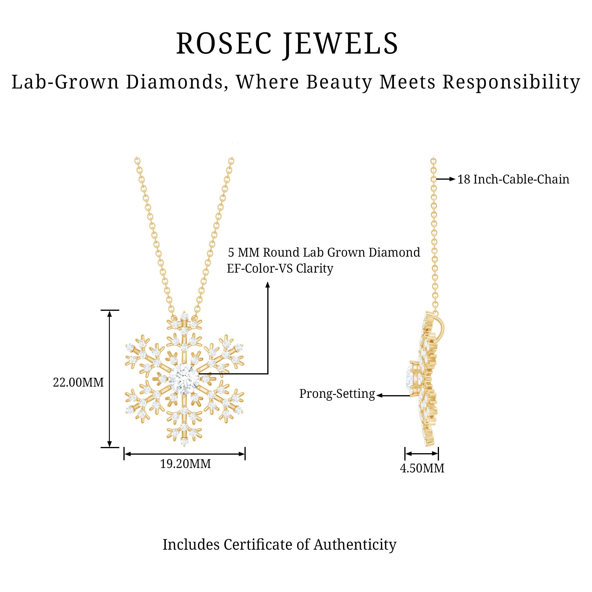 Looking for a statement pendant for her, Rosec Jewels got you this Diamond Snowflake Pendant. This beautiful pendant is curated with a classic snowflake metallic frame decorated with Round Shape lab grown Diamonds. The center stone of the pendant is a 5 MM Round Shape Diamond securely placed in the Prong Setting. This Winter Necklace perfectly depicts a perfect touch of nature. This Diamond Necklace will be perfect to celebrate Christmas and New Year with your lady love.
