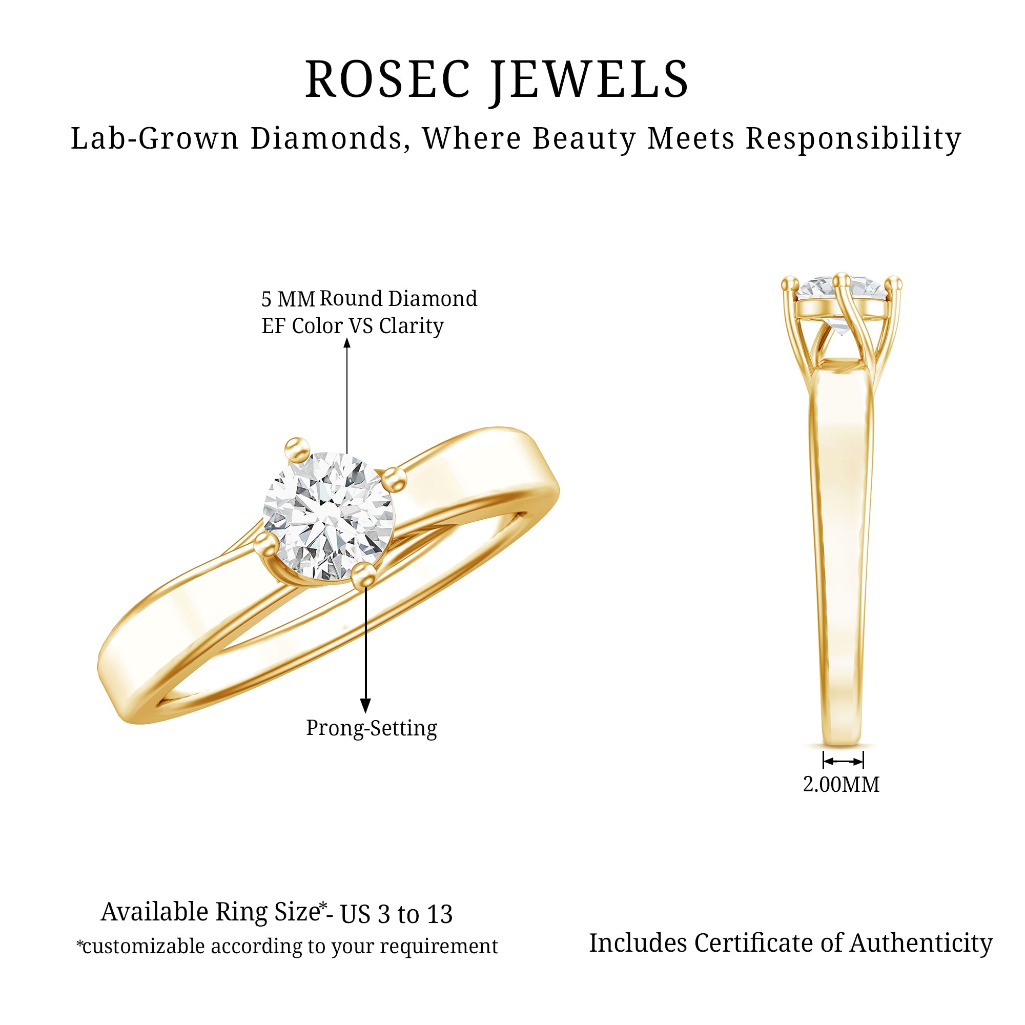Gemstone Quality:Lab - ( EF-VS ), Metal:14K Yellow Gold, Select Your Ring Size (US):4.5