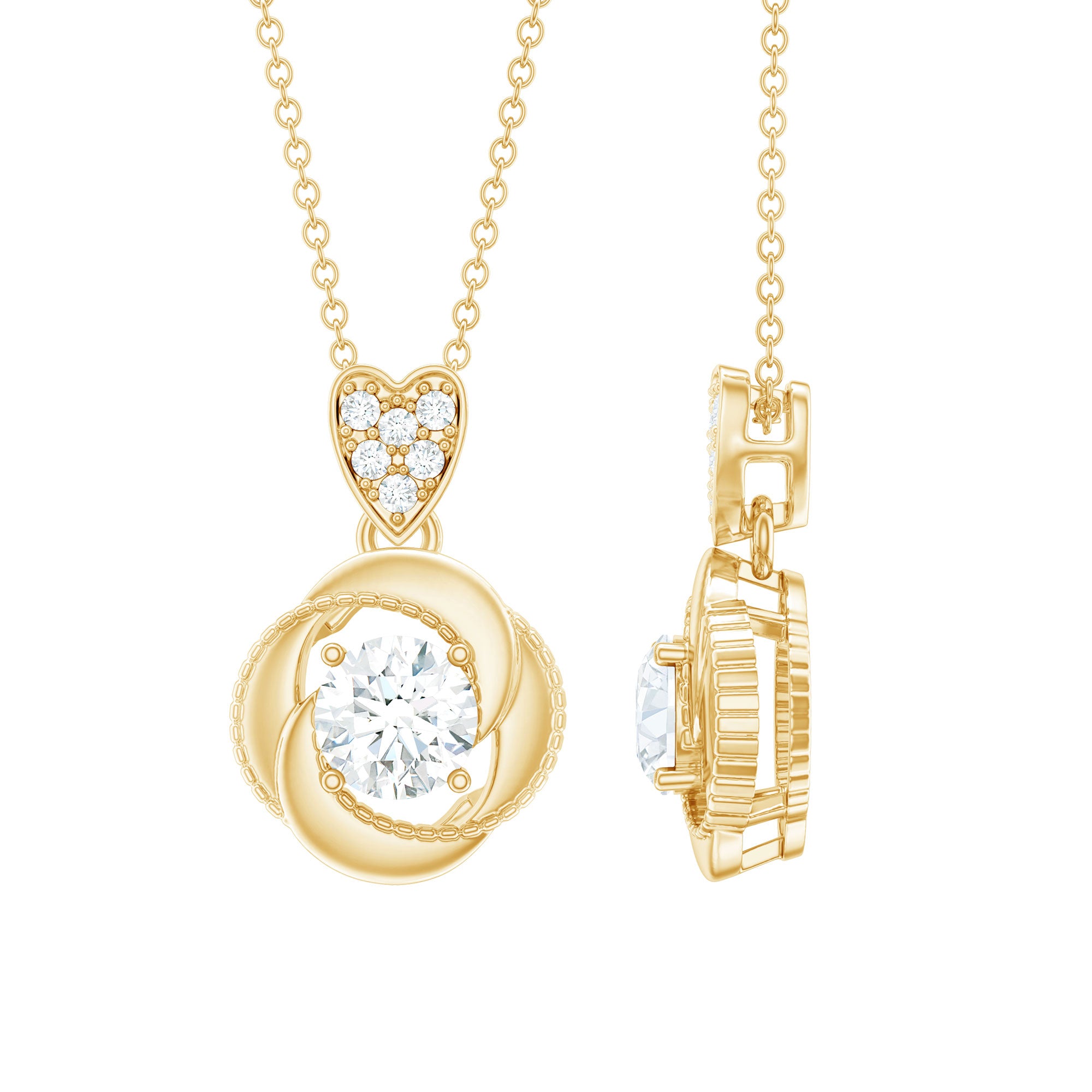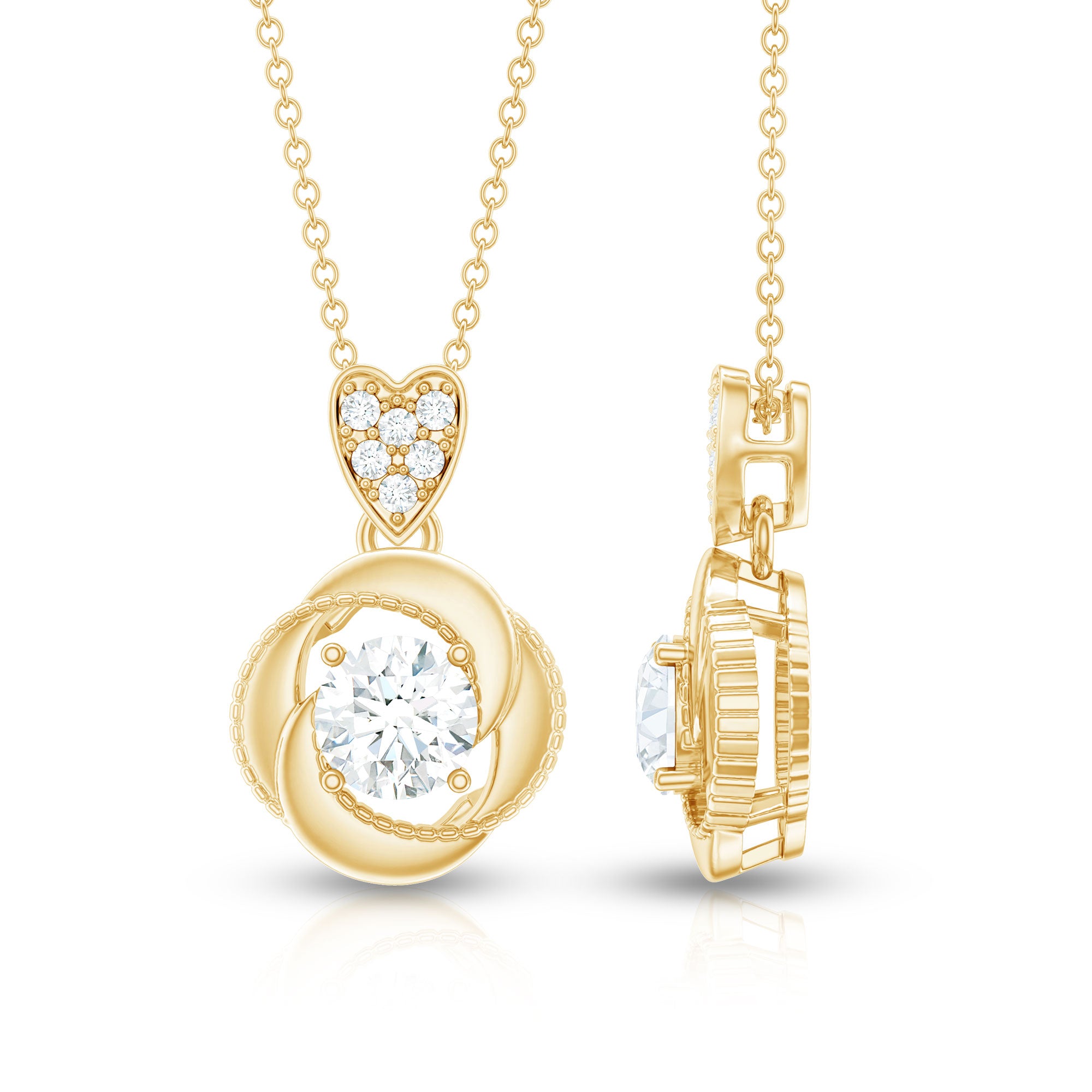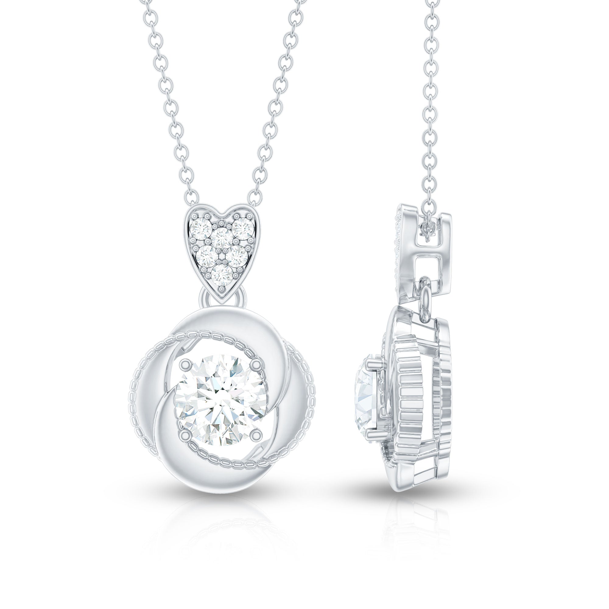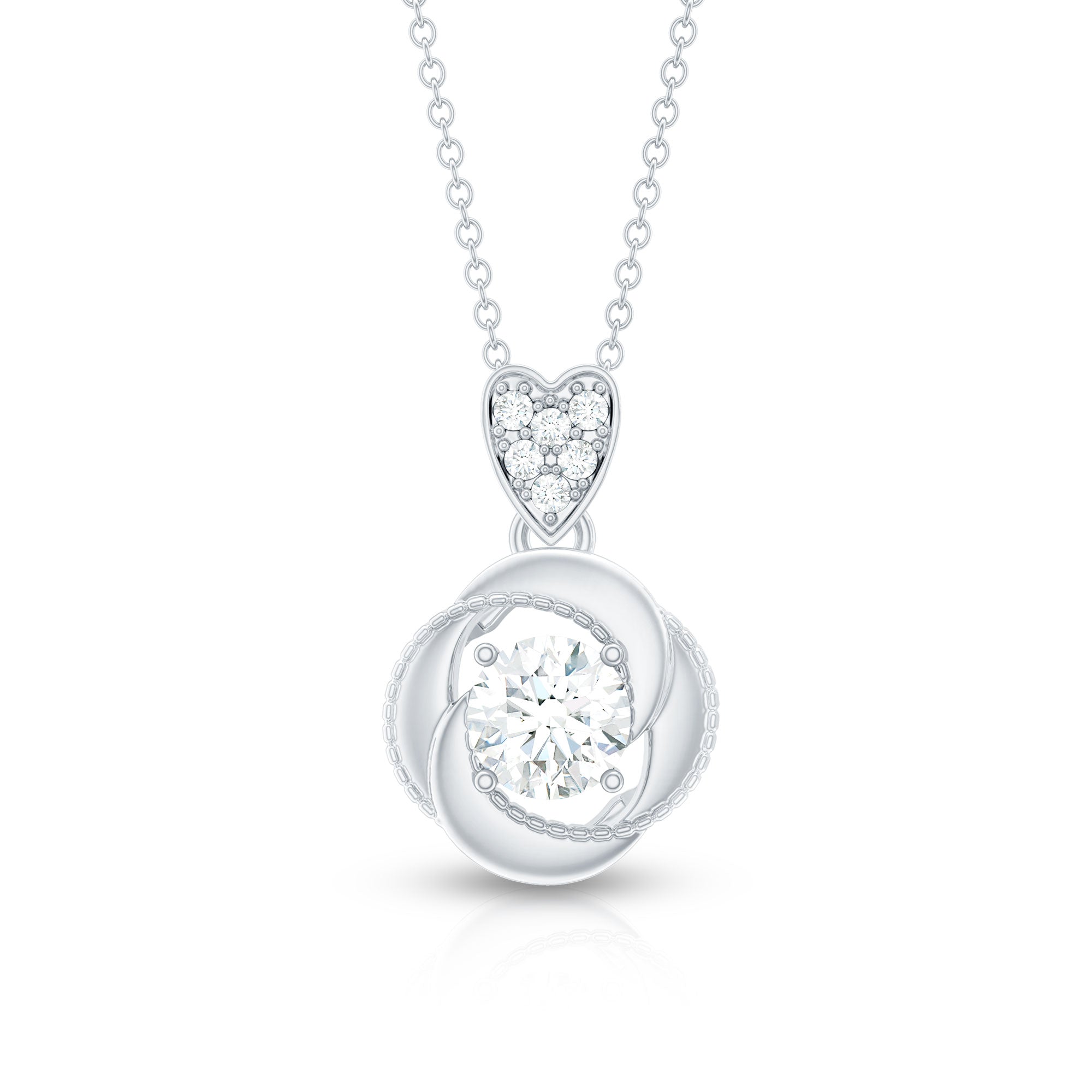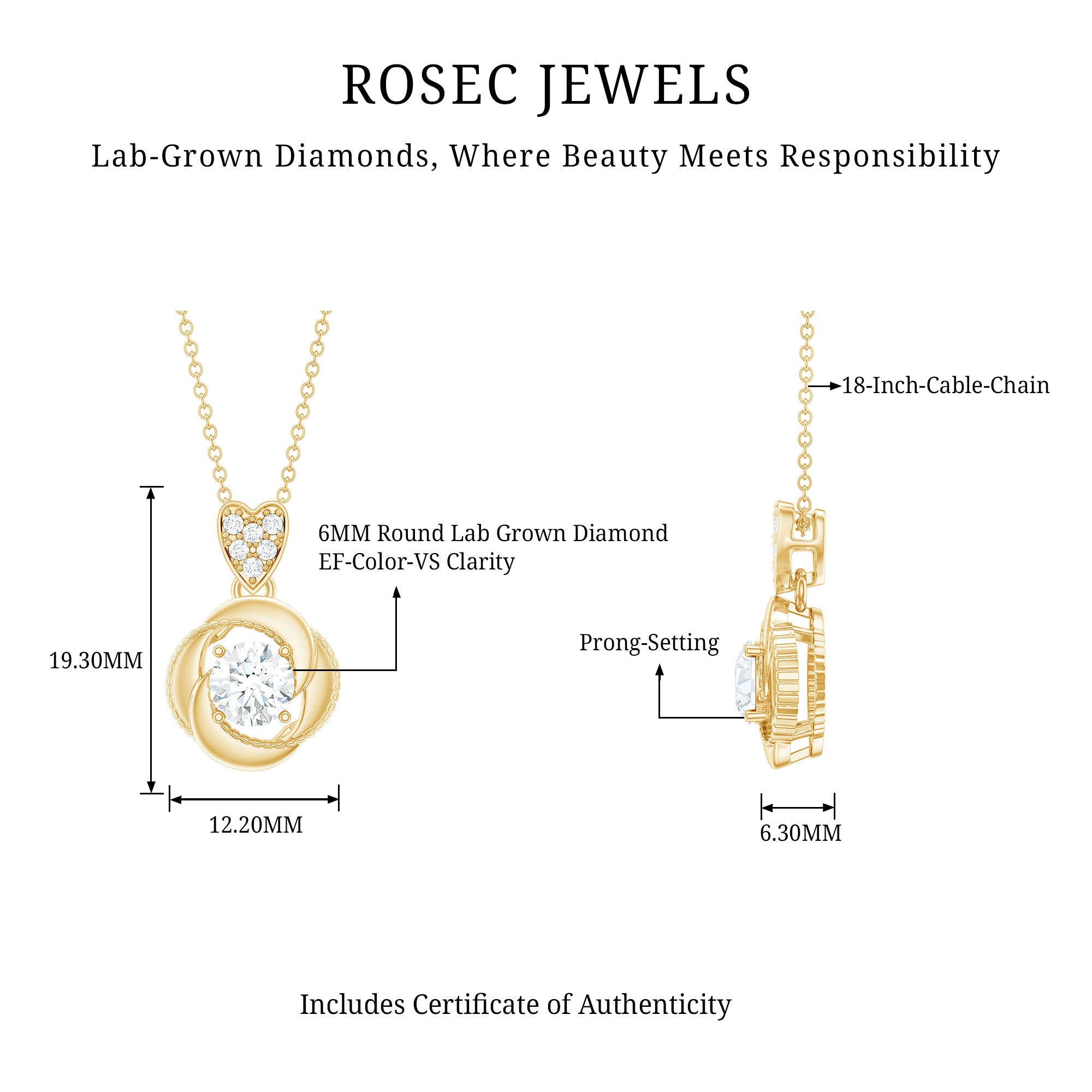 Looking for the perfect gift that will make her shine? This Diamond Solitaire Pendant got you covered. This Swirl Necklace features a 6 mm Round Shape Lab Grown Diamond, held in a safe prong setting in delicate swirl pattern that symbolizes eternal love. The Diamond Pendant Necklace is gracefully suspended from a heart motif, accentuated by dainty gemstones, adding a romantic touch to the overall allure. Our jewelry comes in a premium box that can later be used to store the jewelry when not in use also, available in various metal colors and purity options. Embrace ethical luxury with Rosec Jewels, synonymous with craftsmanship and innovation.