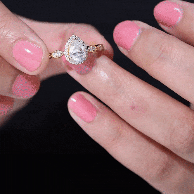 This Lab Created Diamond Engagement Ring elegantly merges vintage charm with contemporary sophistication, making it an ideal selection for a bride who desires a blend of classic allure and modern flair. At the heart of this Art Deco Ring lies a 6X8 MM pear cut diamond (lab-grown), securely set in prong setting and encircled by a halo of round cut lab created diamonds. The scalloped band, adorned with additional diamonds, enhances the overall beauty of this Teardrop Engagement Ring, creating a detailed texture that perfectly complements the brilliance of the diamonds. This Pear Cut Engagement Ring serves as a thoughtful and budget-friendly gift for your special someone. Crafted with ethically sourced, lab-grown gemstones, it provides the elegance of fine jewelry while being kind to the environment. Our skilled artisans have crafted this beautiful and Ethical Diamond Ring to elevate your special occasions and guarantee it stays a treasured item for many years. Featuring exquisite detail, this unique ring with a low-profile base perfectly combines comfort and versatility.