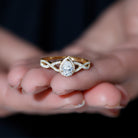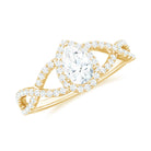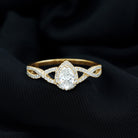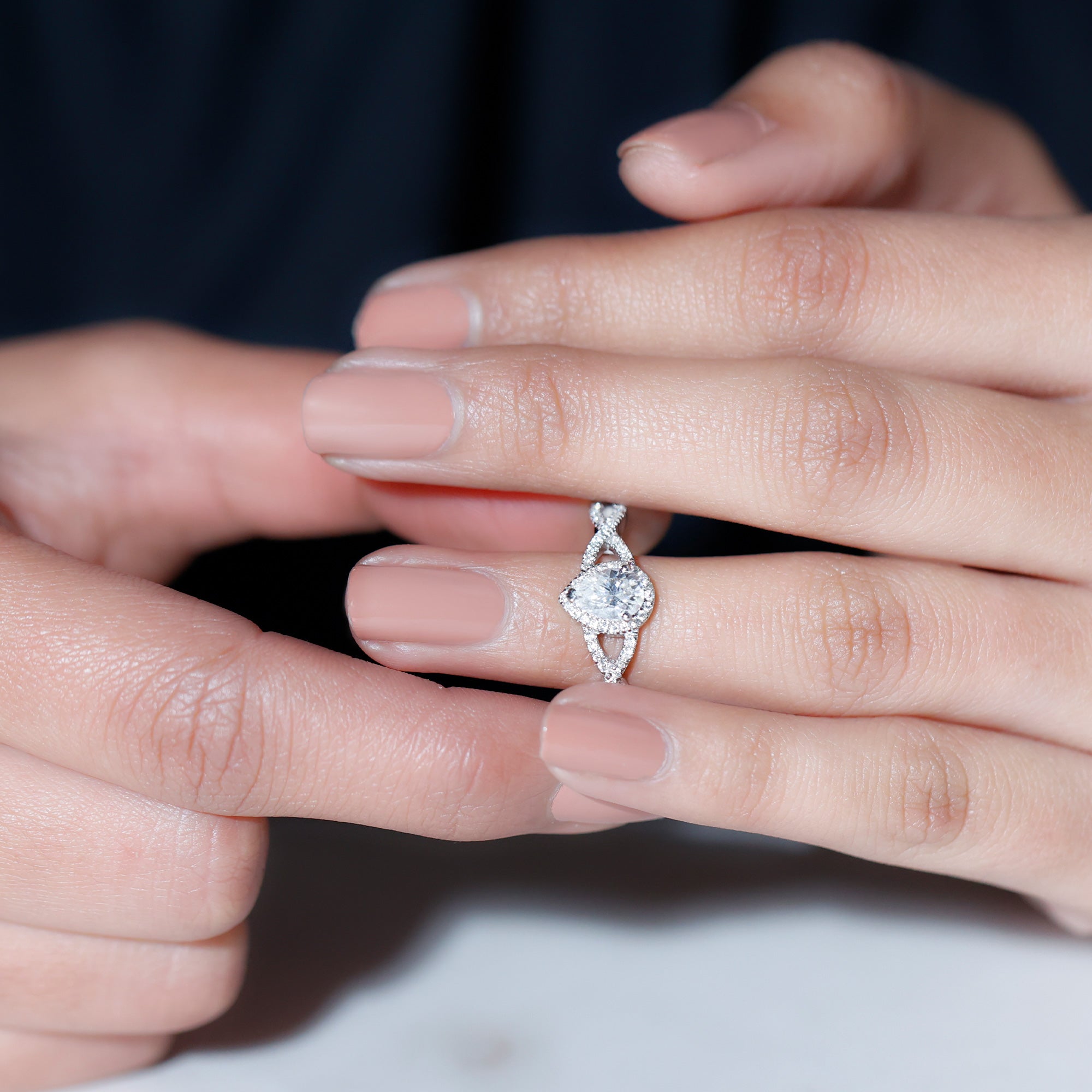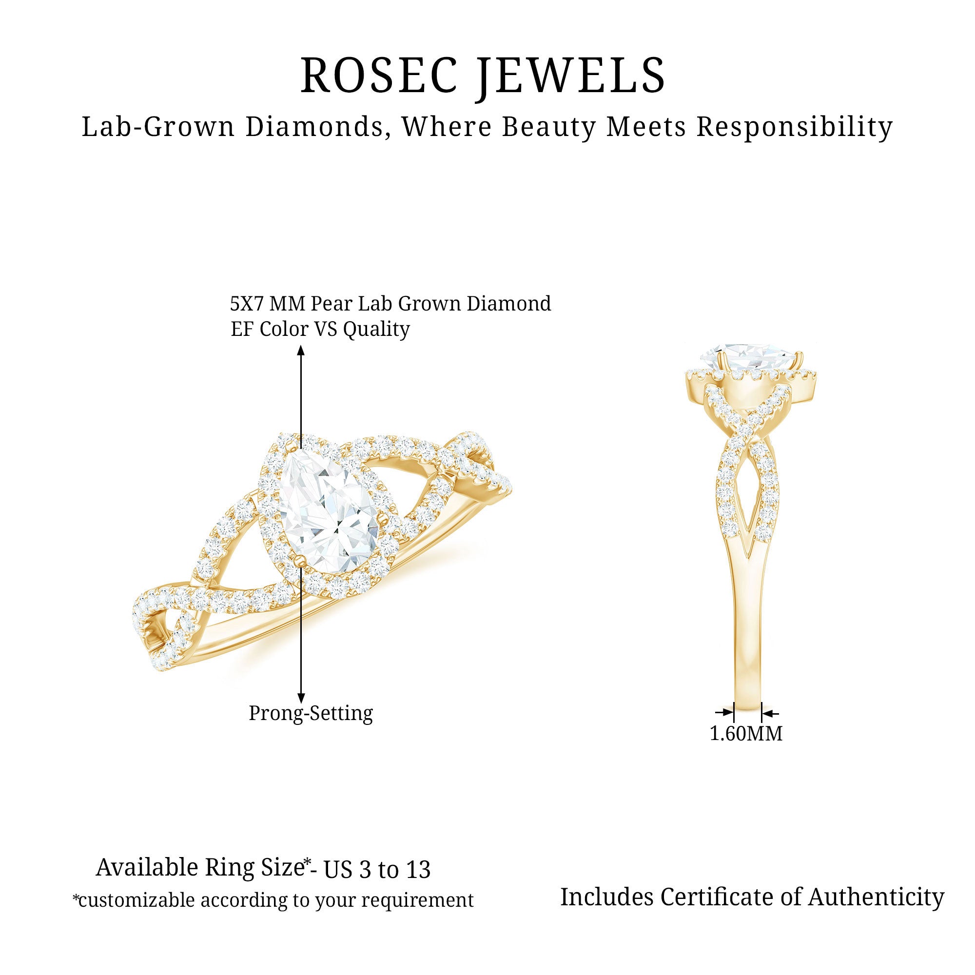 Introducing this stunning Diamond Engagement Ring, a beautiful combination of classic elegance and modern appeal. The band of this Halo Ring features two strands that intertwine beautifully to create a criss-cross effect, adorned with glittering round-cut diamonds. This playful design draws the eye to a central 5X7 MM pear shaped EF-VS quality diamond, cradled in a secure 3 prong setting and surrounded by a stunning halo of round cut dainty gemstones. Charming and stylish, this Crossover Ring symbolizes enduring love and showcases refined taste. This Teardrop Engagement Ring is a thoughtful and affordable present for your loved one. Made with ethically sourced, lab grown gemstones, it offers the luxury of fine jewelry while being environmentally friendly.