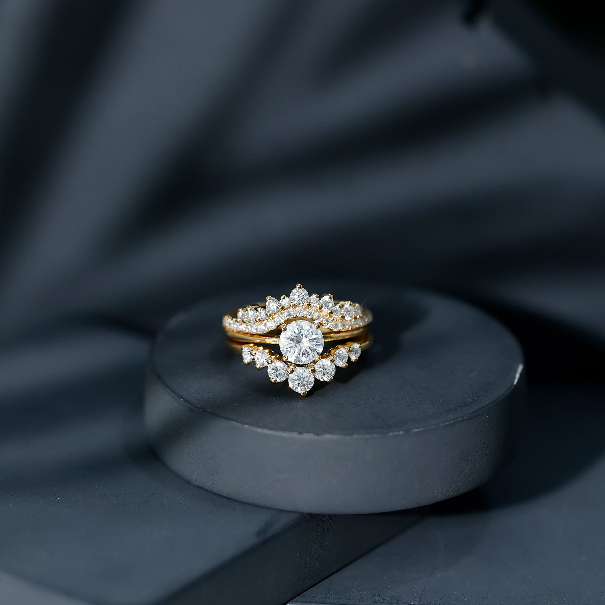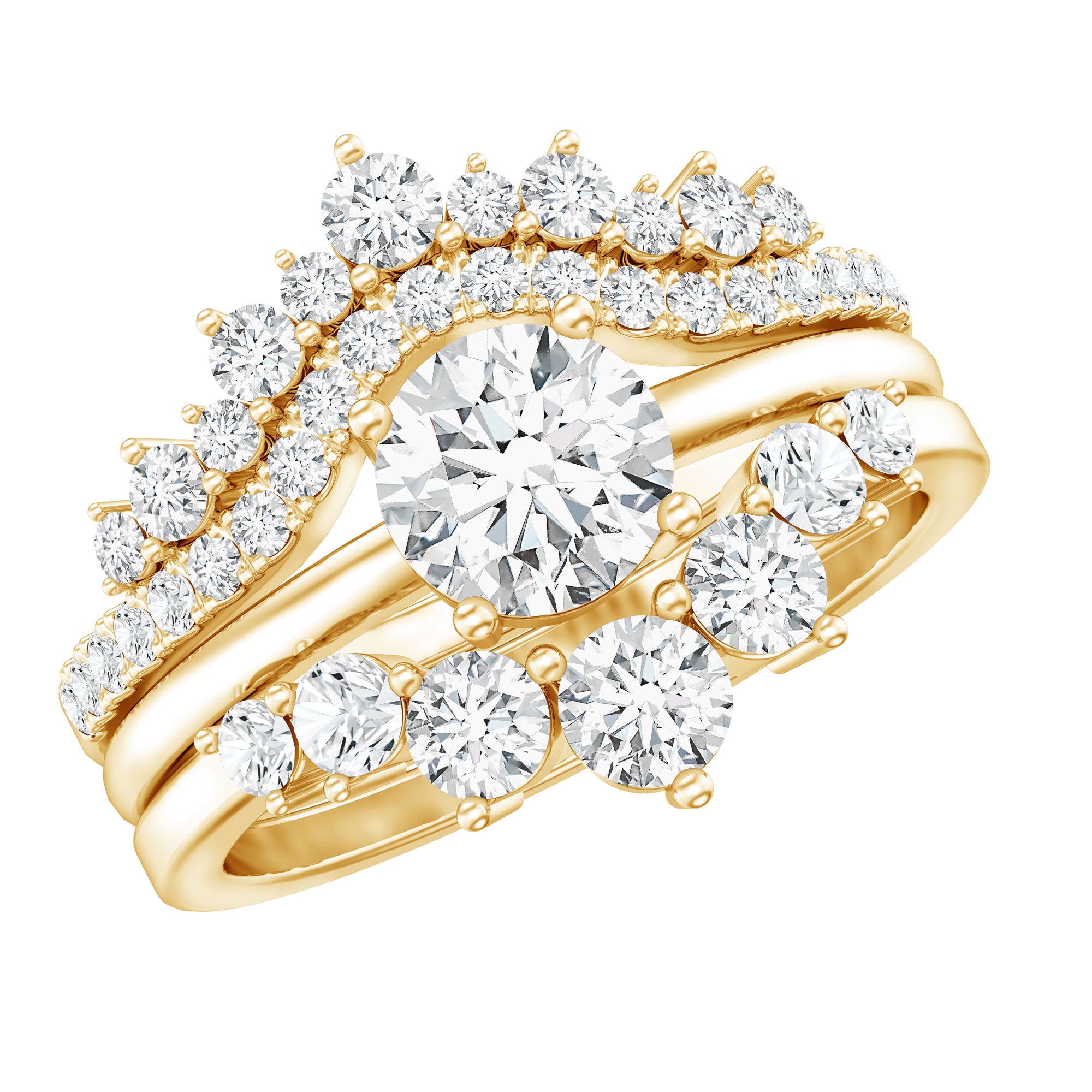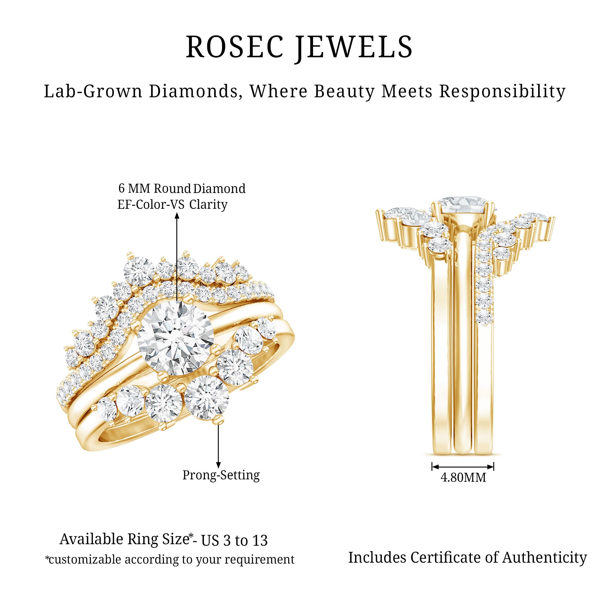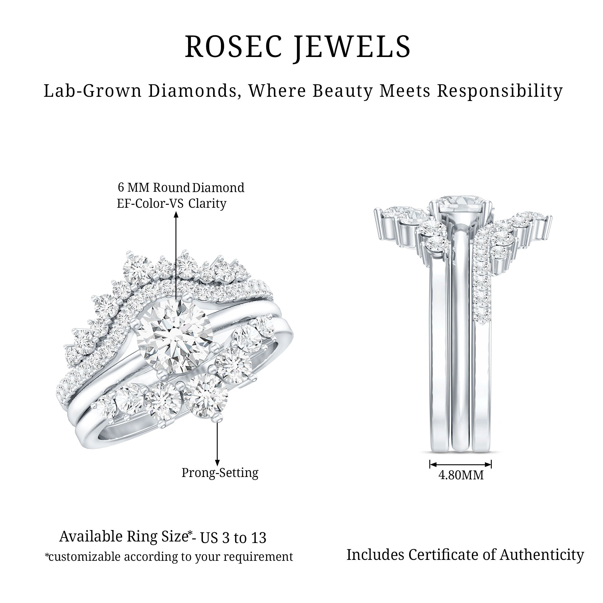 Add that unforgettable sparkle to your special moment with this stunning Lab Grown Diamond Wedding Set, designed to grab attention and win your heart. This 3 Piece Wedding Ring Set for Her provides a unified look that enhances its beauty through its overall design. The center ring showcases a 6 MM Round Shaped Lab Grown Diamond set in Prong Setting, acting as a dazzling solitaire on a simple metal band. The two stackable bands boost its charm from being simple and classic to bold, highlighting unity and balance that represent the journey, contributing to a rich and seamless appearance. The two curved enhancers, embellished with round cut diamonds, give this Bridal Ring Set a complete look, beautifully framing the center ring so that anyone would love to admire it. Feel the royal vibe of a queen with this Trio Wedding Ring Set, which harmonizes with each other as a symbol of promise and everlasting love. Each ring perfectly complements the others design, making this Engagement Ring and Wedding Band Set a versatile piece of jewelry that you can wear separately for a casual style or stack them together for a striking look.