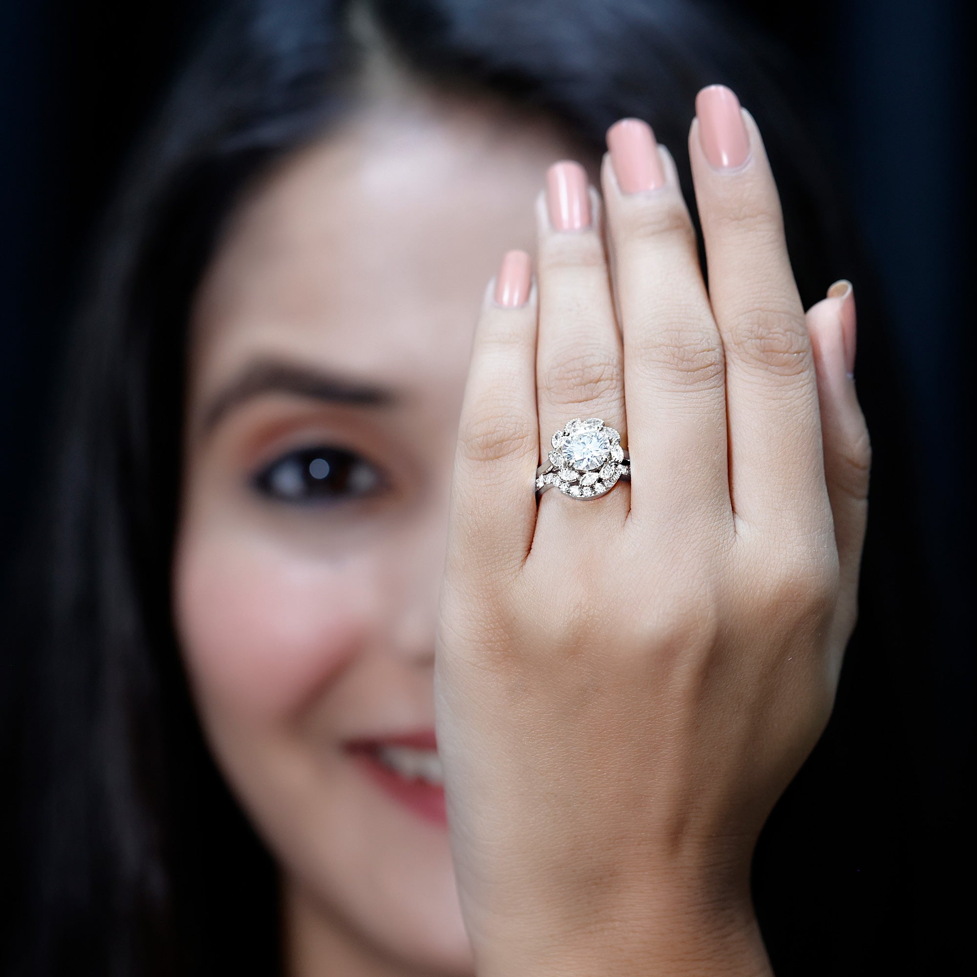 Why settle for an ordinary Diamond Ring Set when you can have this masterpiece, a perfect blend of vintage and modern charm - at its center sits an 8 MM round cut EF-VS quality diamond (lab grown) held in secure prong setting. Highlighting the center stone is a classic halo, curated with marquise shaped diamond stones set in beaded bezel setting that is sure to catch everyones eye. The matching ring guard perfectly compliments the design and creates this Wedding Ring Set a piece of versatile jewelry as you can wear them separately for an everyday style or stack them together for a statement look. Also, a diamond is an April birthstone, symbolizing everlasting love, strength, and wealth, making this Halo Engagement Ring with Wedding Band a meaningful and thoughtful accessory in your jewelry collection.