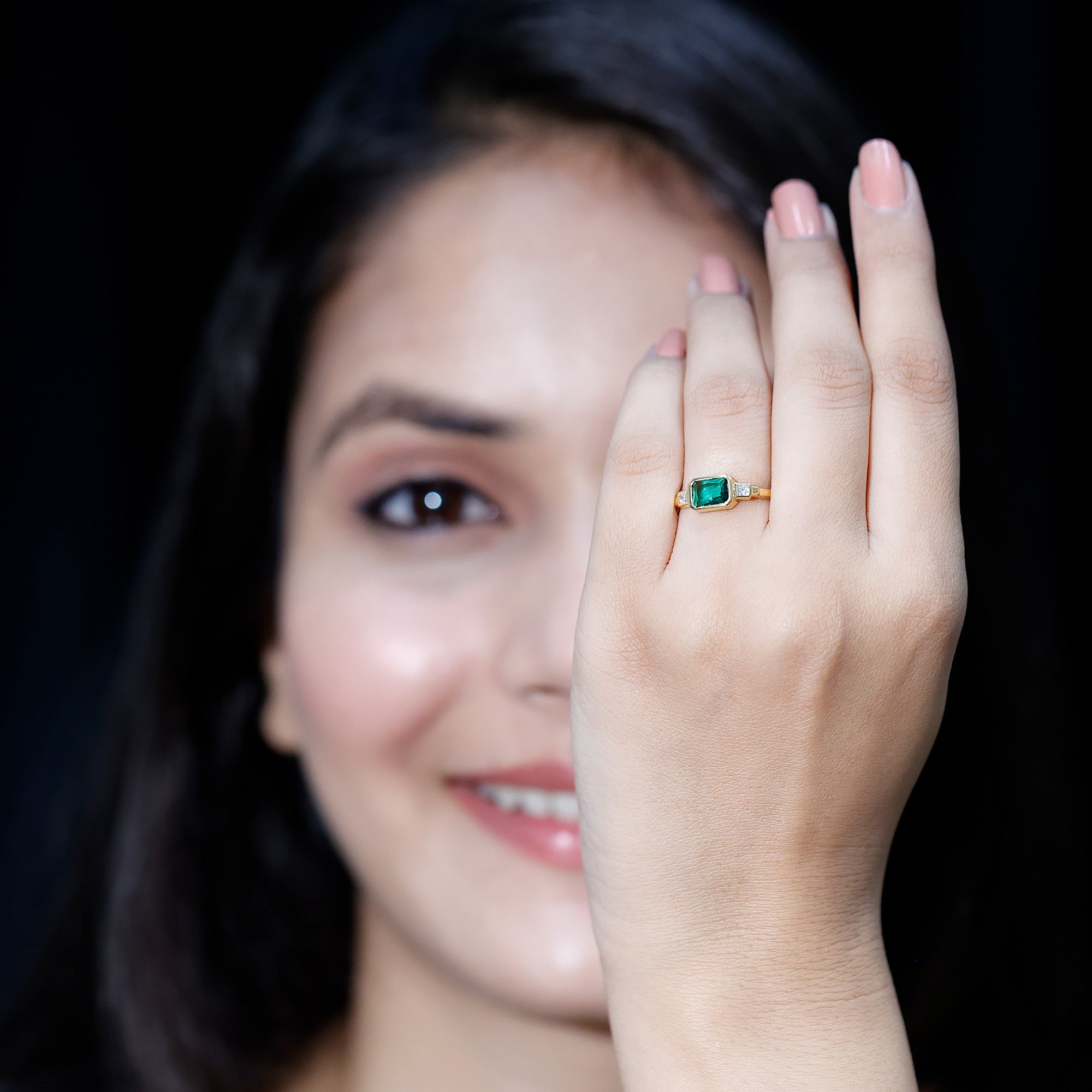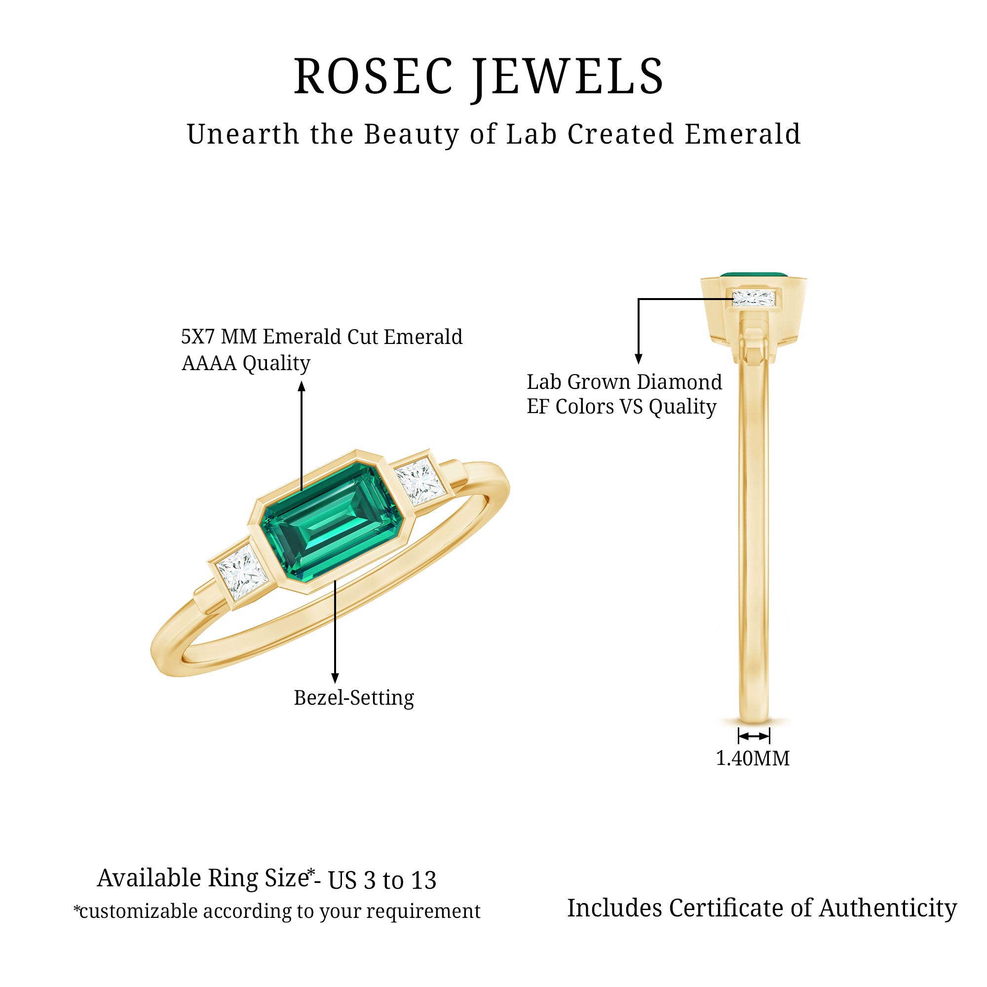 Put a twist on tradition with this captivating East West Emerald Cut Ring, a modern take on elegance and romance. Designed to be as unforgettable as your love story, this exquisite Promise Engagement Ring showcases a vibrant 5X7 MM emerald cut lab grown emerald, placed horizontally in an East-West style, a stylish detail that sets it apart from the ordinary. Flanking the emerald on each side are princess cut lab-grown diamonds, adding a graceful touch of sparkle and balance to the design. All three gemstones are securely set in bezel setting, and the ring is handcrafted in 14K Yellow Gold Plated Silver, offering a refined, smooth finish that not only enhances durability but also modern appeal. This Emerald and Diamond Ring does not just sparkle - it tells a story. Perfectly blending timeless sophistication with contemporary flair, this Emerald Promise Ring is more than just a beautiful accessory, it is a heartfelt gesture. Whether you are marking a special milestone like a proposal, anniversary, birthday, or simply expressing your admiration for a loved one, this Green Emerald Ring makes a thoughtful and luxurious gift. Expertly crafted with precision and care, it embodies the quality and craftsmanship Rosec Jewels is known for. Its unique east-west design gives it an eye-catching presence, while its deep symbolism makes it a meaningful piece she will treasure forever.